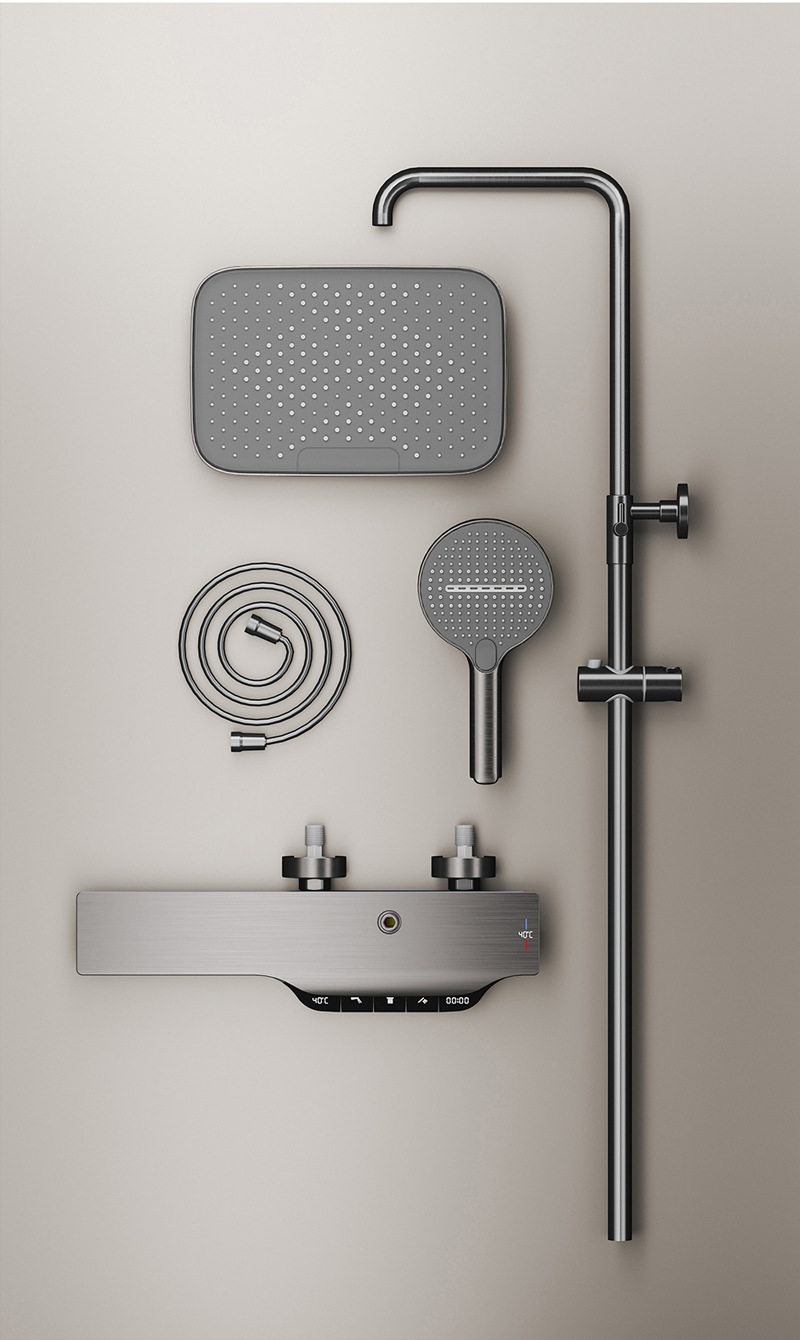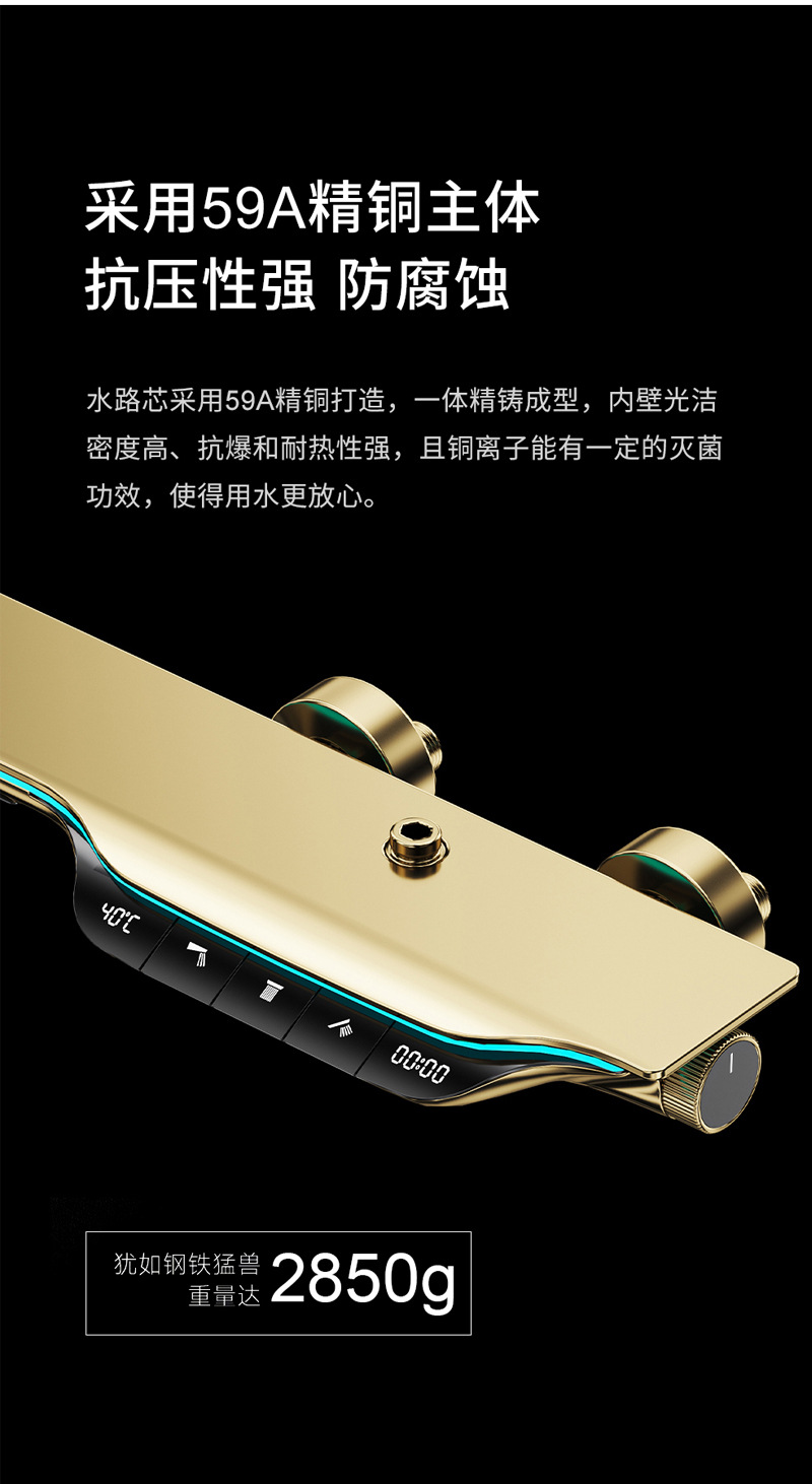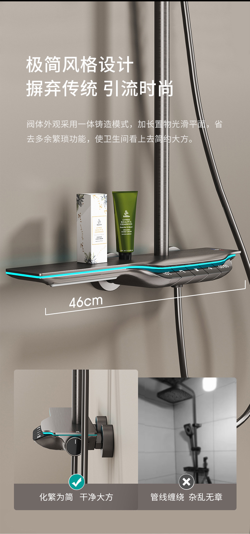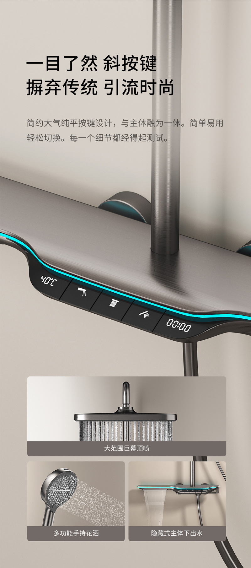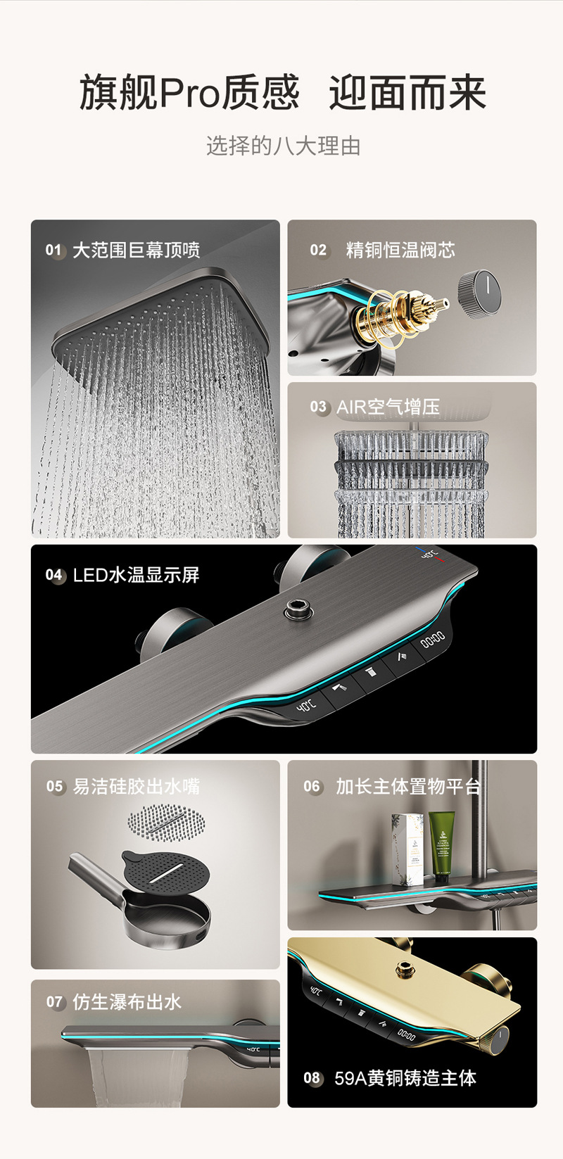 총 회색 피아노 저장 랙 샤워 세트 황동 다기능 디지털 디스플레이 필드 샤워 우유 흰색 온도 조절 샤워