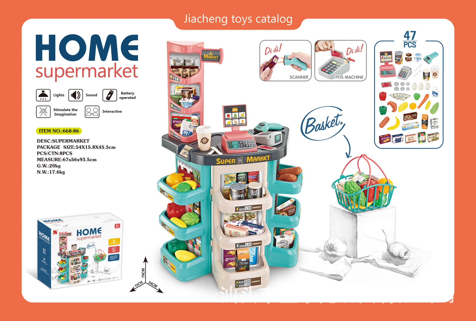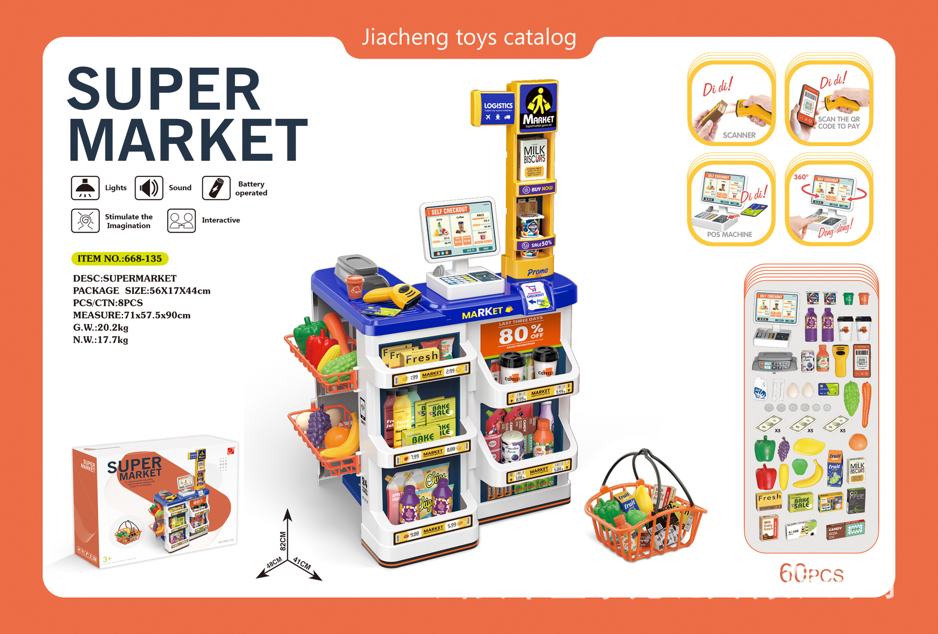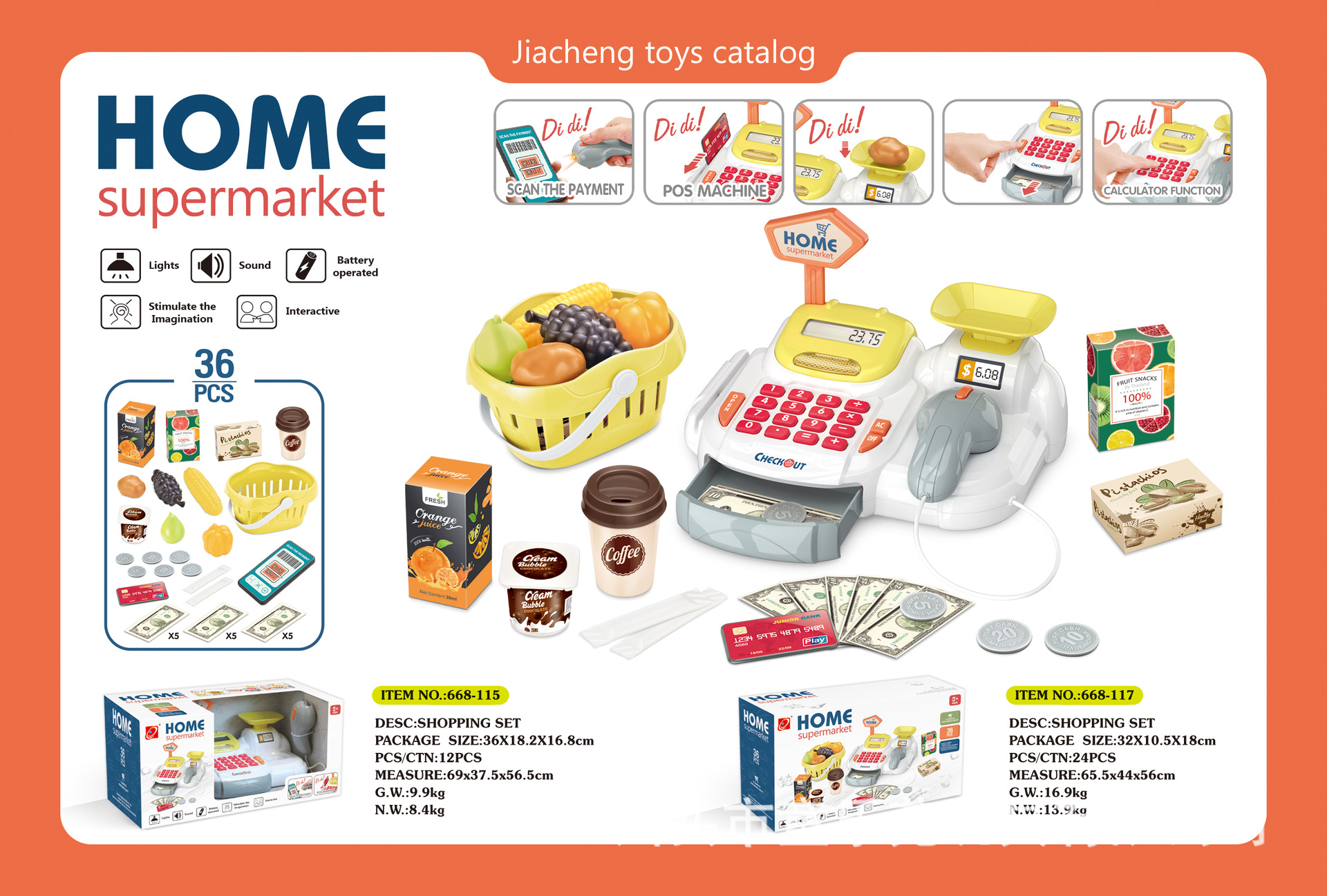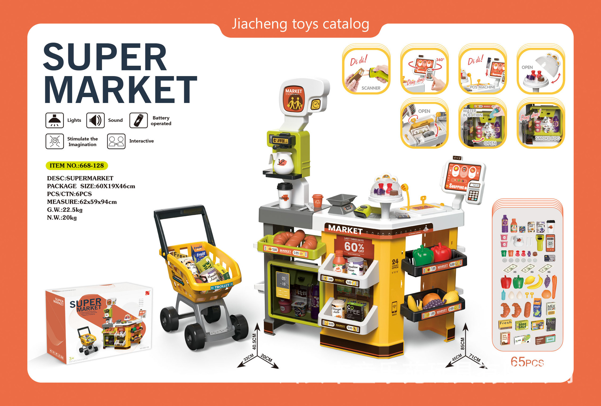 • 668-128 럭셔리 슈퍼마켓 콤보 세트 + 장바구니 + 충전 스캐너, 금전 등록기, 냉장고 스프레이