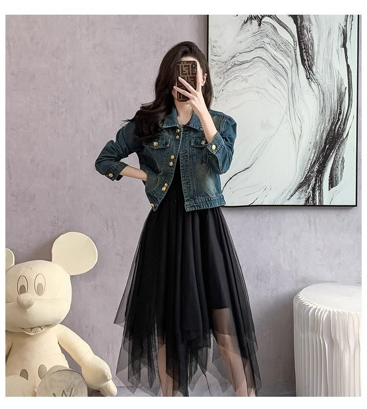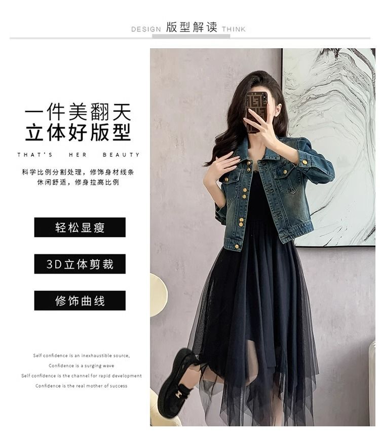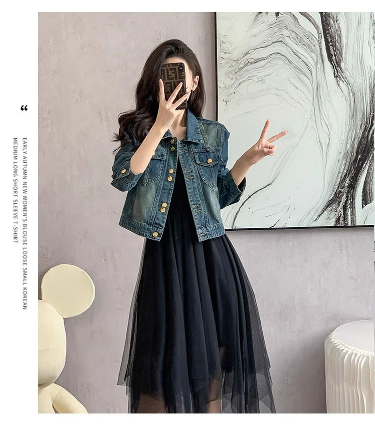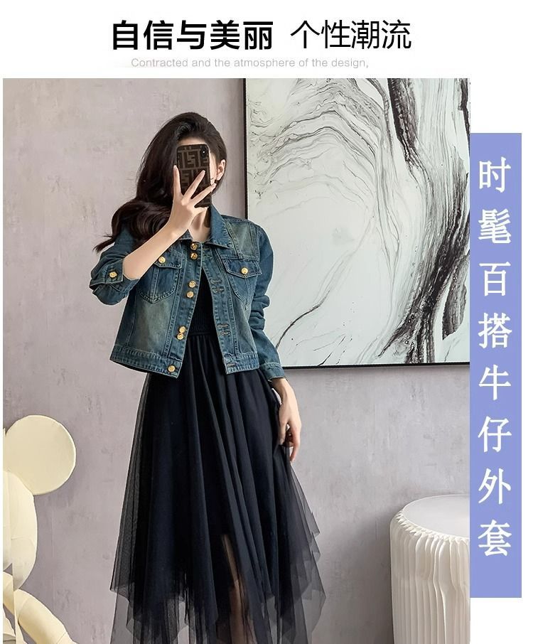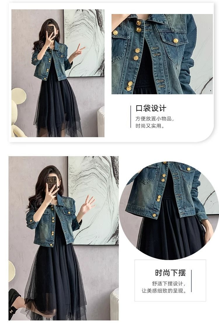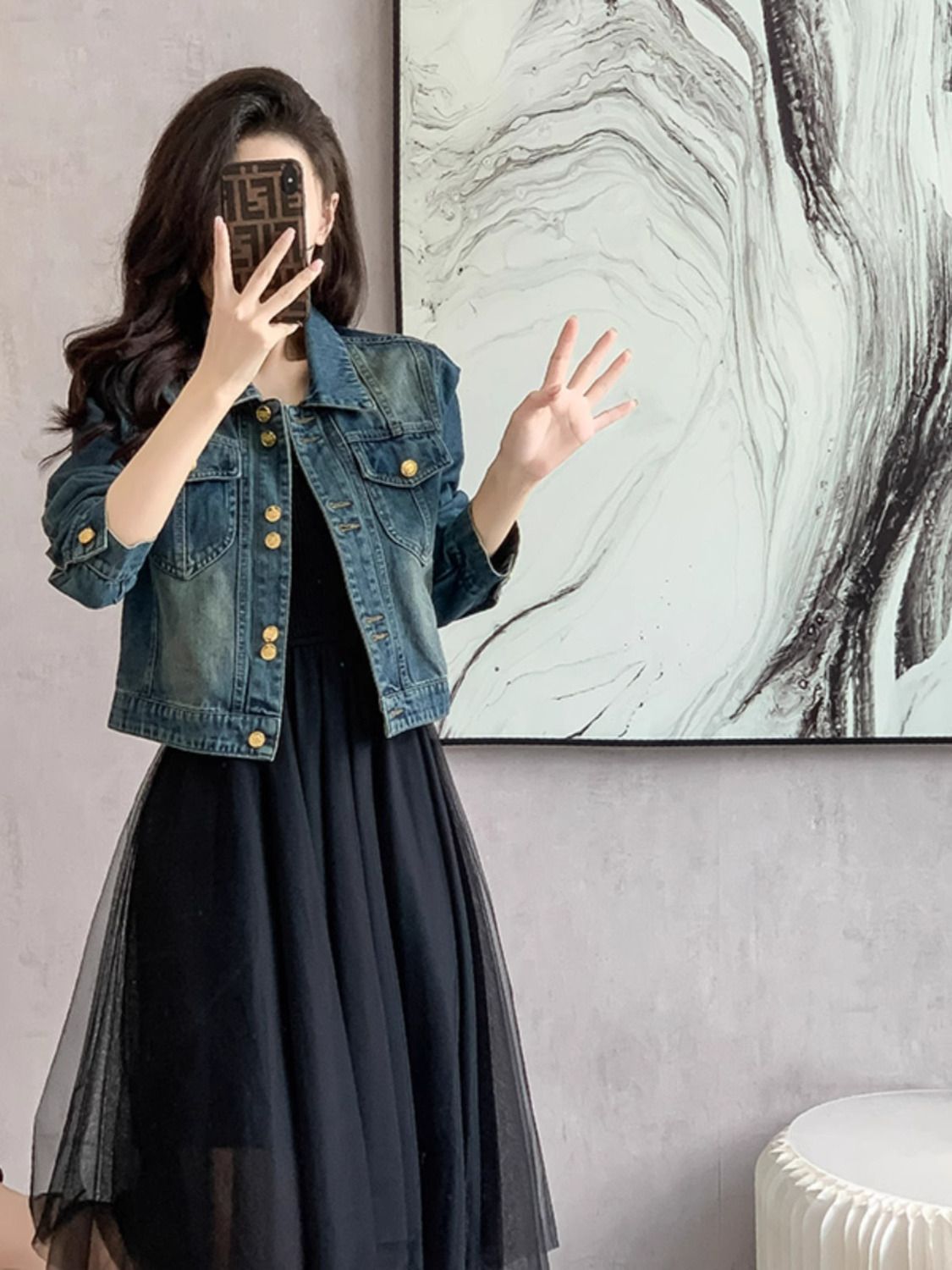 빈티지 슬림 핏 데님 쇼트 재킷 여자 가을 2024 새로운 도착 POLO 칼라 올 매치 긴팔 짧은 재킷 트렌디 탑