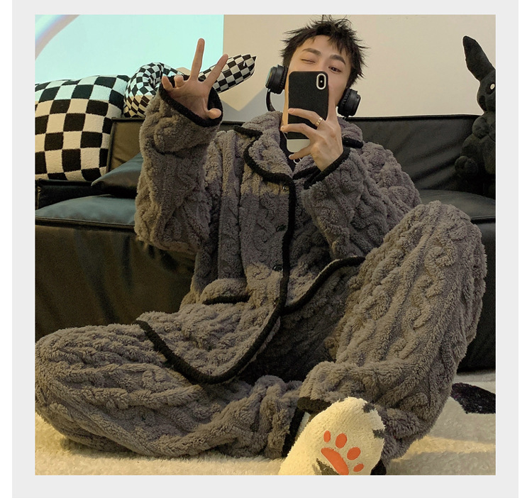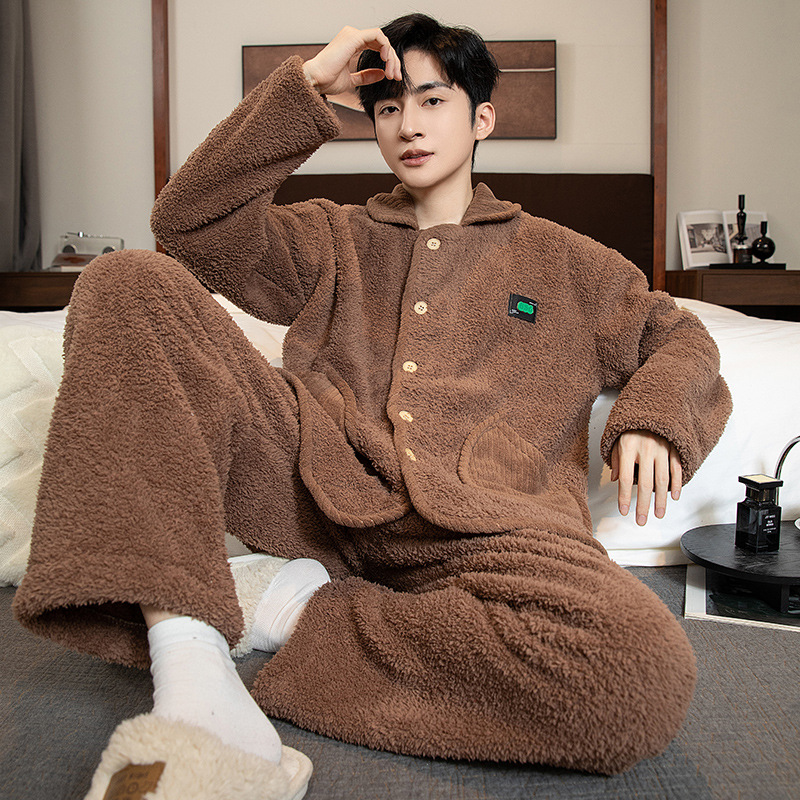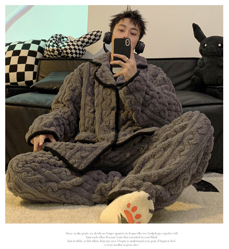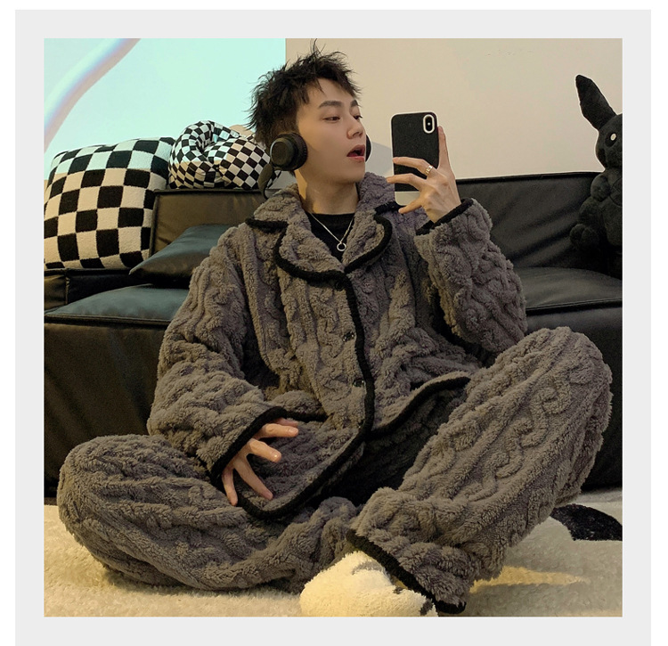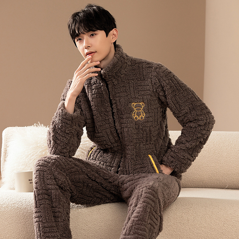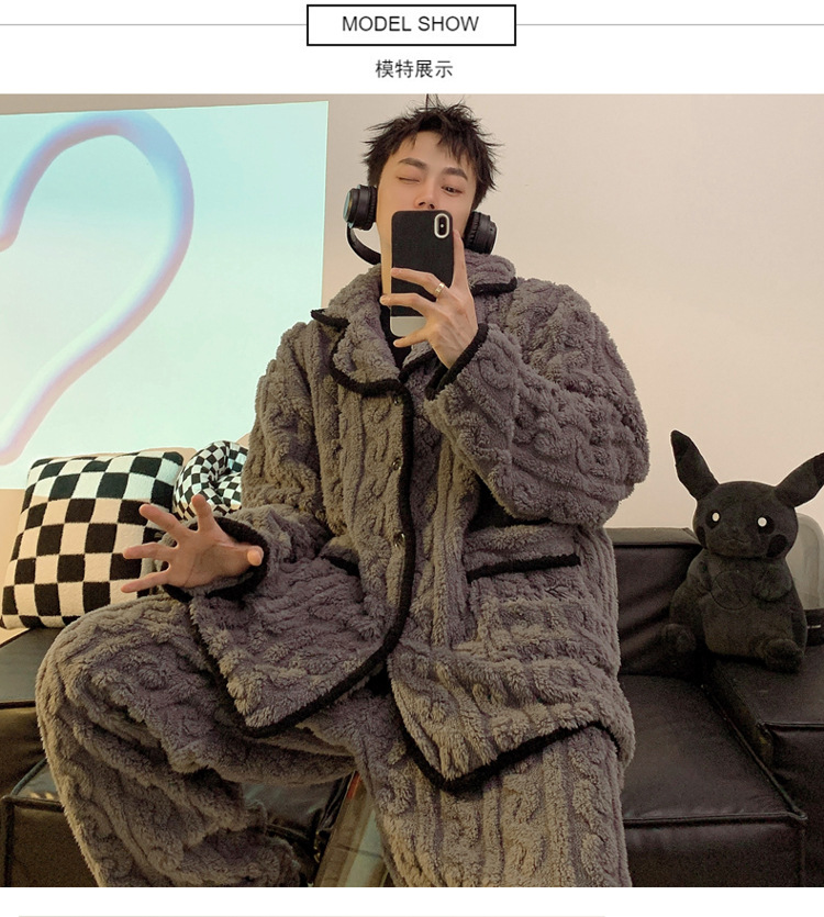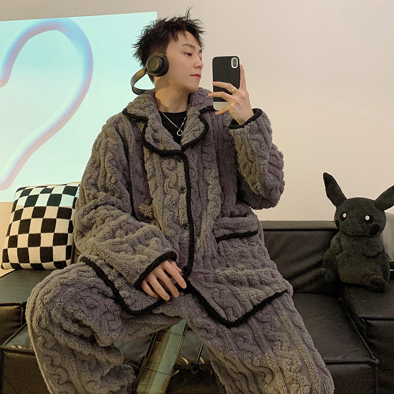 남성용 잠옷 가을 겨울 두꺼운 코랄 벨벳 플러스 벨벳 청소년용 플란넬 남성 홈웨어 세트스토어 가기