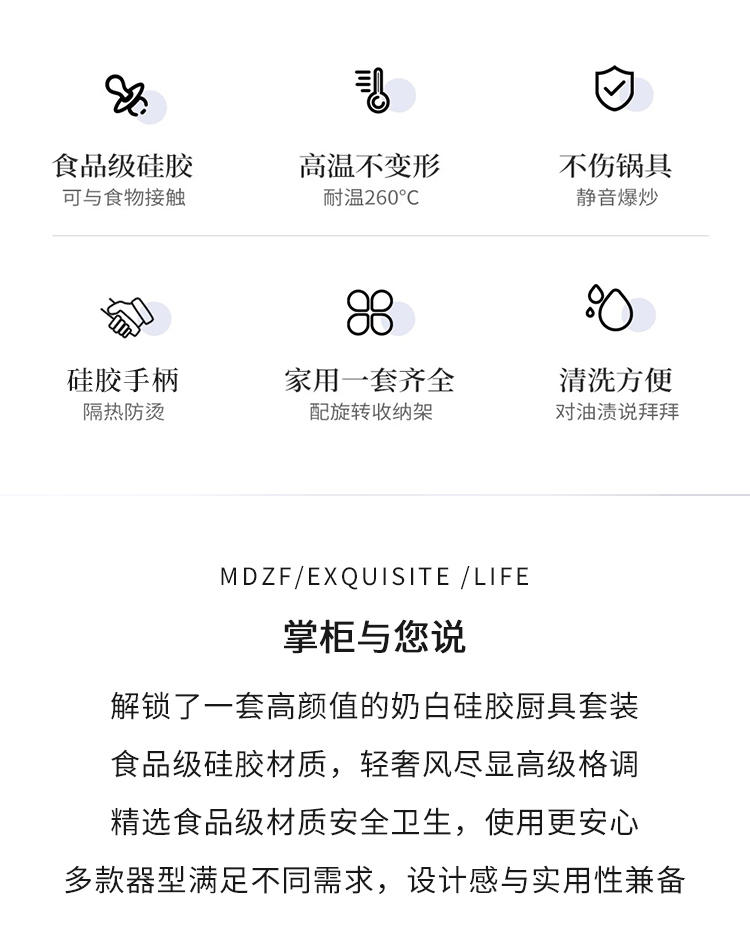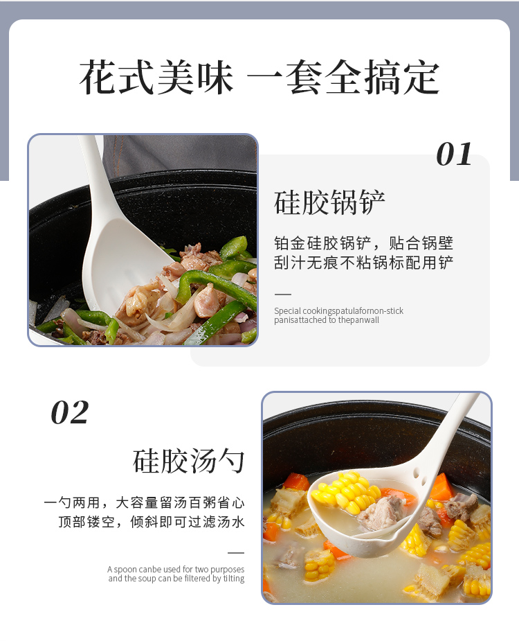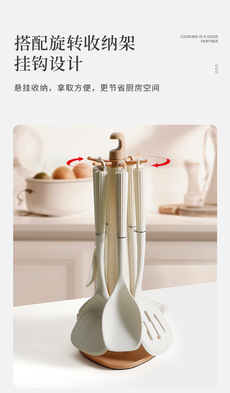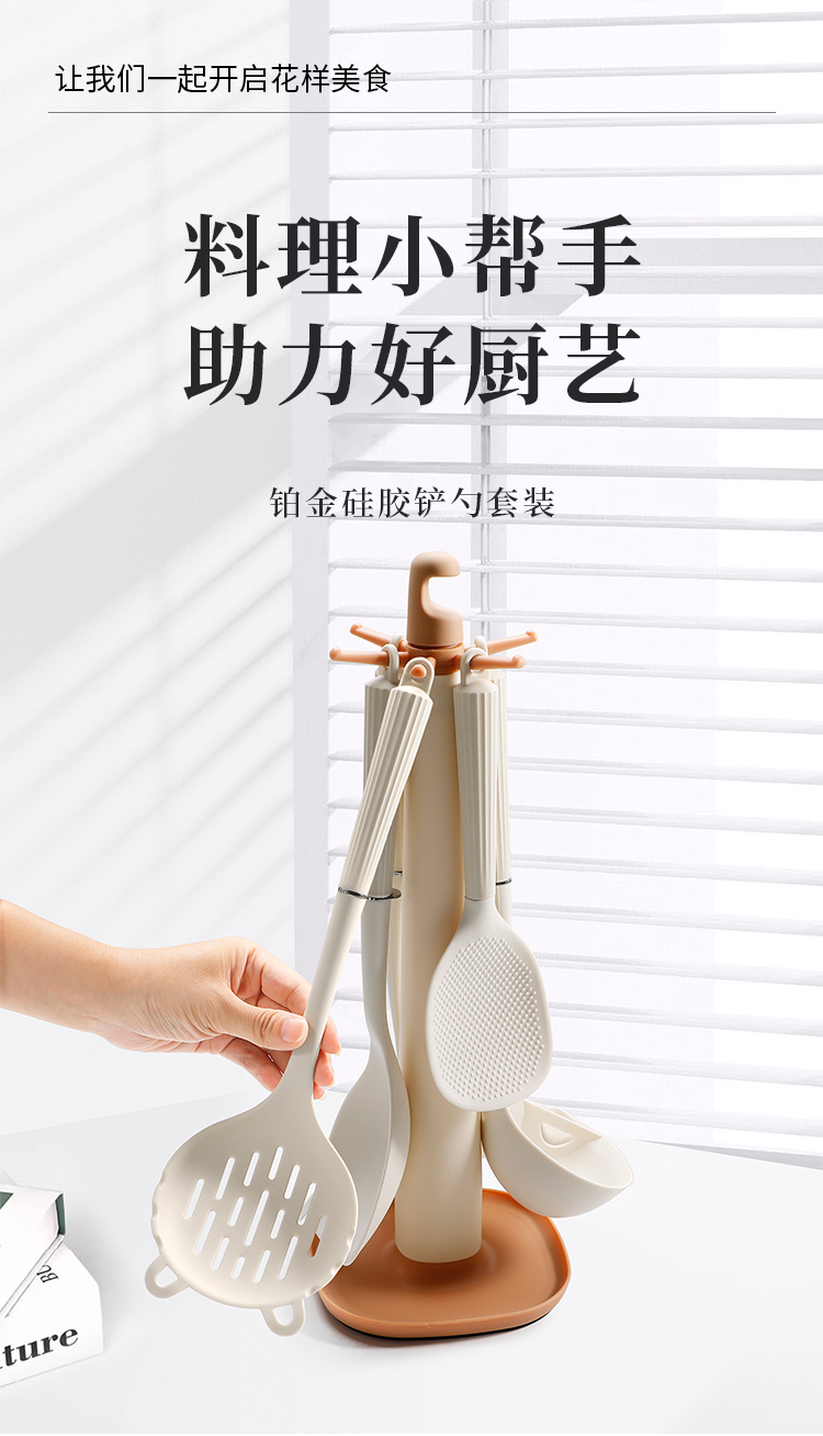 • 7종 세트 (다기능 주걱 + 수프 스푼 + 소쿠리 + 밥 스푼 + 튀김 주걱 + 실리콘 클립 + 스탠드)