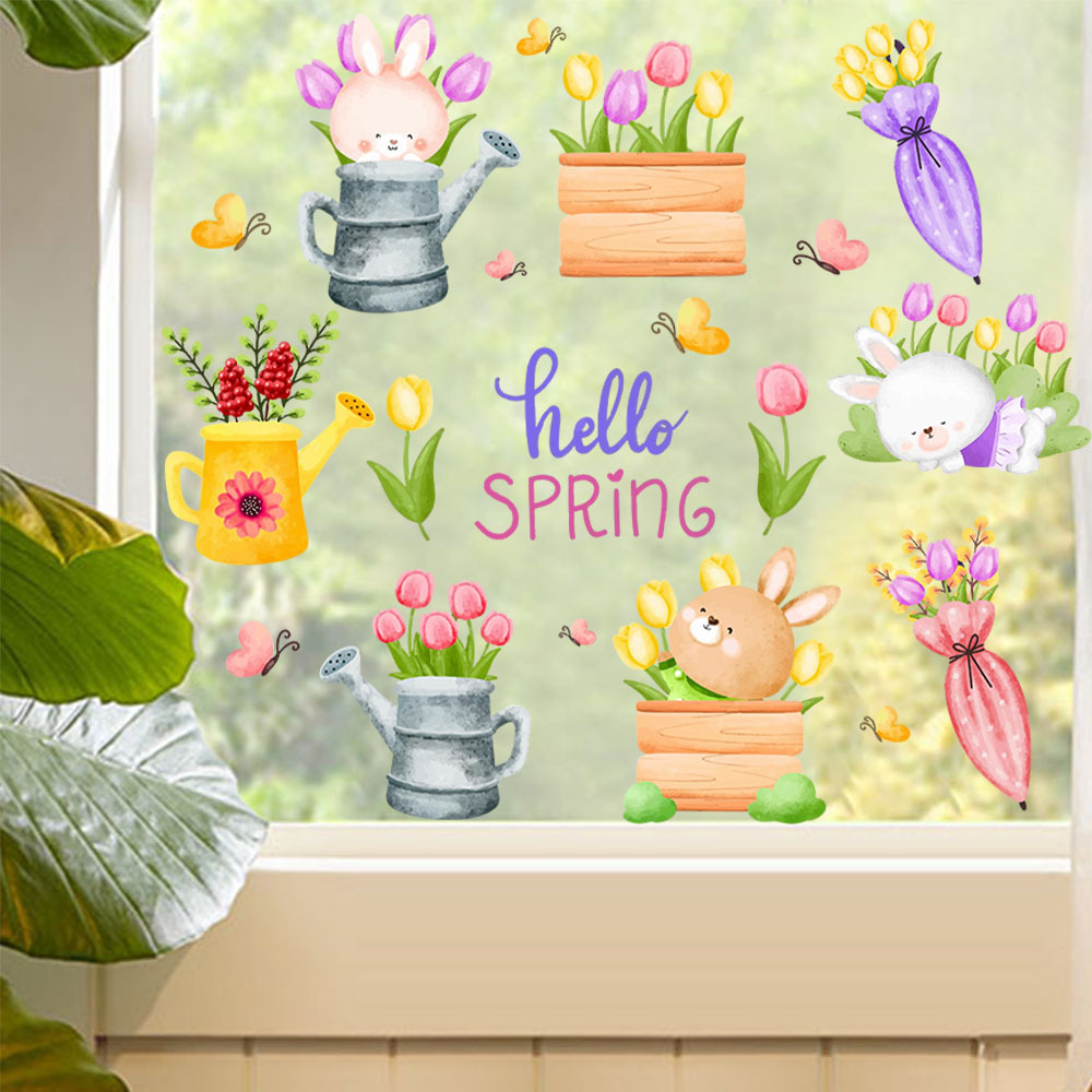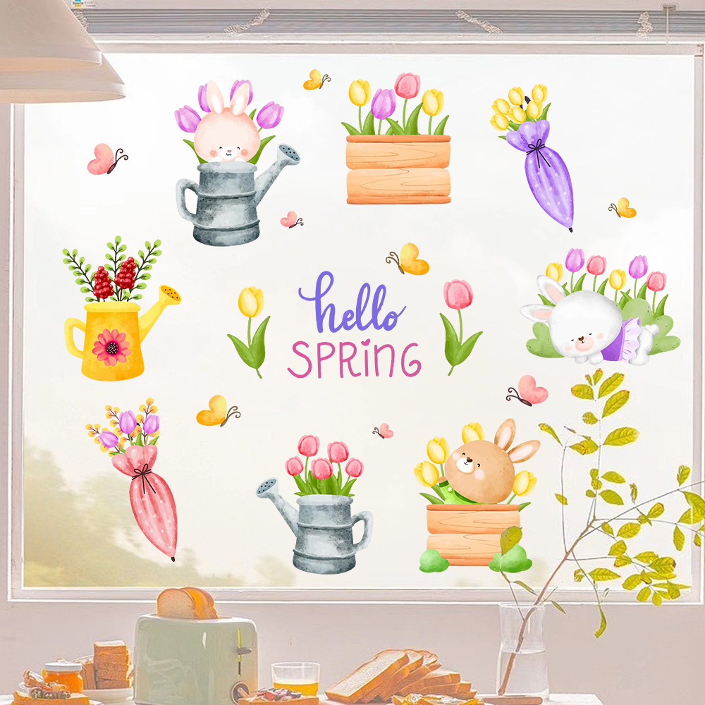 Yiyao JD3428 봄 만화 토끼 튤립 영어 창 스티커 문 및 창 배경 미화 접착제가없는 정전기 스티커스토어 가기