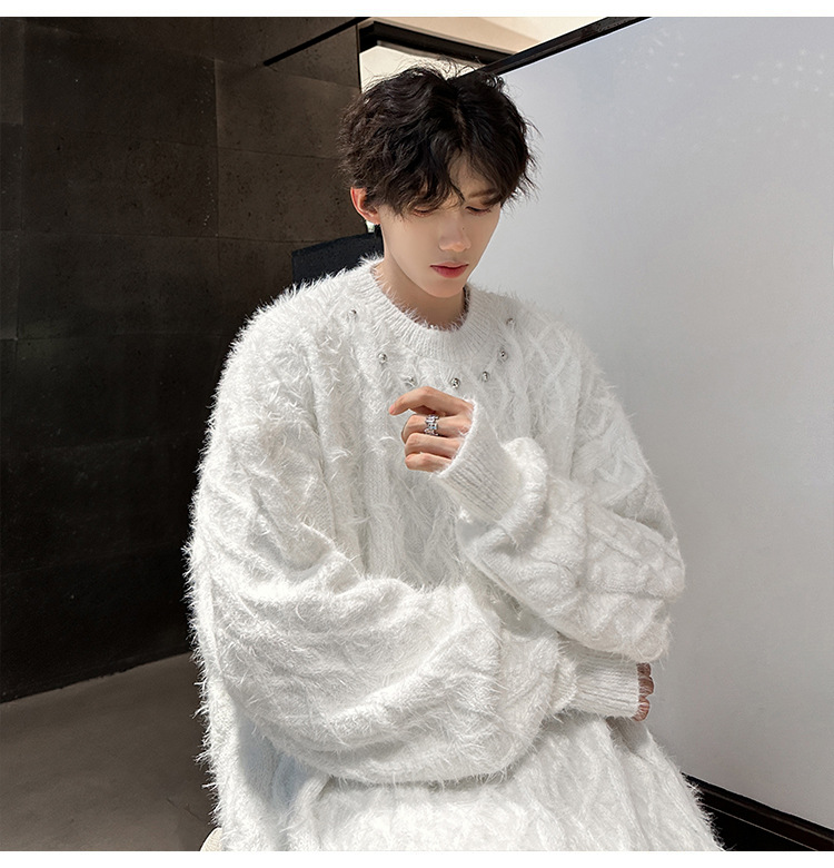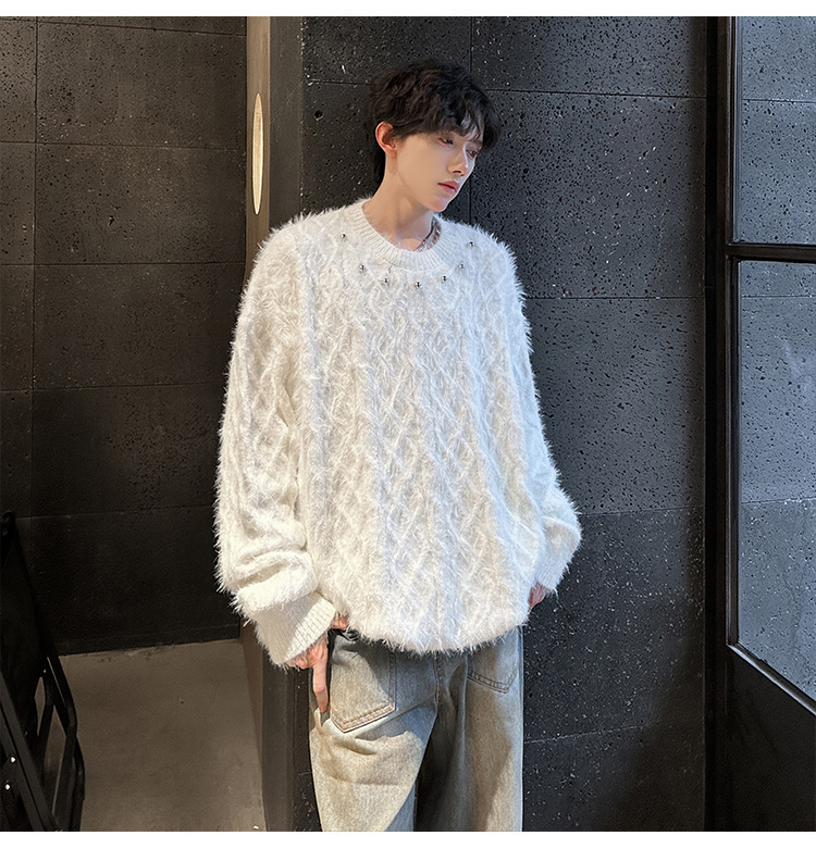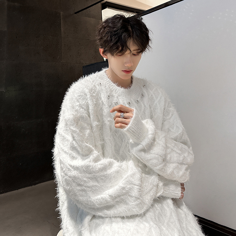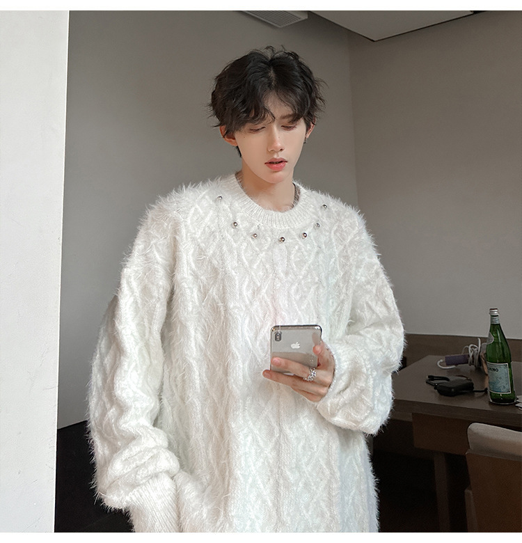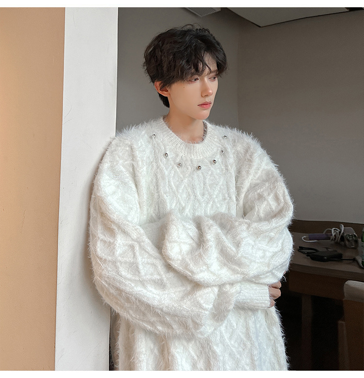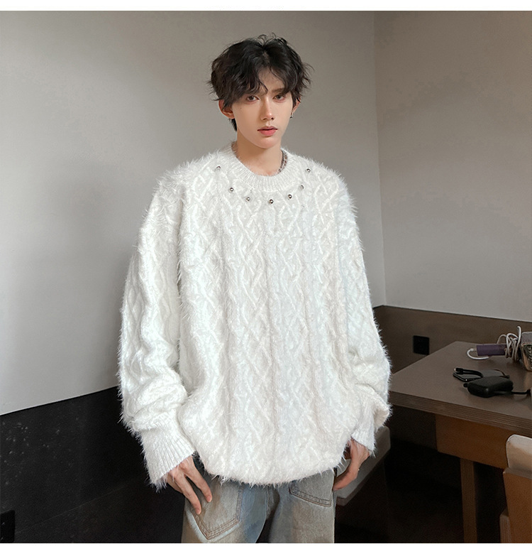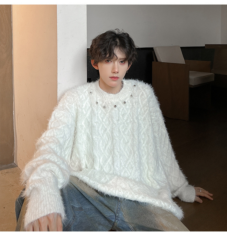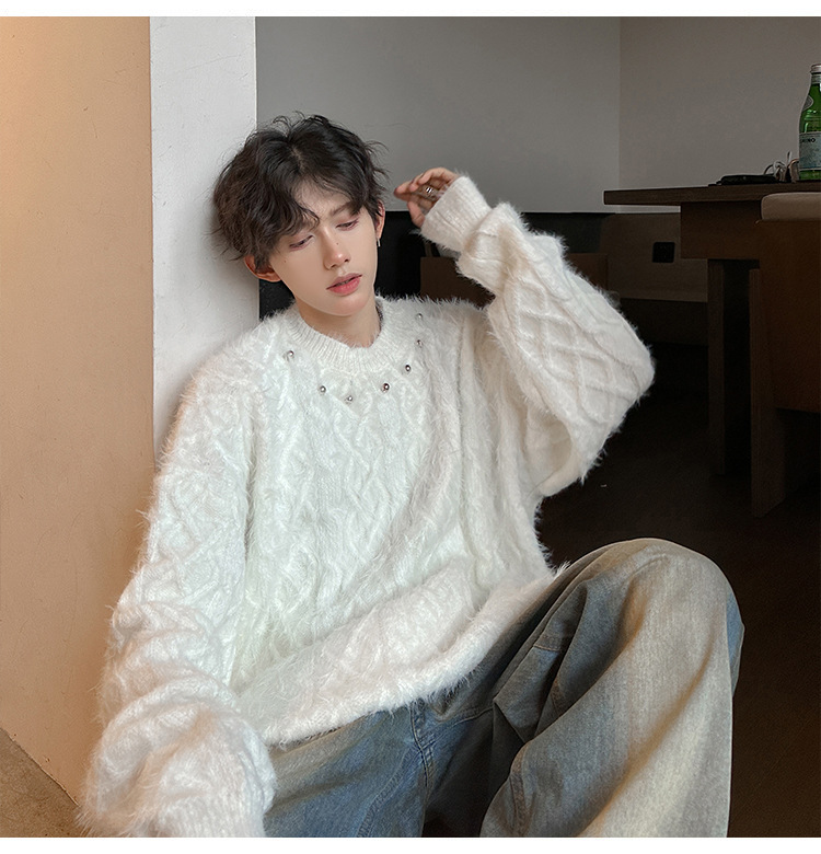 미국 레트로 화이트 스웨터 남자 2024 가을과 겨울 새로운 패션 브랜드 느슨한 게으른 스타일 봉제 스웨터 재킷