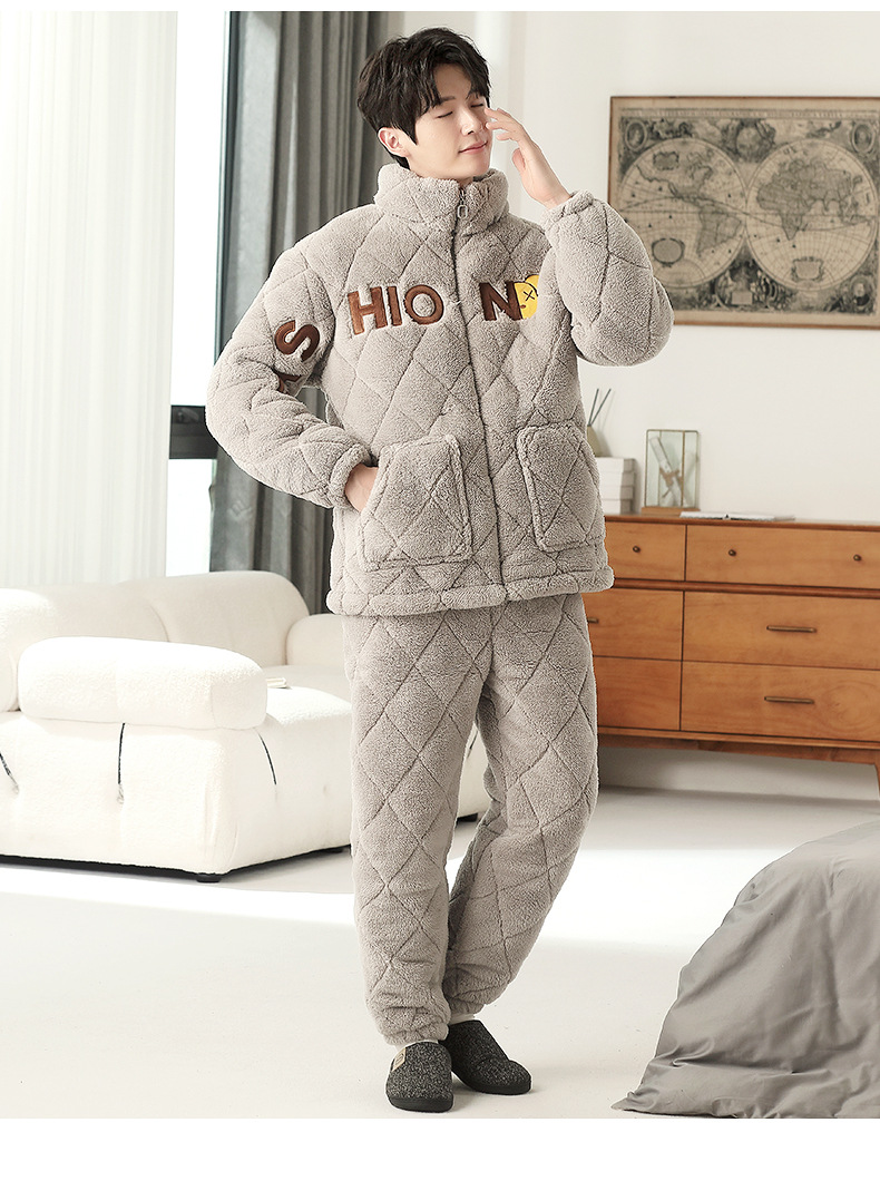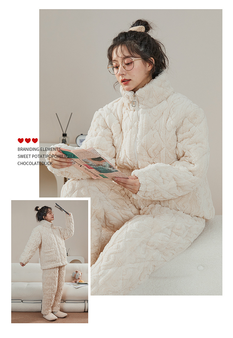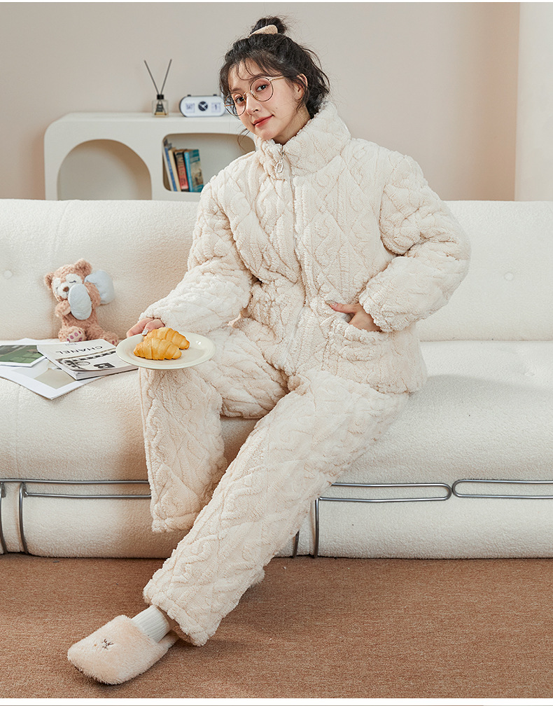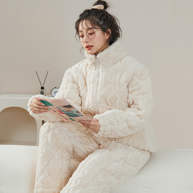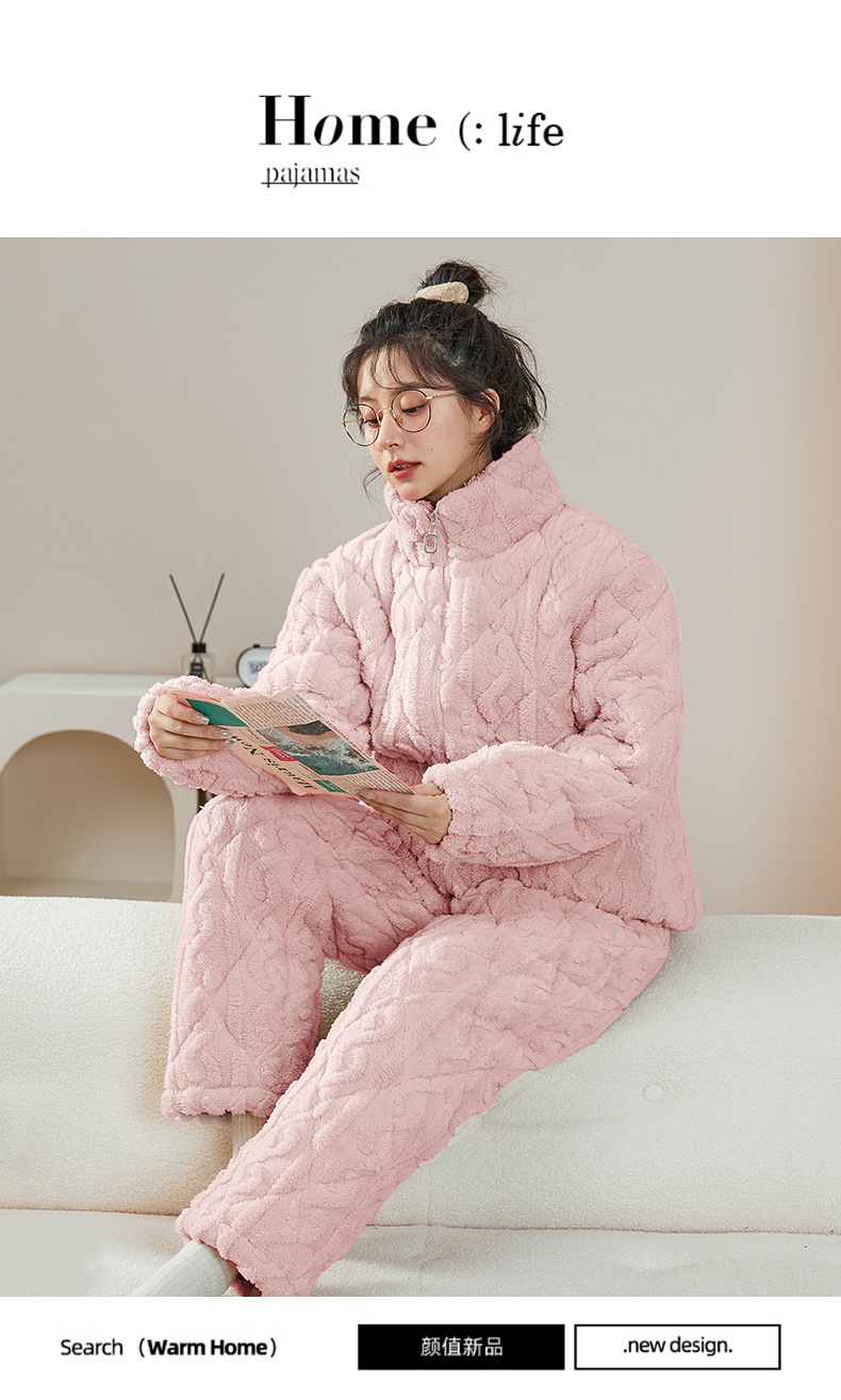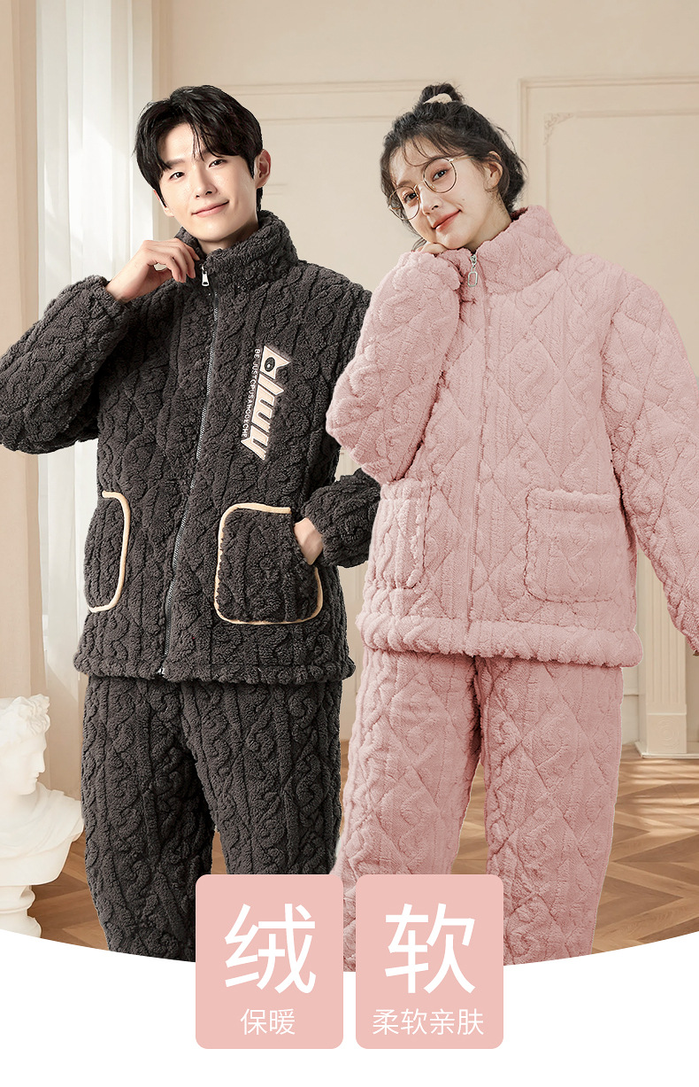 여성용 겨울 3겹 누비 두꺼운 잠옷, 자카드 스탠드 칼라, 따뜻하고 편안한 벨벳, 남성용 홈웨어 세트 외부 착용 가능스토어 가기