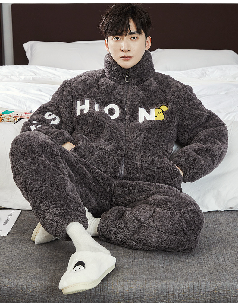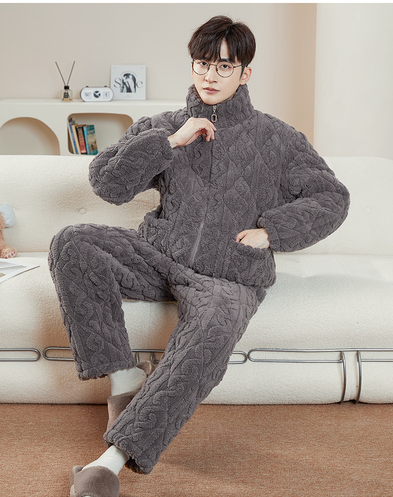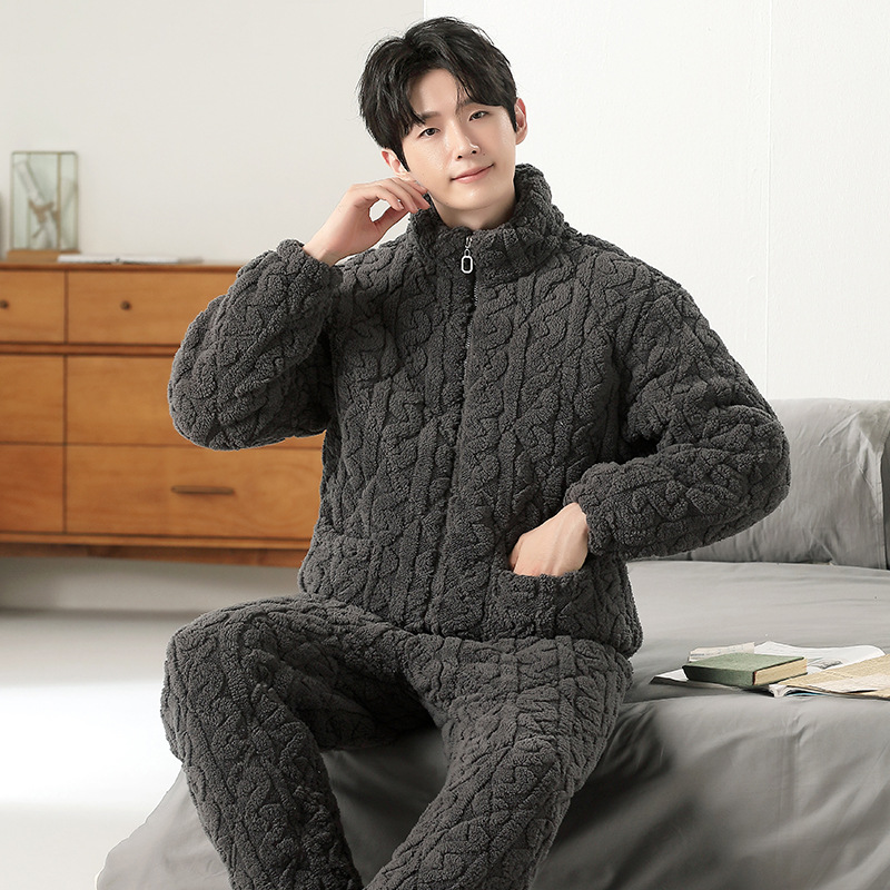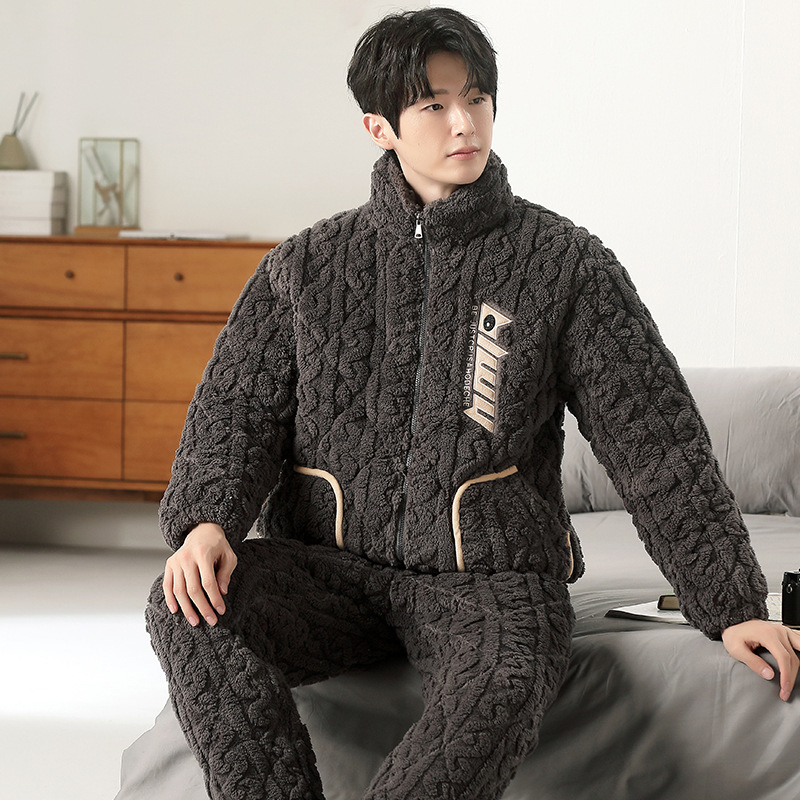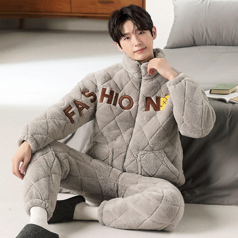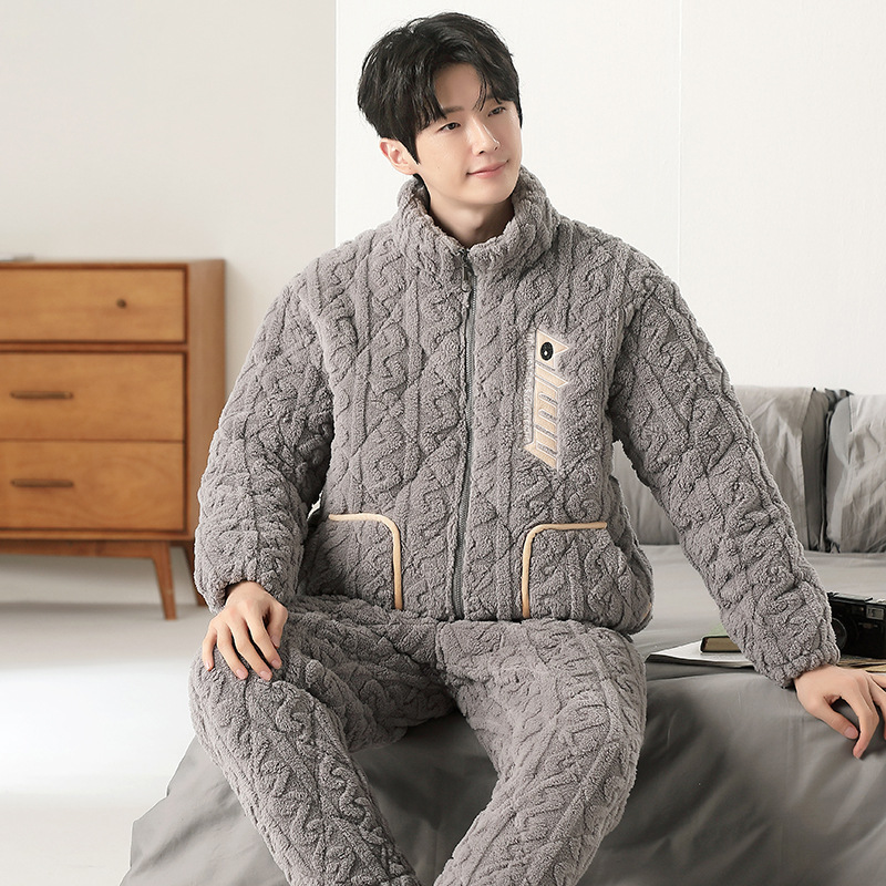 여성용 겨울 3겹 누비 두꺼운 잠옷, 자카드 스탠드 칼라, 따뜻하고 편안한 벨벳, 남성용 홈웨어 세트 외부 착용 가능스토어 가기