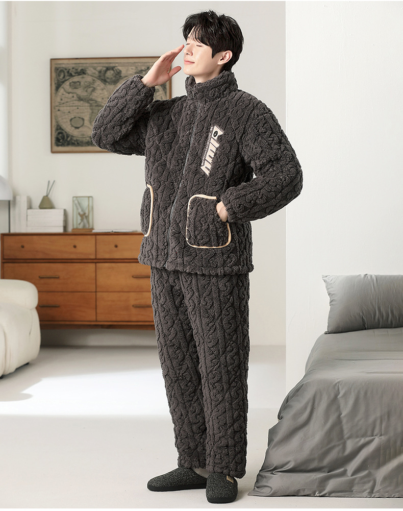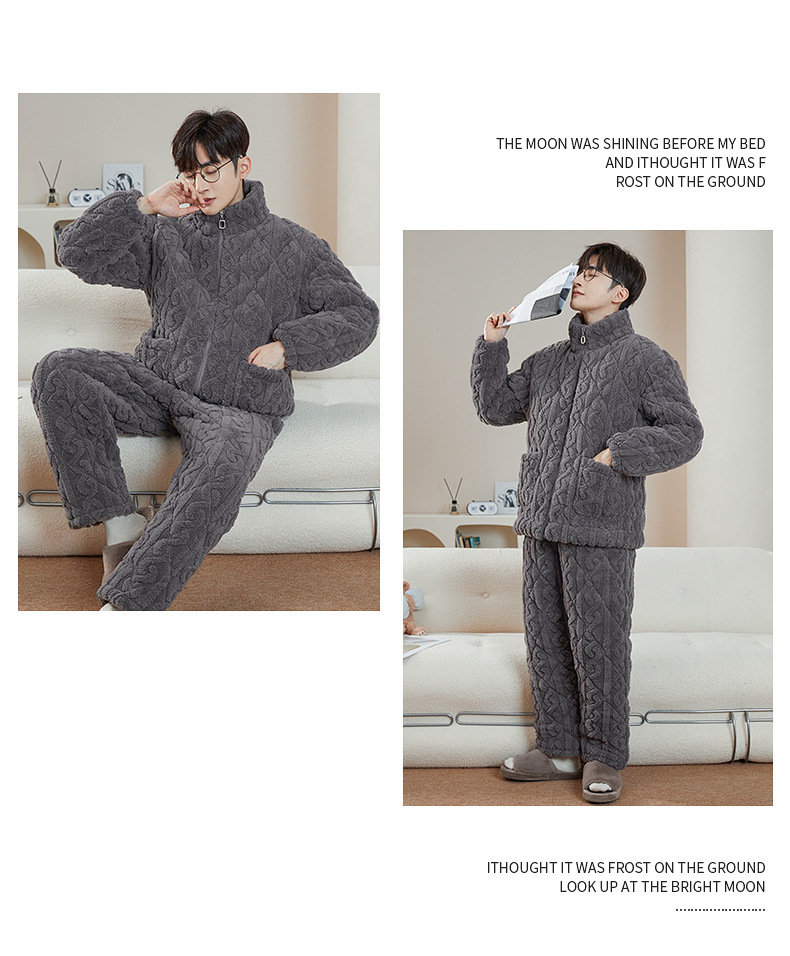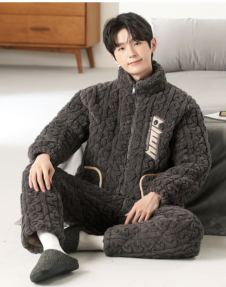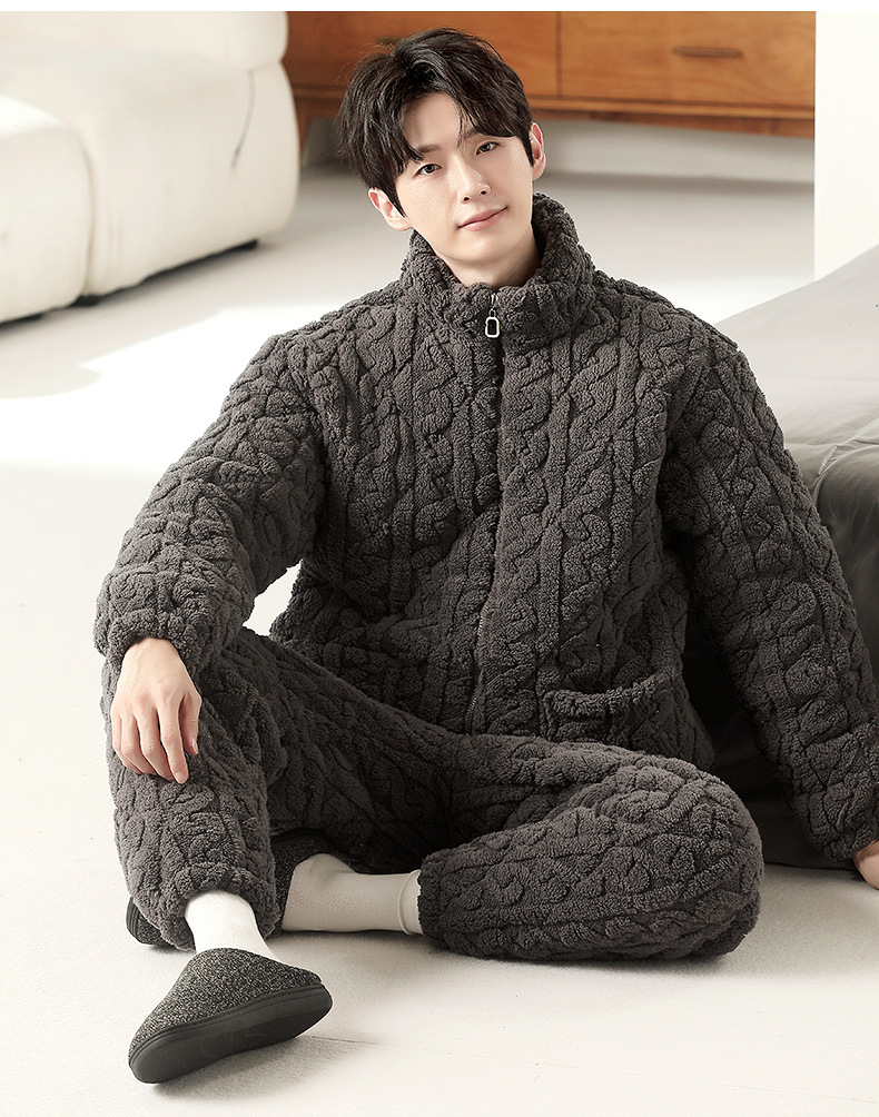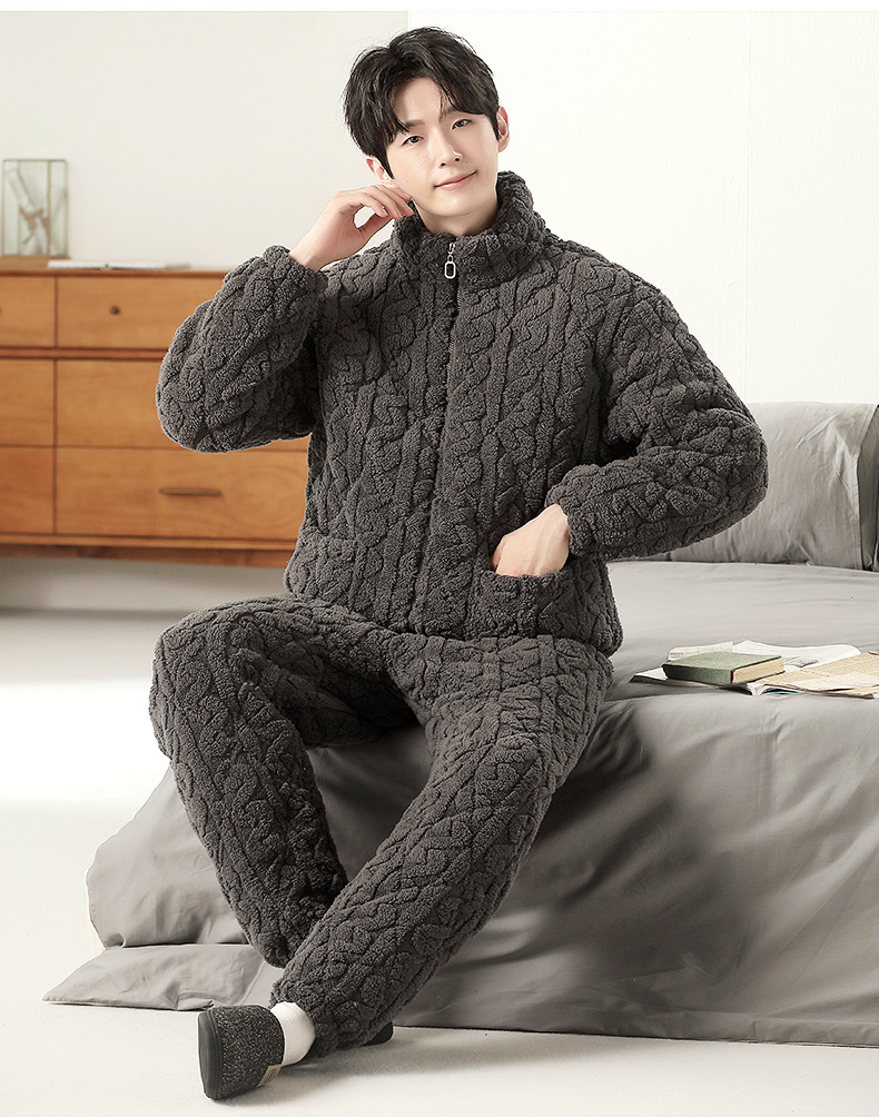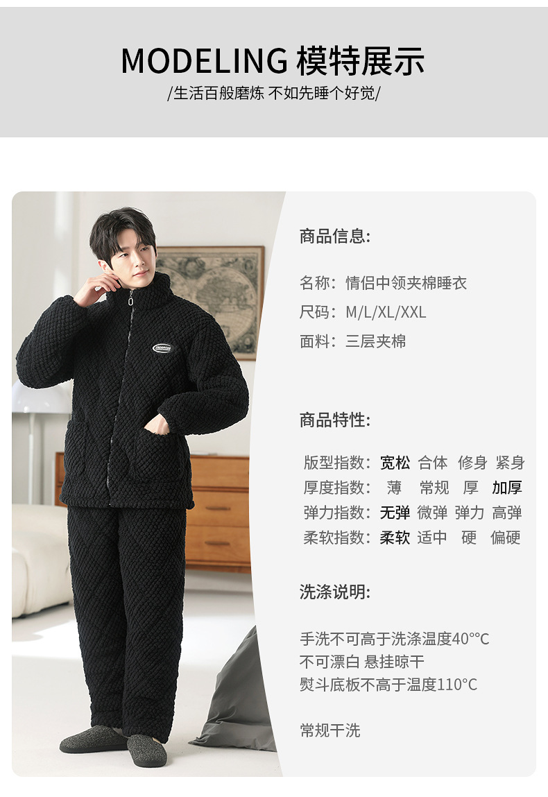 여성용 겨울 3겹 누비 두꺼운 잠옷, 자카드 스탠드 칼라, 따뜻하고 편안한 벨벳, 남성용 홈웨어 세트 외부 착용 가능스토어 가기