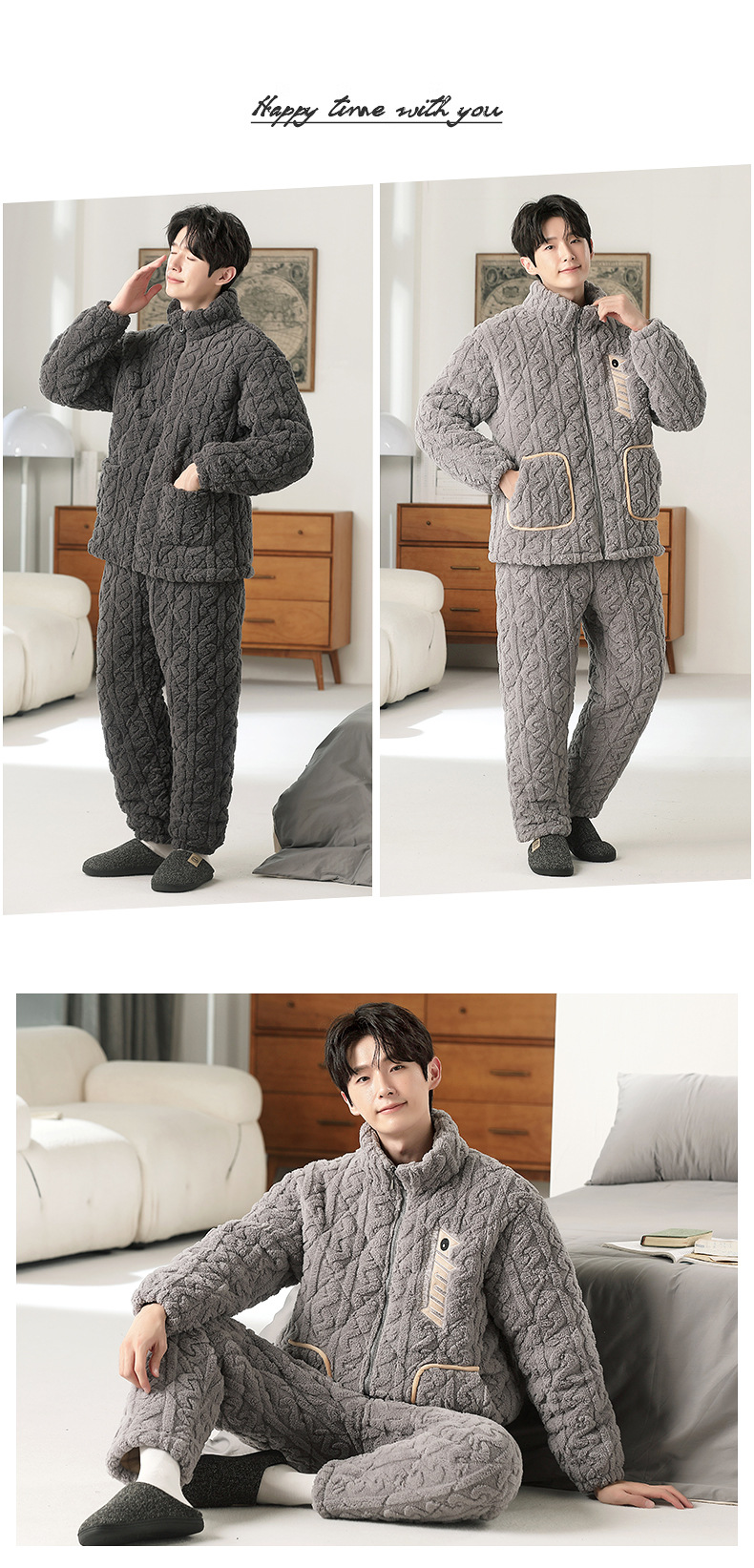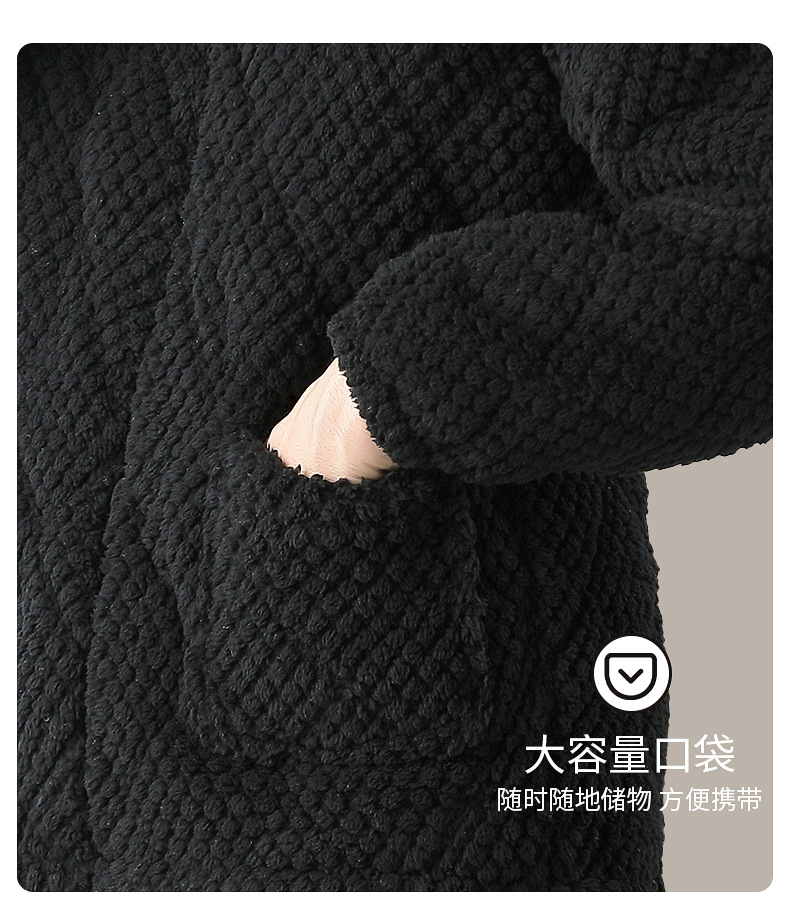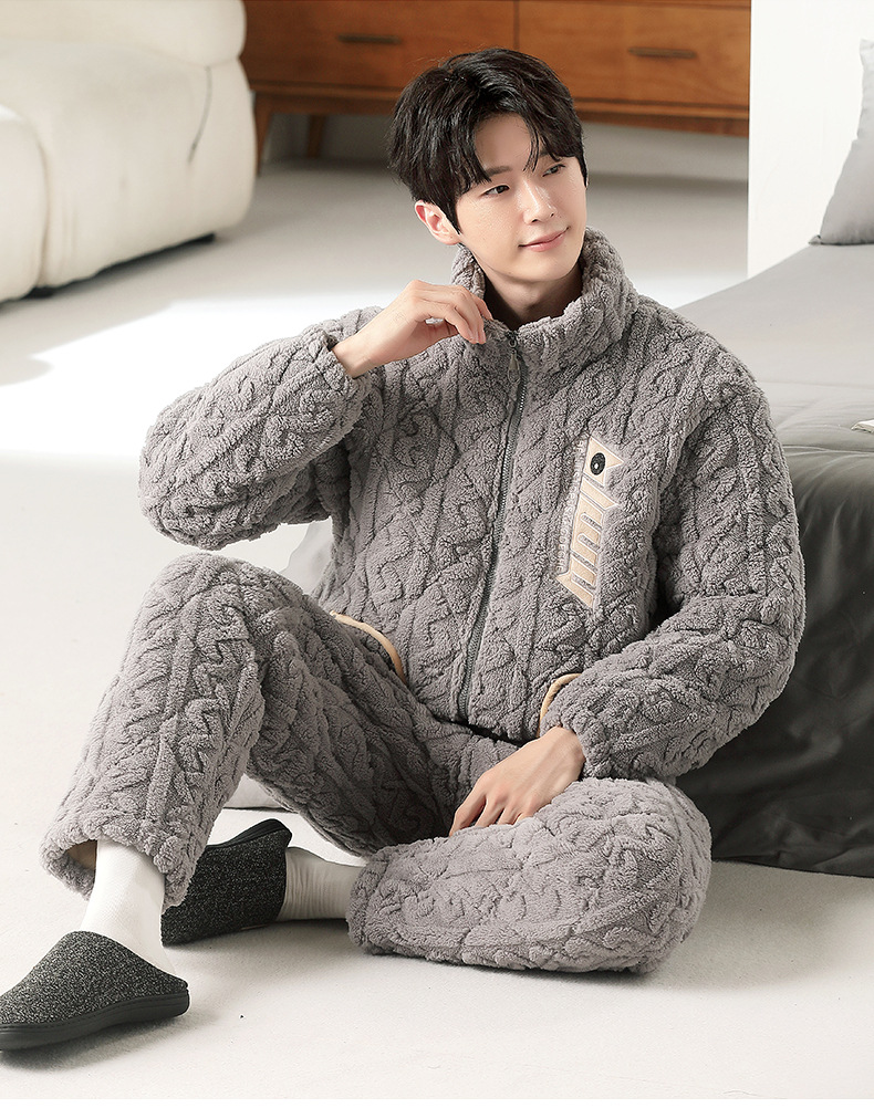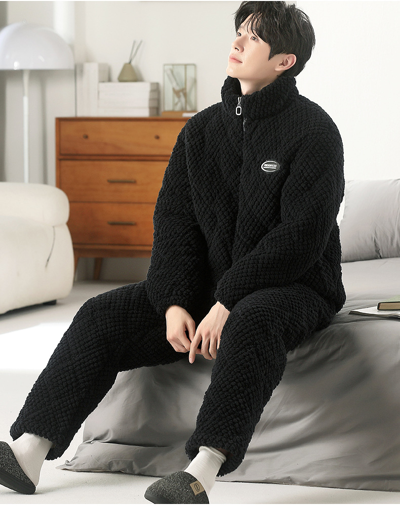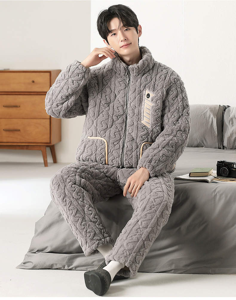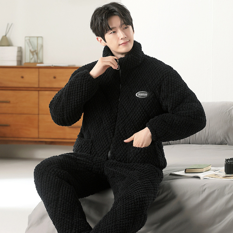 여성용 겨울 3겹 누비 두꺼운 잠옷, 자카드 스탠드 칼라, 따뜻하고 편안한 벨벳, 남성용 홈웨어 세트 외부 착용 가능스토어 가기