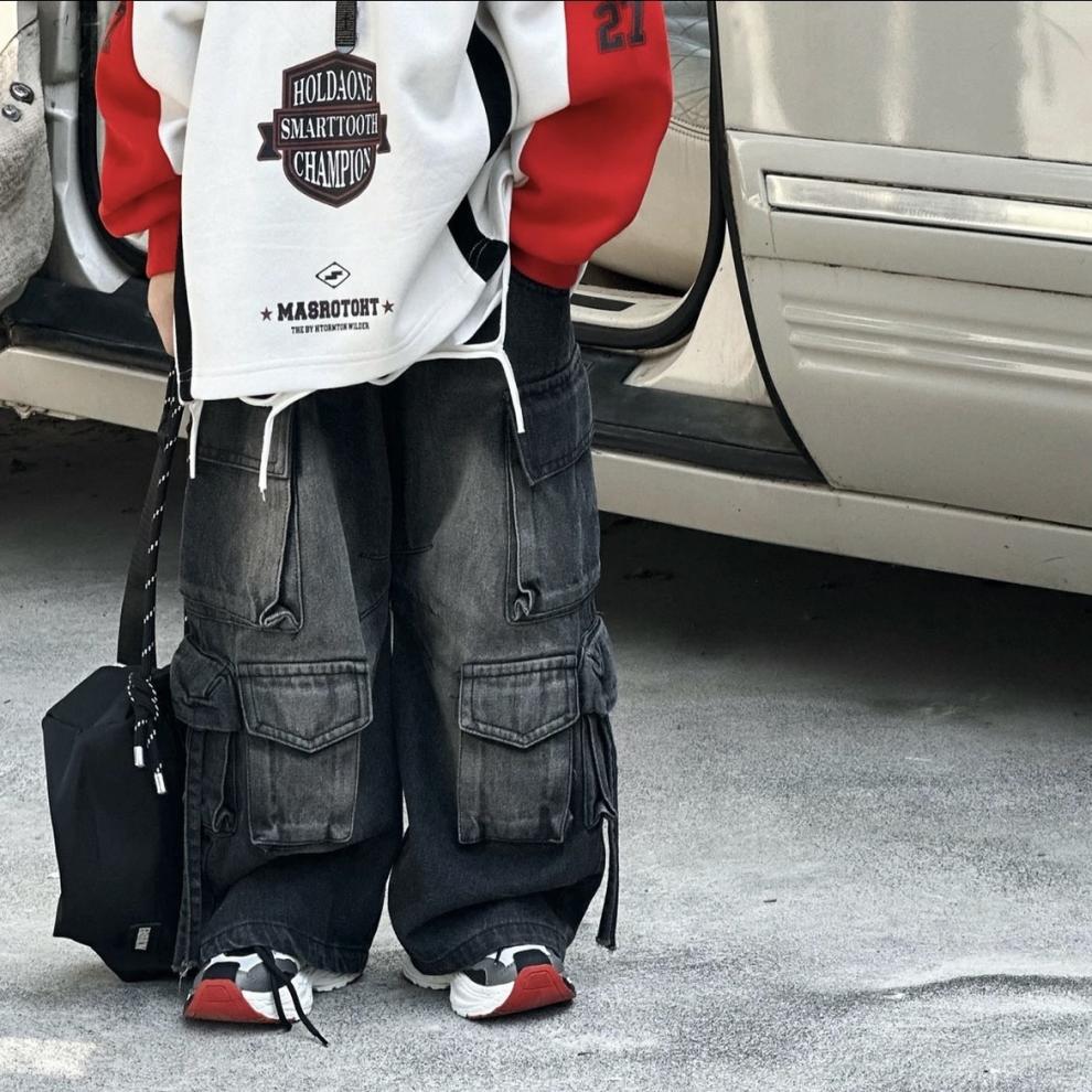 남자들의 가을 대비 컬러 땀 빈티지 청바지 세트 2024 새로운 남성과 여성의 아기 패션 세련된 투피스 세트스토어 가기