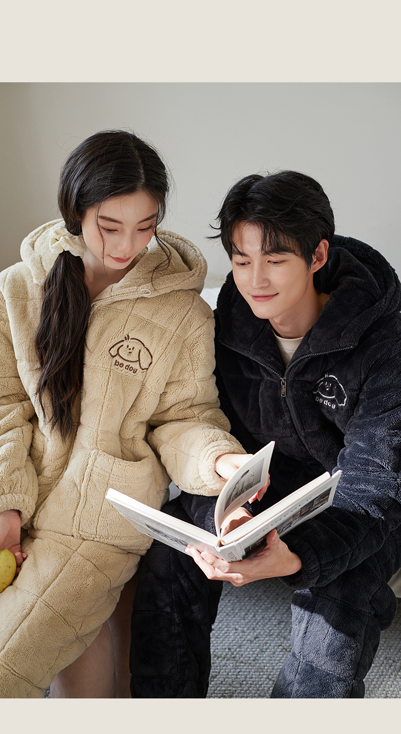 커플을위한 두꺼운 3 층 퀼트 파자마 겨울 산호 양털 두꺼운 따뜻한 후드 여성용 홈 의류 남성 세트