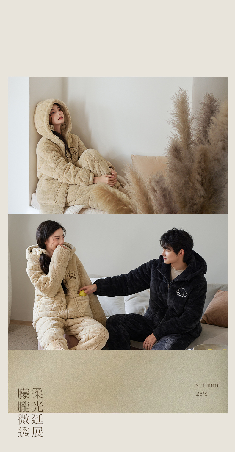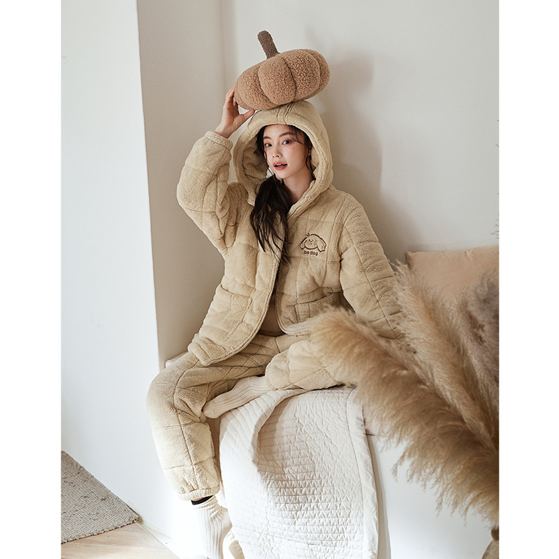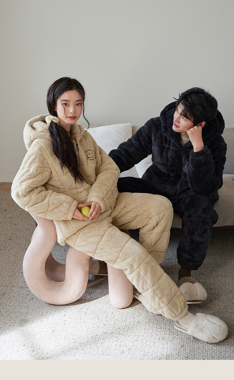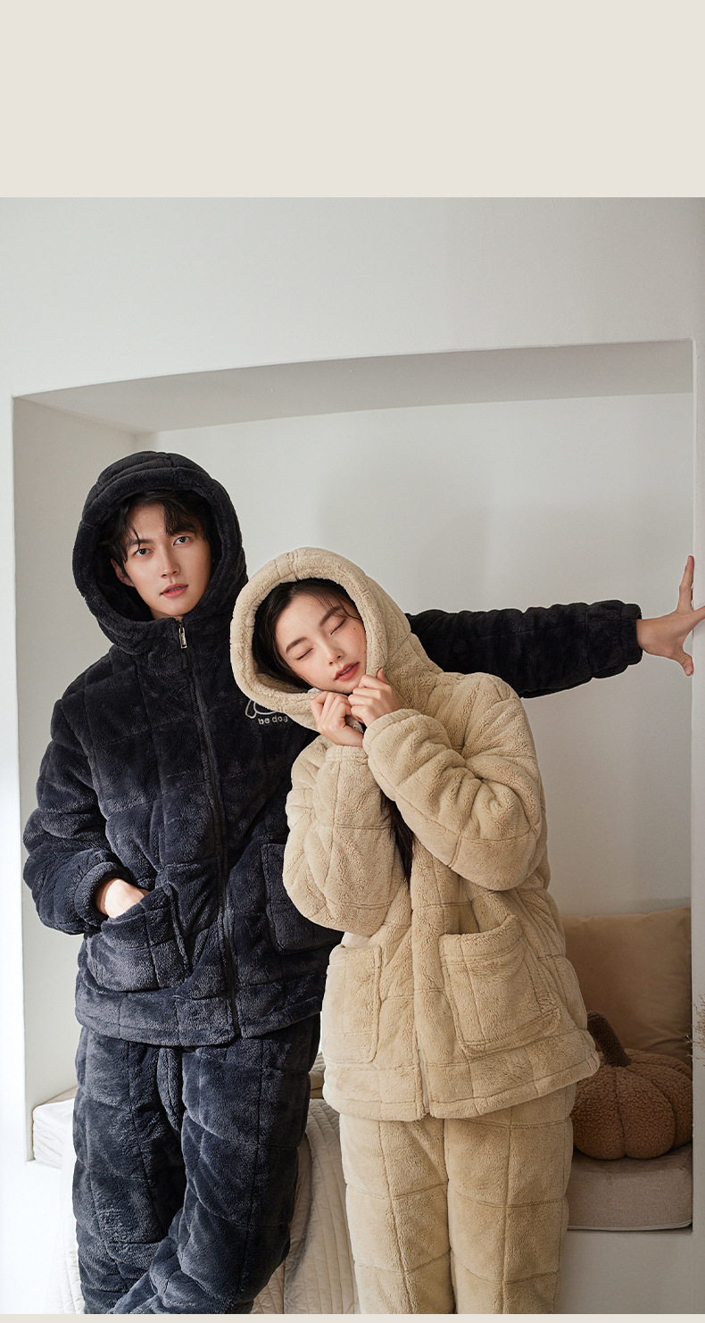 커플을위한 두꺼운 3 층 퀼트 파자마 겨울 산호 양털 두꺼운 따뜻한 후드 여성용 홈 의류 남성 세트스토어 가기
