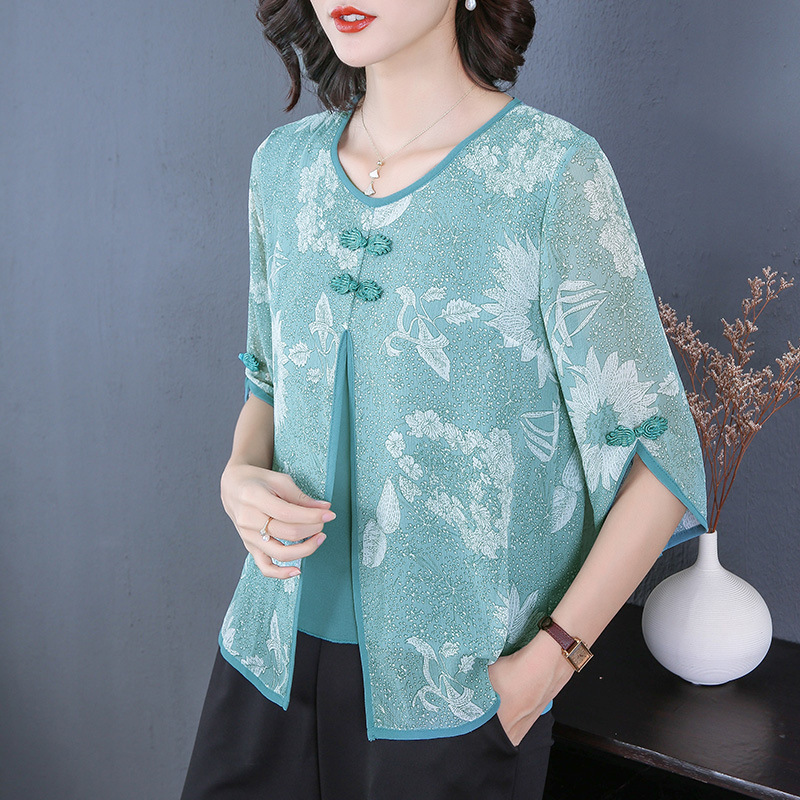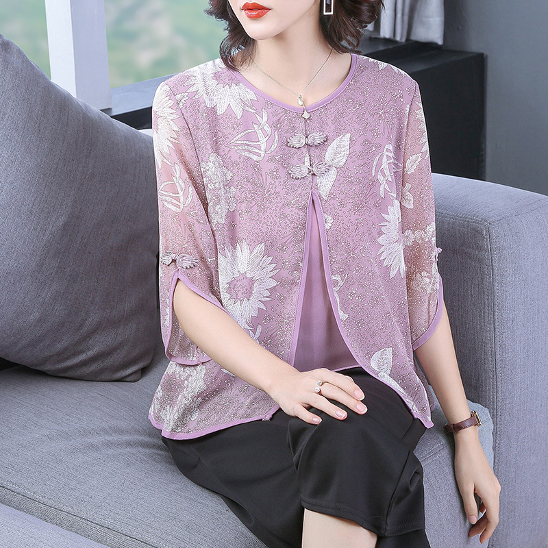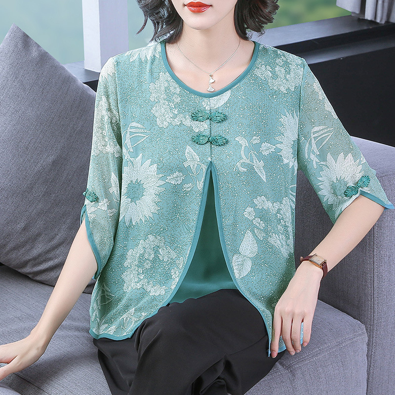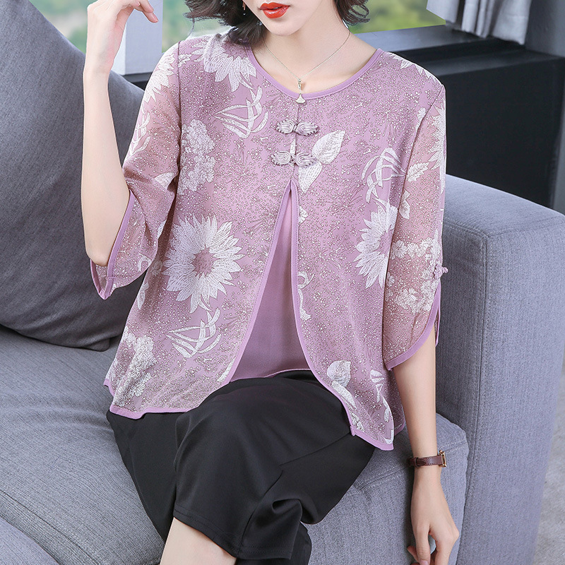 2024 여름 새로운 쉬폰 셔츠 리치 레이디 웨스턴 스타일 프린트 느슨한 티셔츠 패션 캐주얼 가짜 투피스 탑