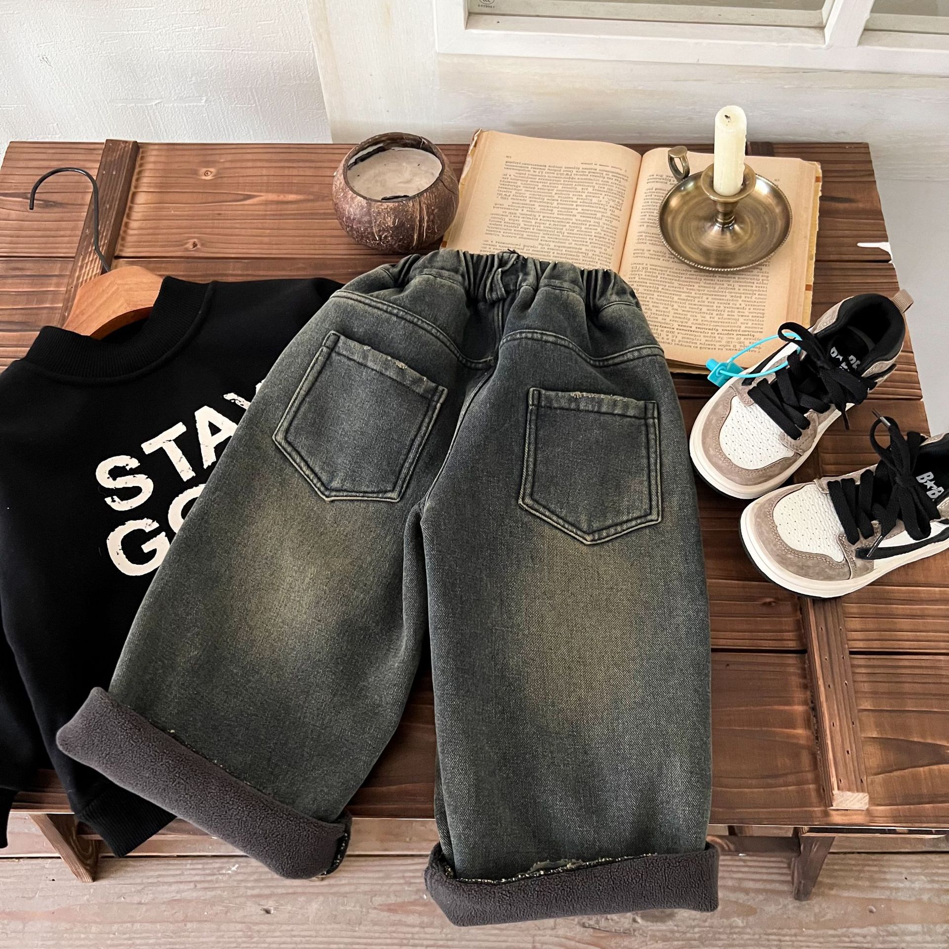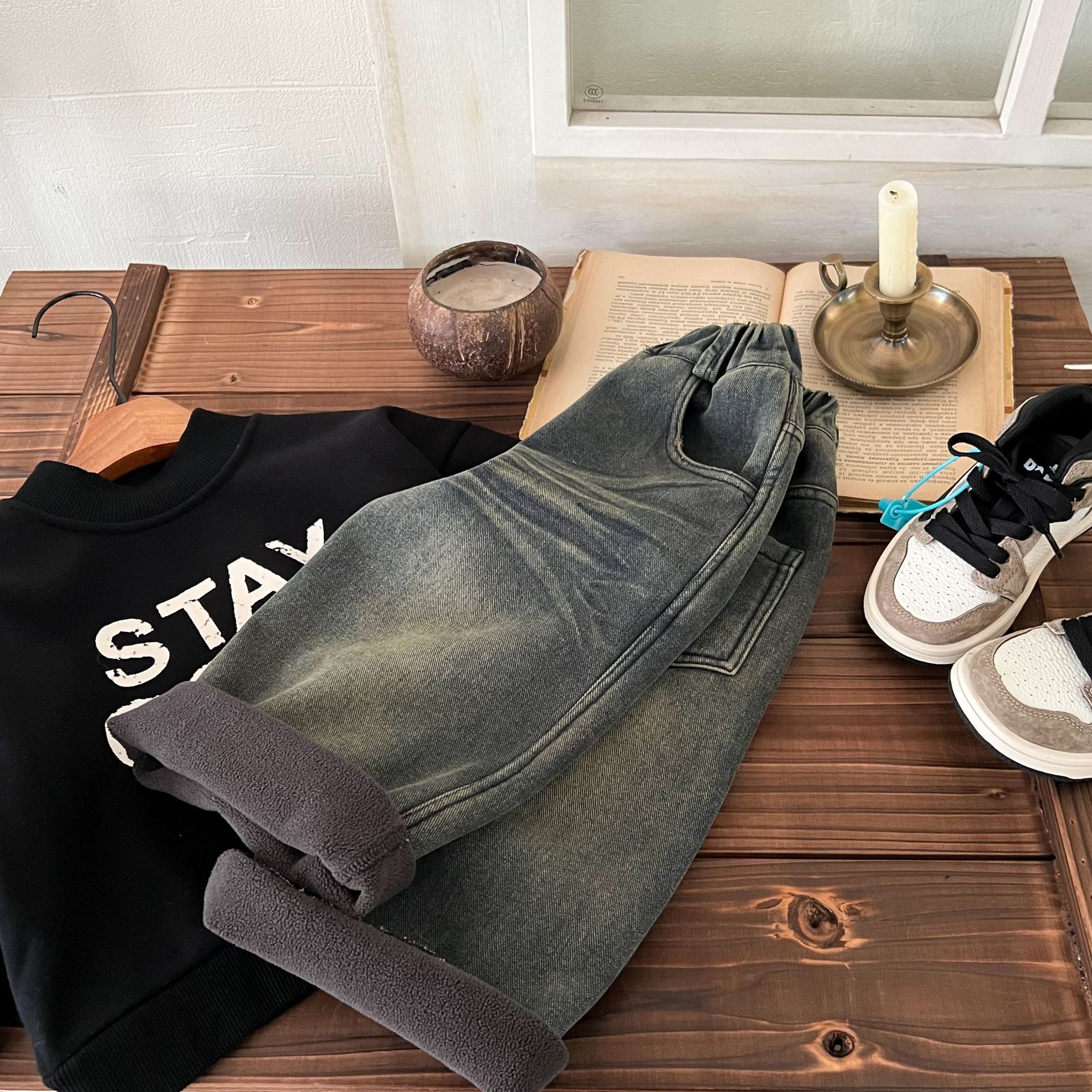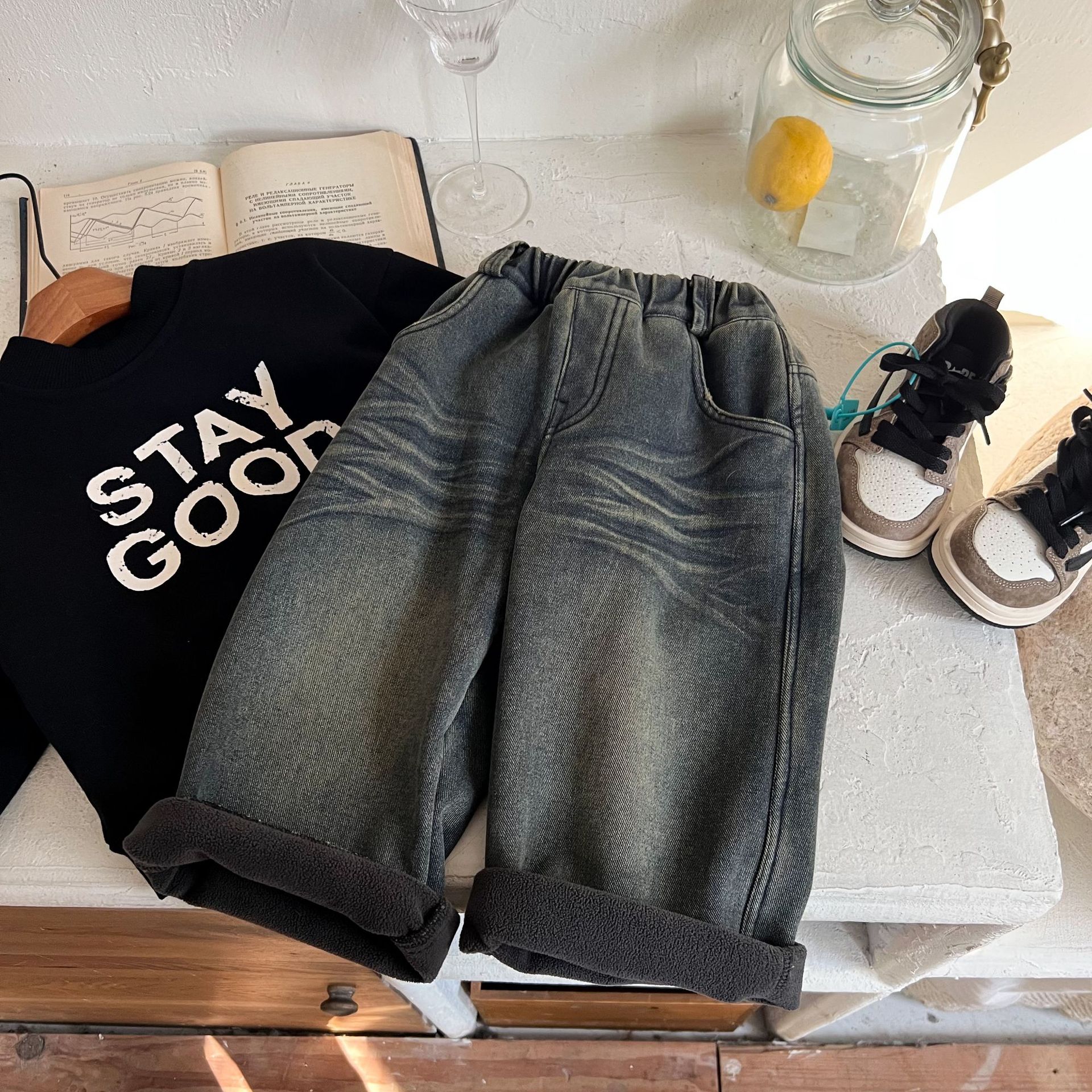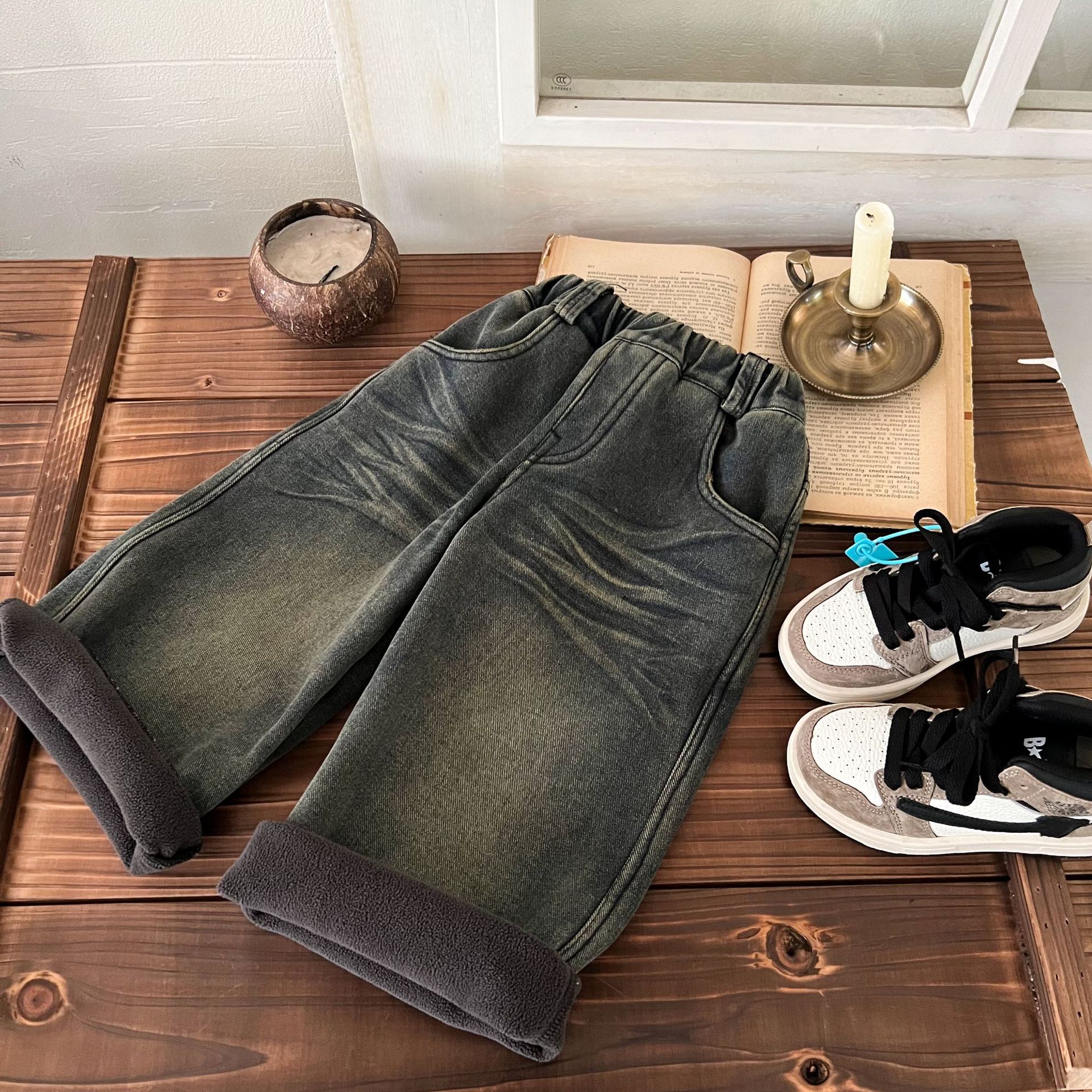 즉시 출고 어린이용 두꺼운 기모 데님 팬츠 2025 겨울복 남녀 공용 레트로 컬러 데님 스트레이트 팬츠