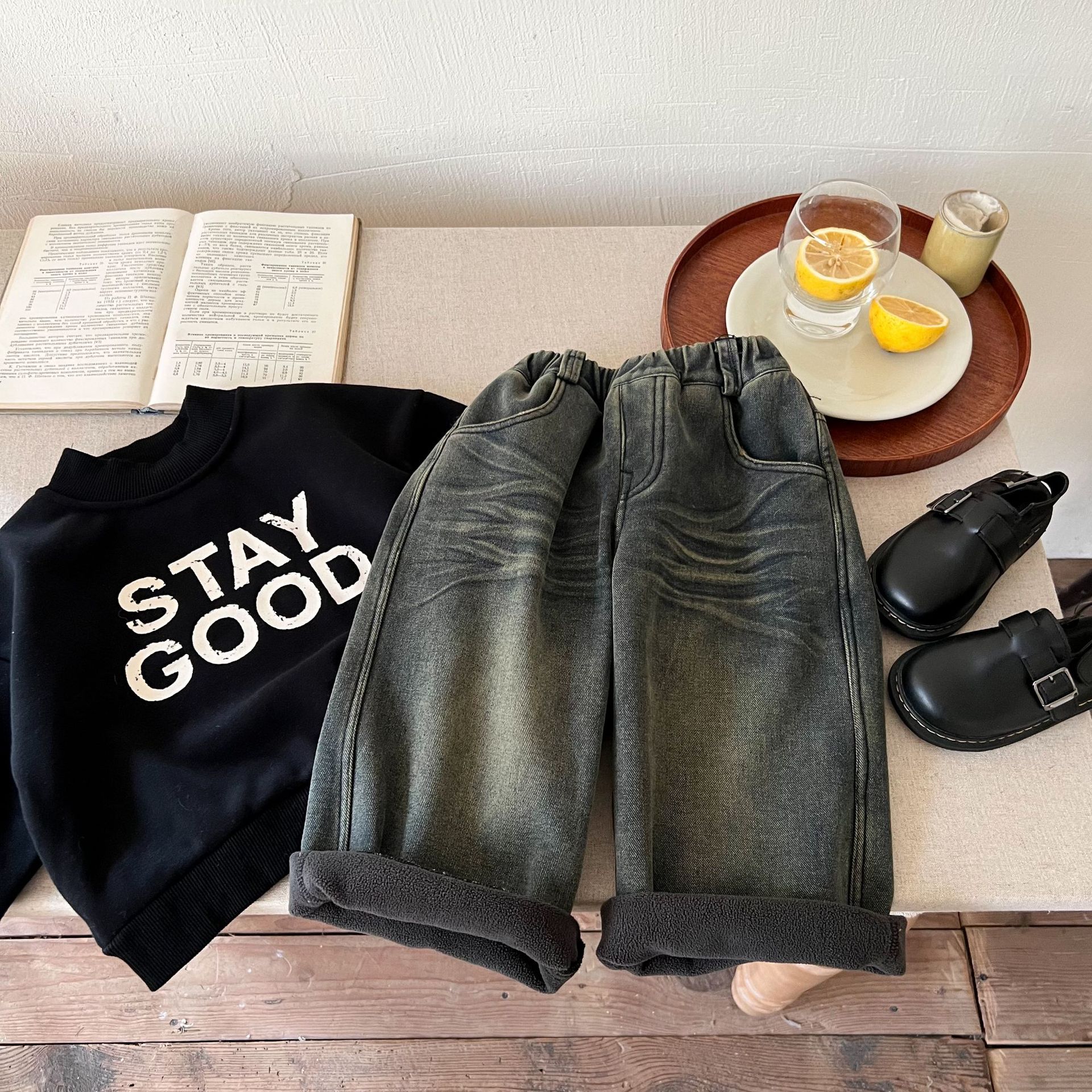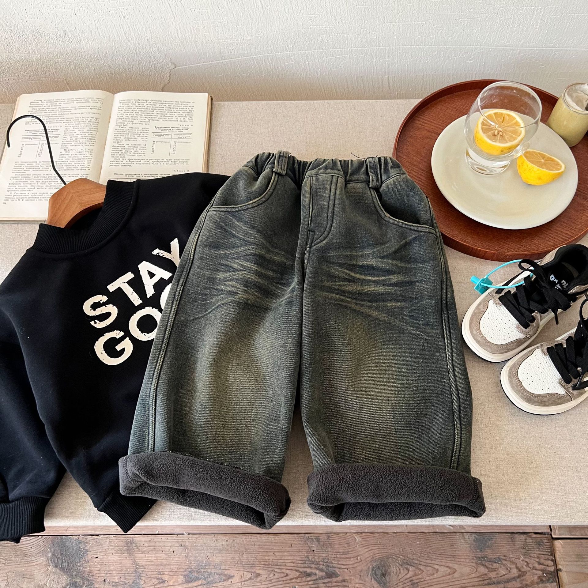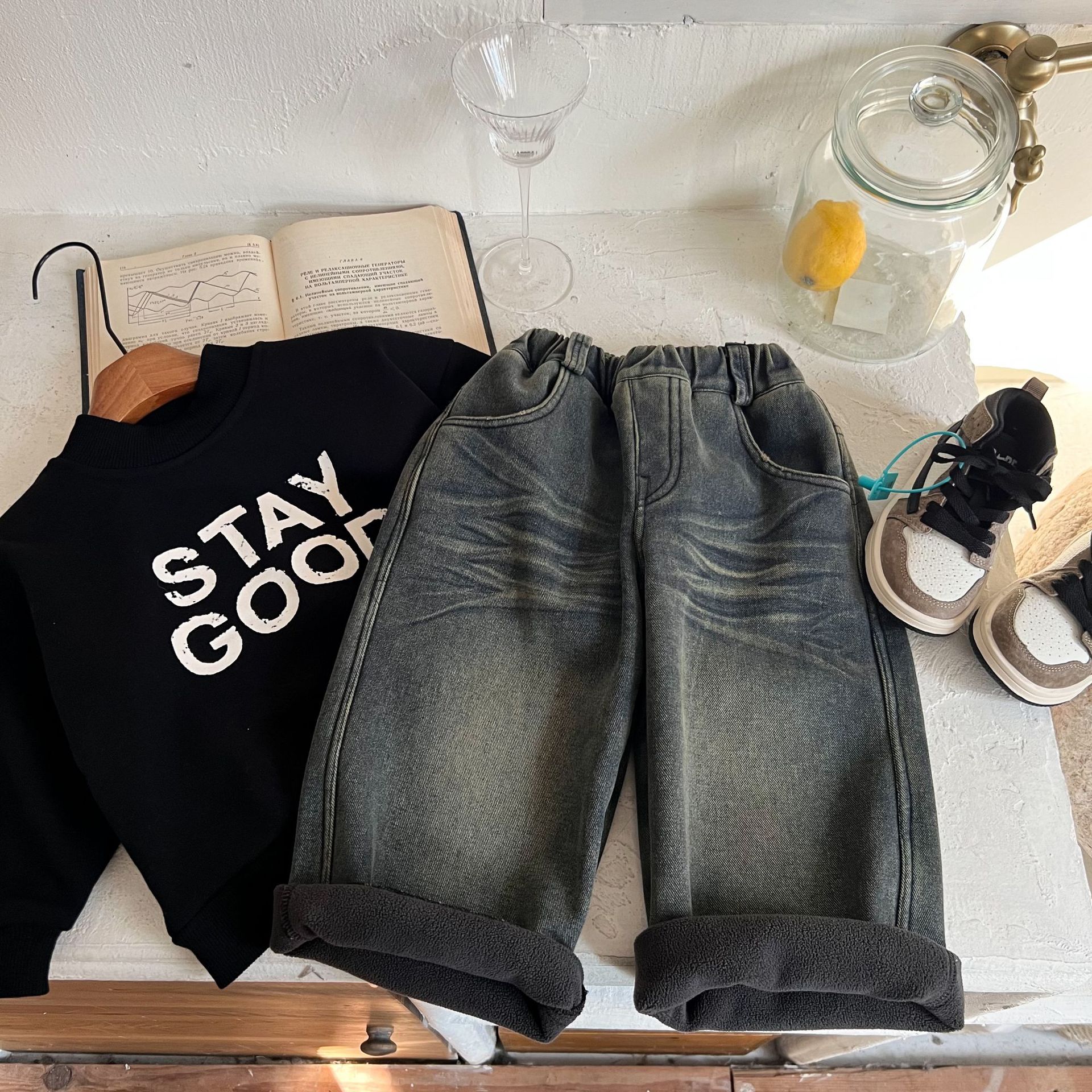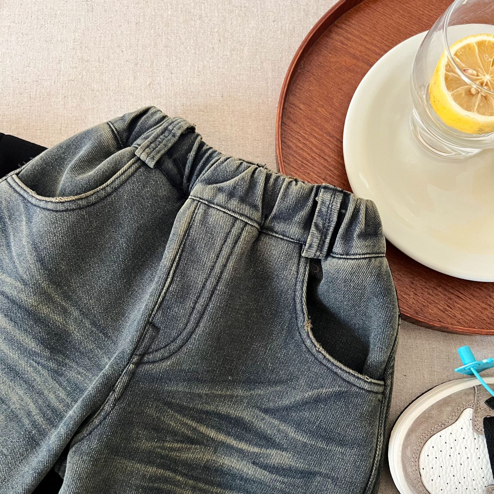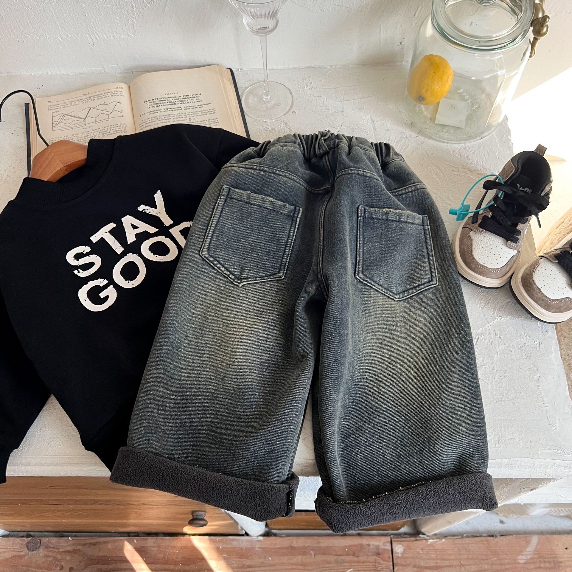 즉시 출고 어린이용 두꺼운 기모 데님 팬츠 2025 겨울복 남녀 공용 레트로 컬러 데님 스트레이트 팬츠