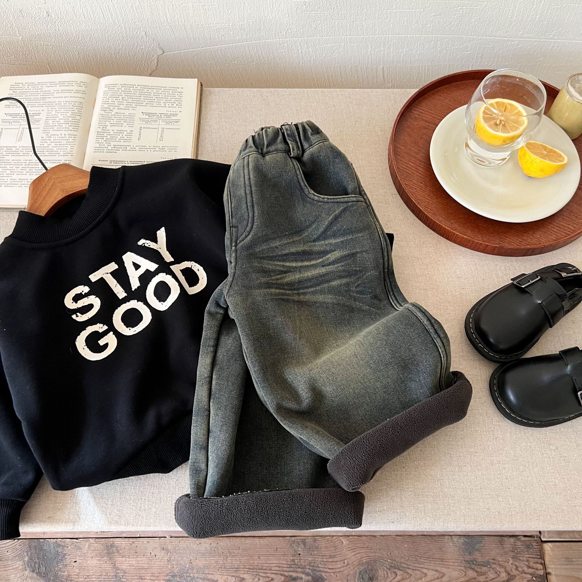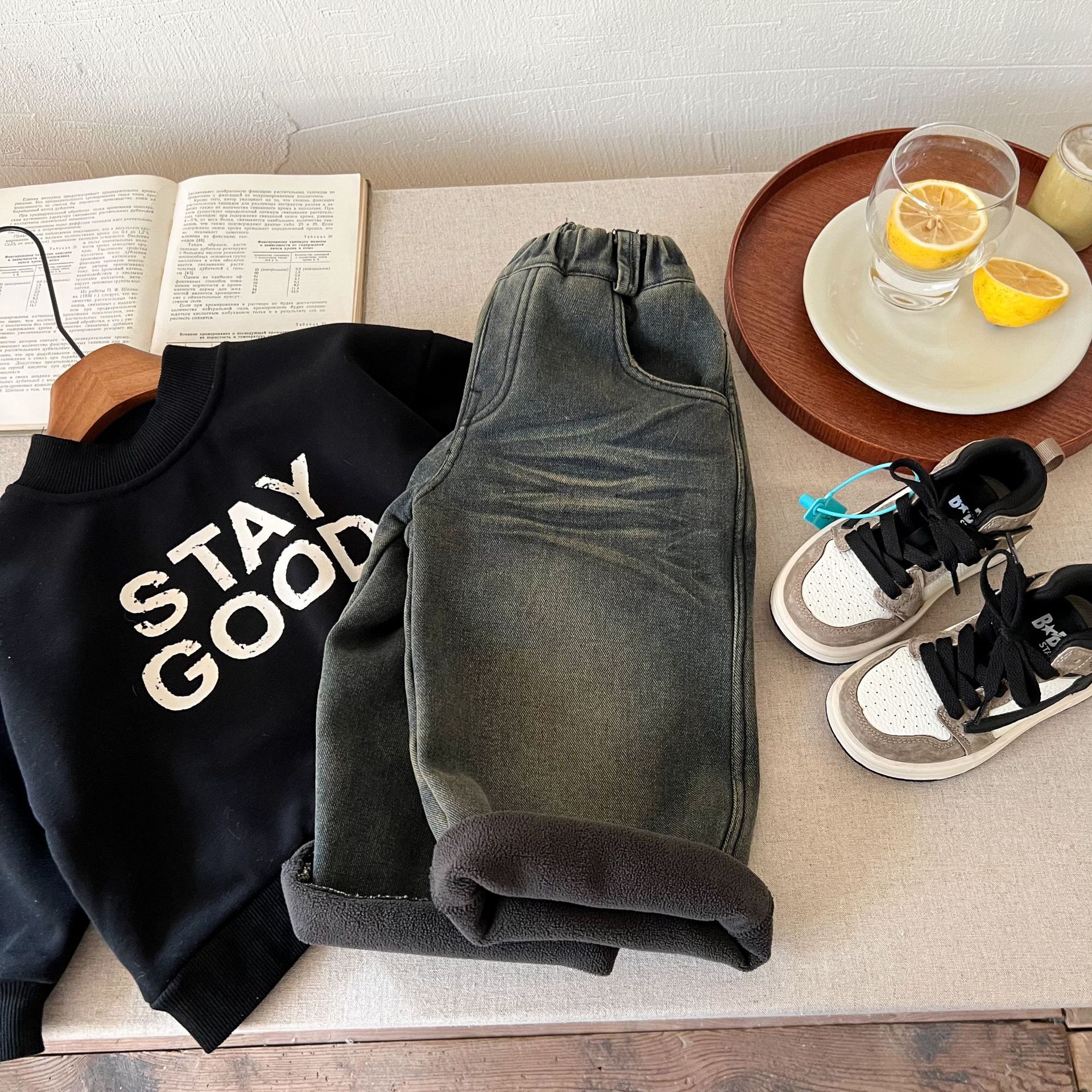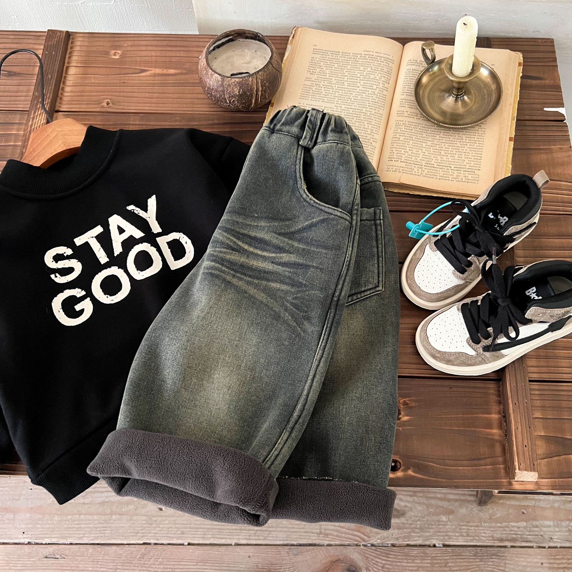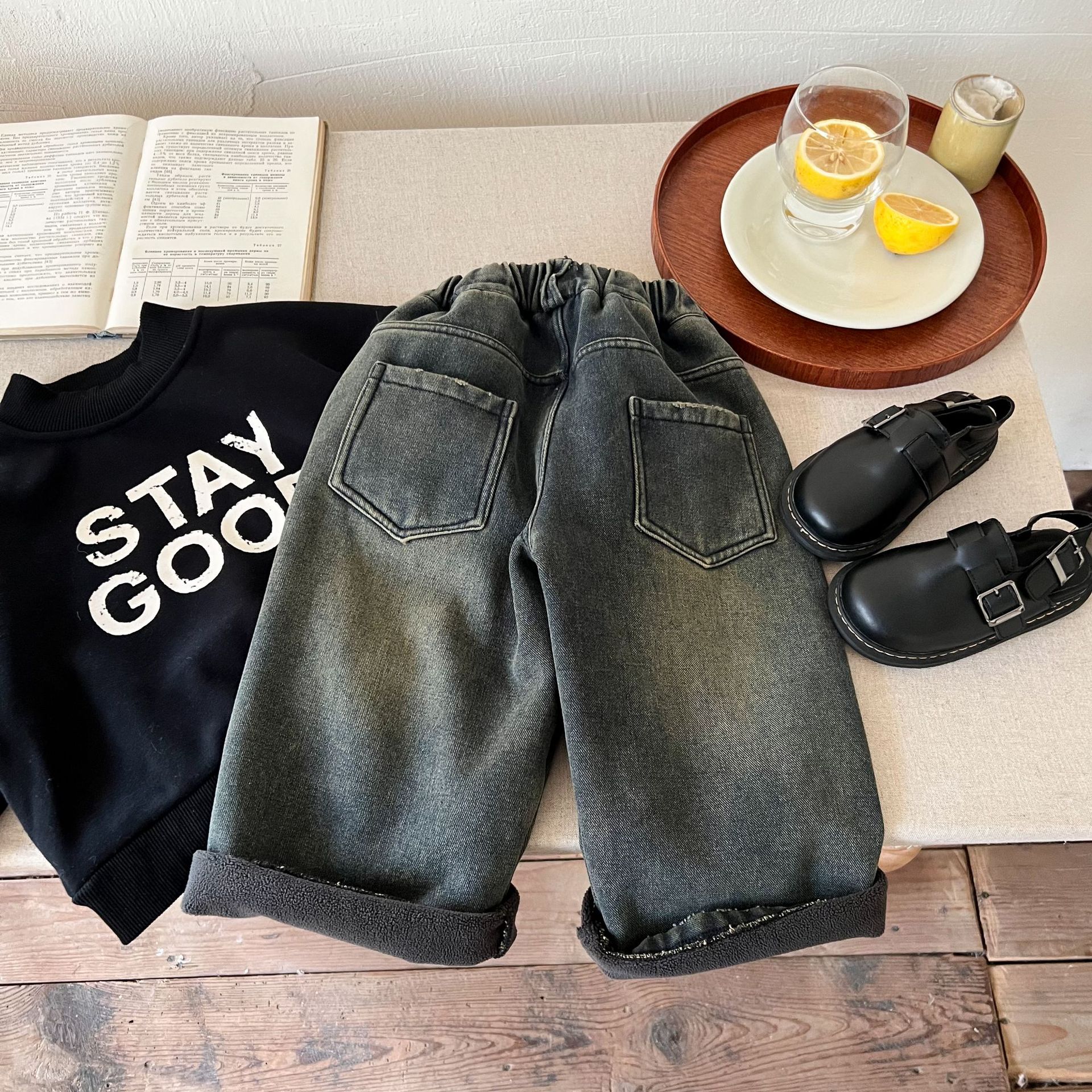 즉시 출고 어린이용 두꺼운 기모 데님 팬츠 2025 겨울복 남녀 공용 레트로 컬러 데님 스트레이트 팬츠
