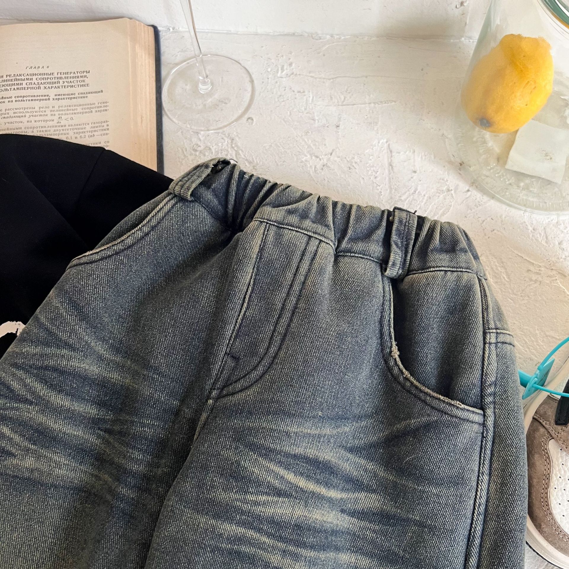 즉시 출고 어린이용 두꺼운 기모 데님 팬츠 2025 겨울복 남녀 공용 레트로 컬러 데님 스트레이트 팬츠스토어 가기