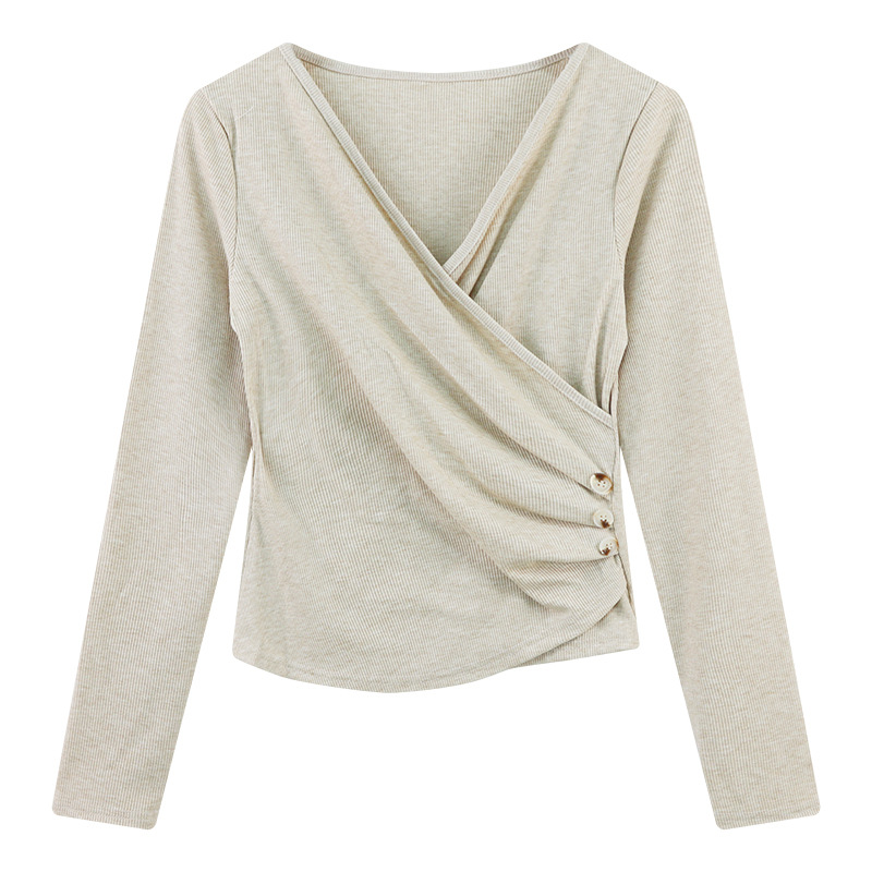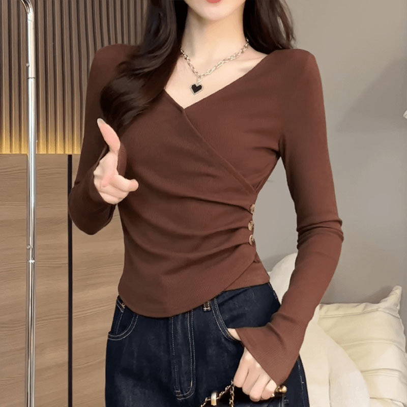 프랑스 스타일 디자인 센스 V-넥 긴팔 벨벳 티셔츠 여성의 가을과 겨울 새로운 도착 슬림-올매치 베이스 레이어 셔츠 탑
