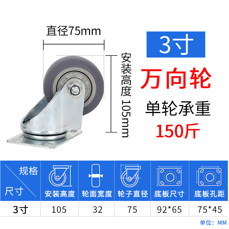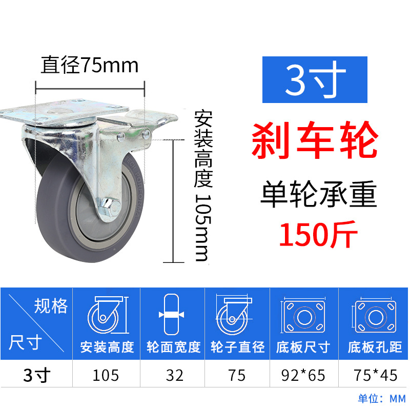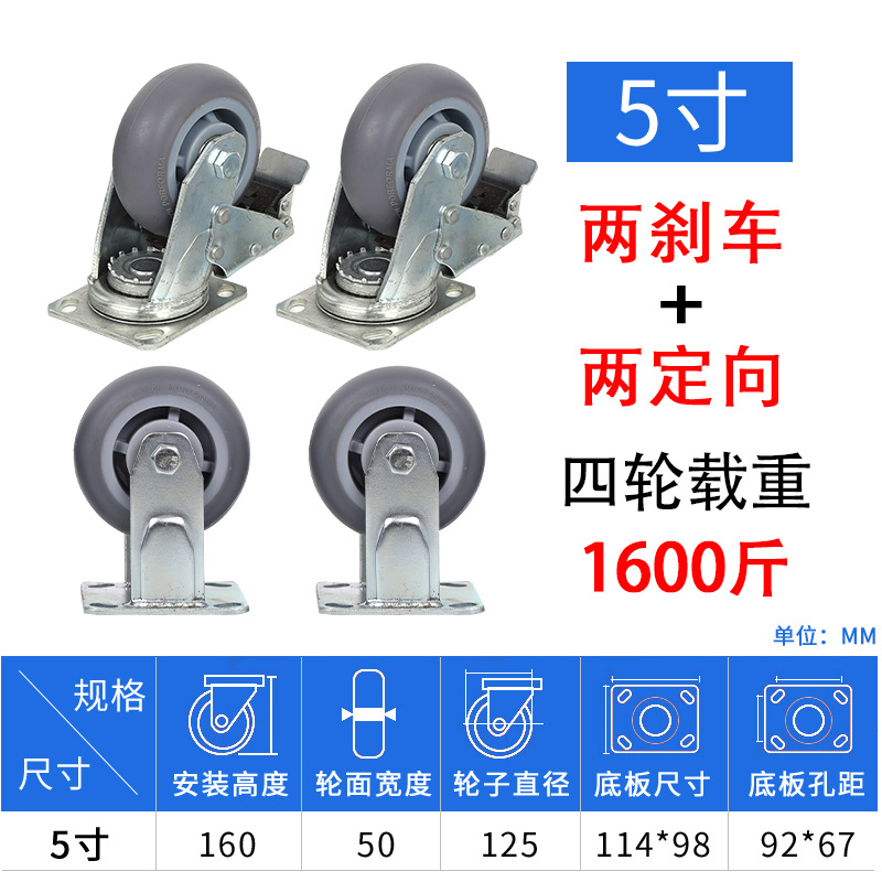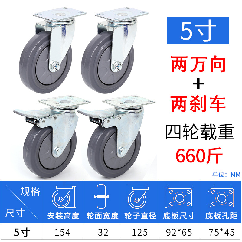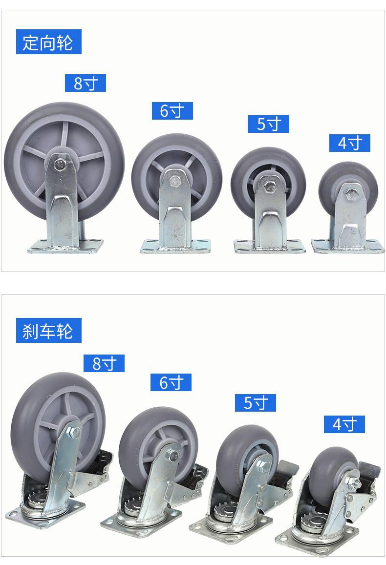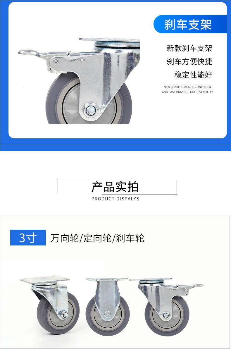 유니버설 휠 TPR 고무 캐스터 3/4/5/6/8 인치 중간 무거운 음소거 회색 고무 카트 브레이크 방향 휠