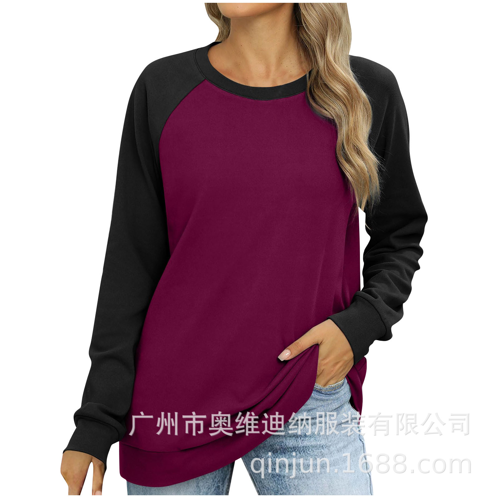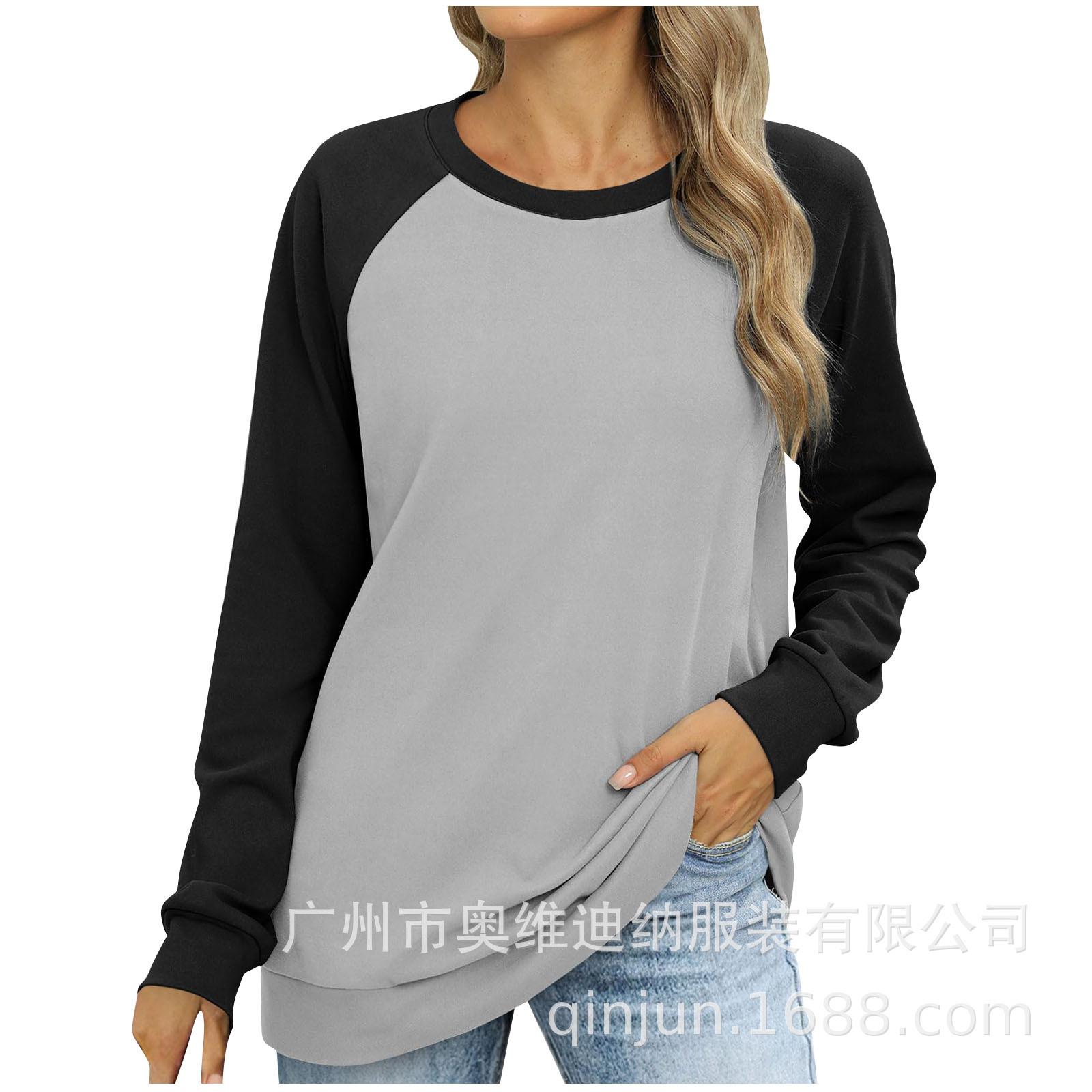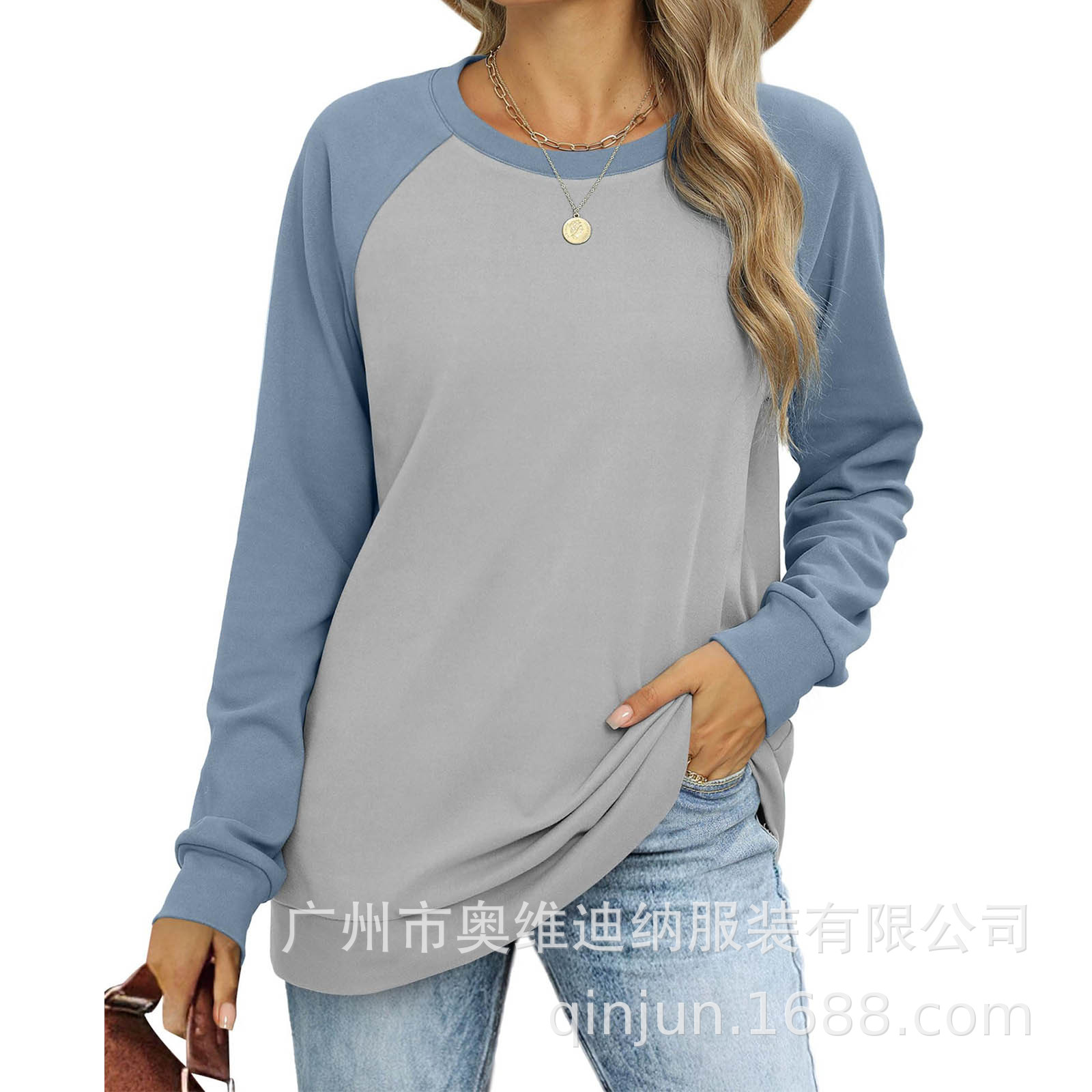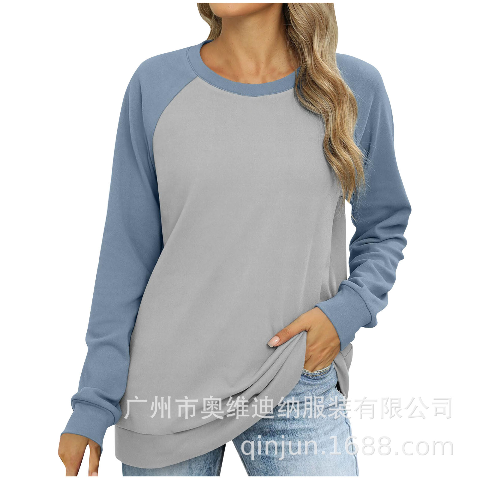 2024 유럽과 미국 국경 대외 무역 여성의 새로운 아마존 독립 역 가을 레저 승무원 목 라글란 컬러 매칭 긴 소매스토어 가기