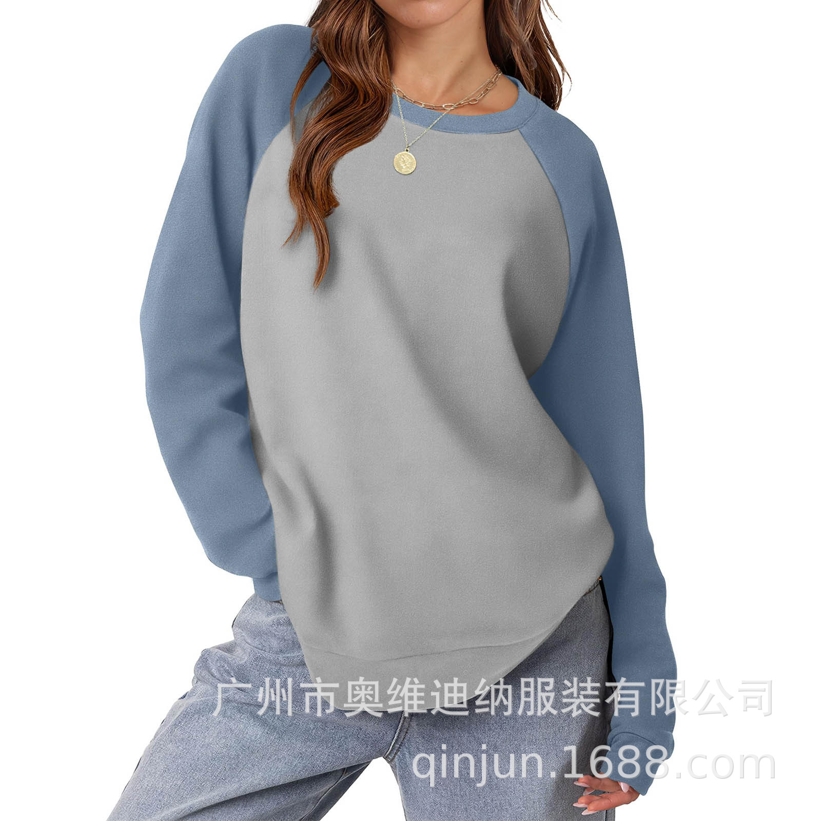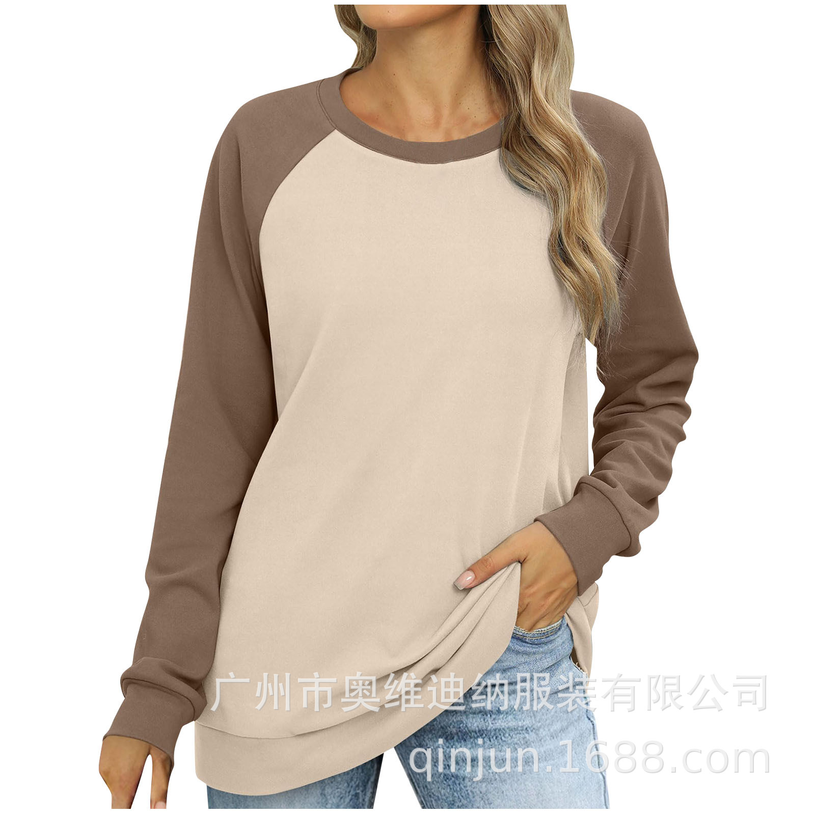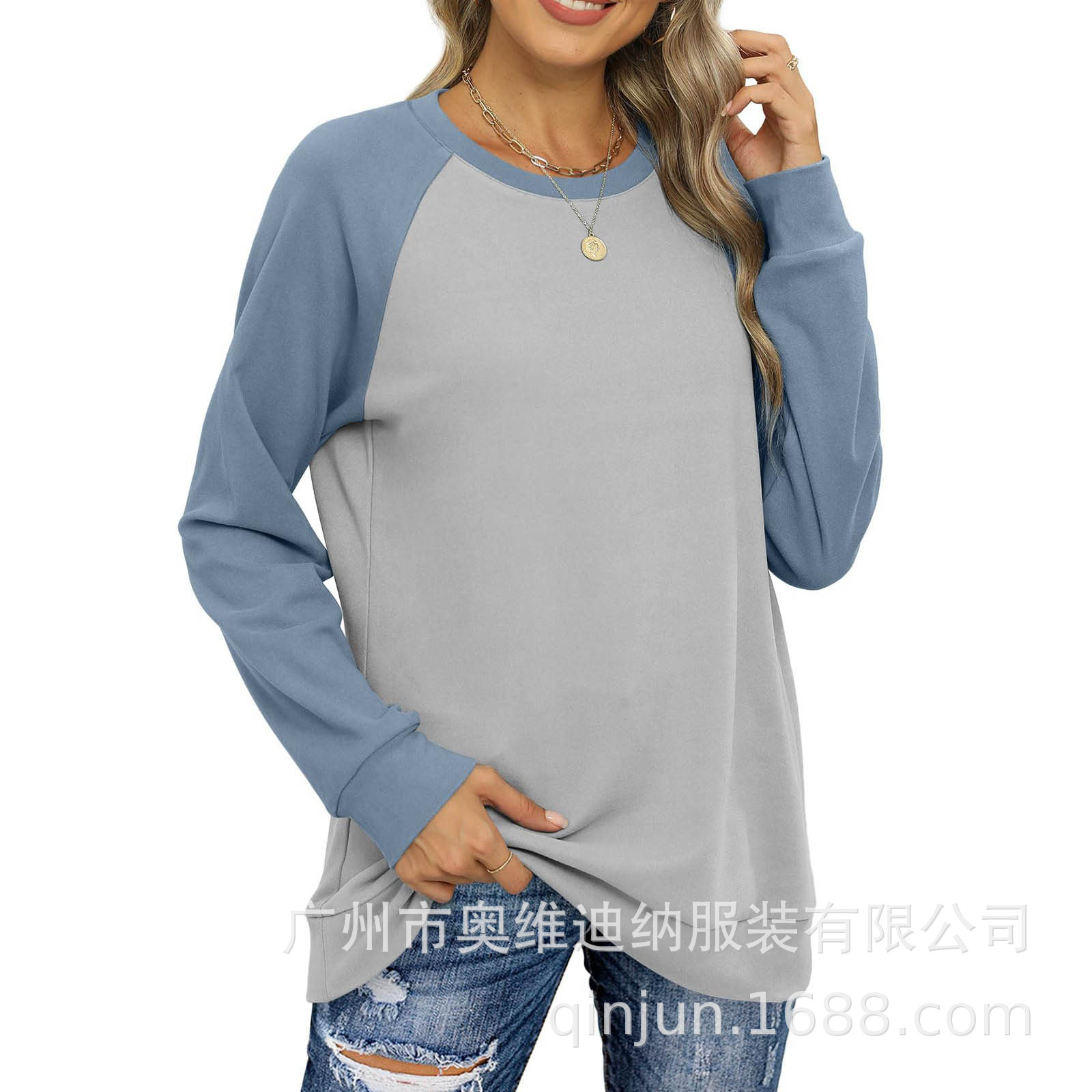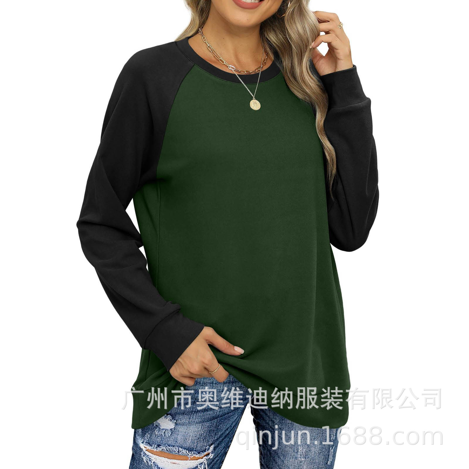 2024 유럽과 미국 국경 대외 무역 여성의 새로운 아마존 독립 역 가을 레저 승무원 목 라글란 컬러 매칭 긴 소매스토어 가기