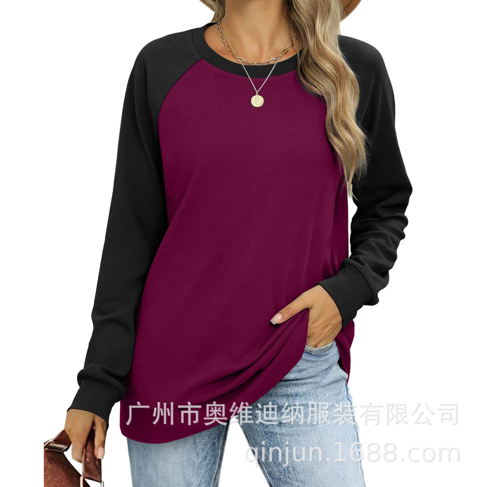 2024 유럽과 미국 국경 대외 무역 여성의 새로운 아마존 독립 역 가을 레저 승무원 목 라글란 컬러 매칭 긴 소매