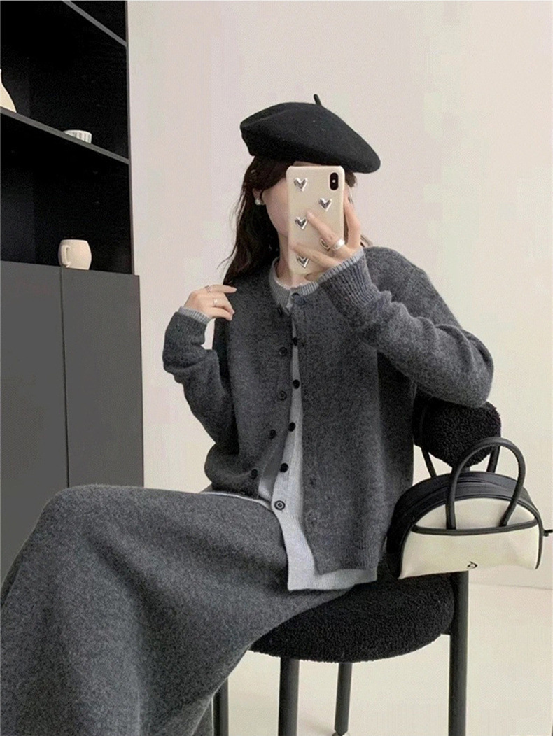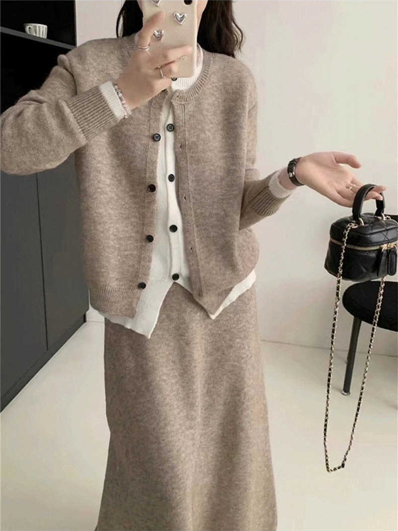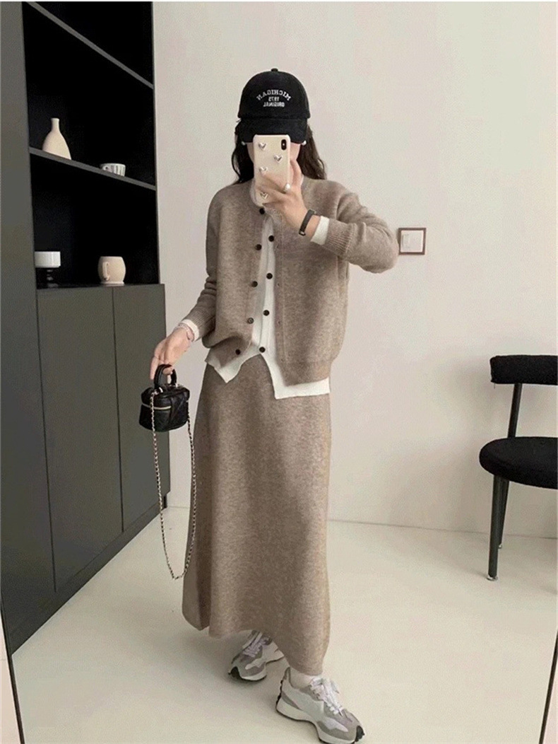 가을과 겨울 새로운 니트 원피스 여성 패션 가짜 투피스 콘트라스트 카디건 탑 스커트 캐주얼 투피스 세트스토어 가기
