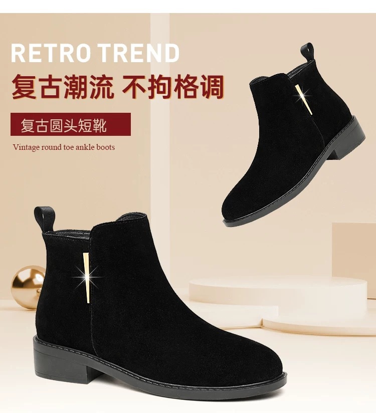 폭발] 편안한 마더 슈즈를 기모 낮은 힐 스웨이드 짧은 부츠 2024 가을과 겨울 새로운 사이드 지퍼 블랙 마틴