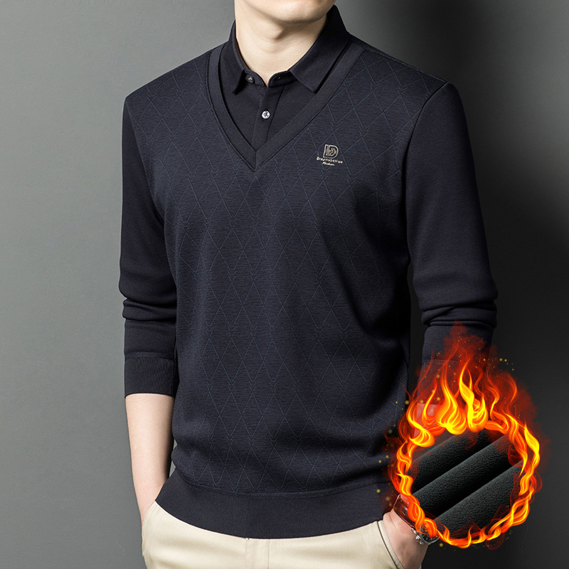 2024 새로운 중년 남성 스웨터 셔츠 칼라 기모 두꺼운 겨울 따뜻한 가짜 투피스 남성용 긴팔 티셔츠
