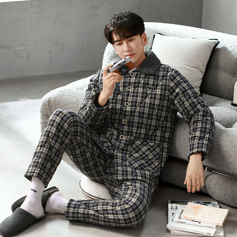 공장 직접 겨울 새 재고 남성 퀼트 파자마 간단한 따뜻하고 편안한 긴 소매 바지 홈 의류 세트스토어 가기