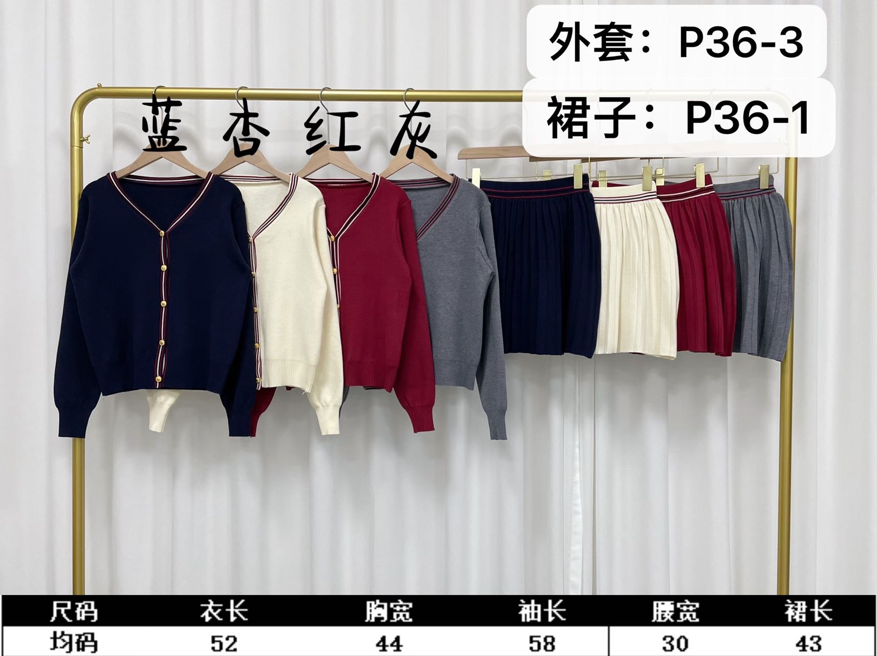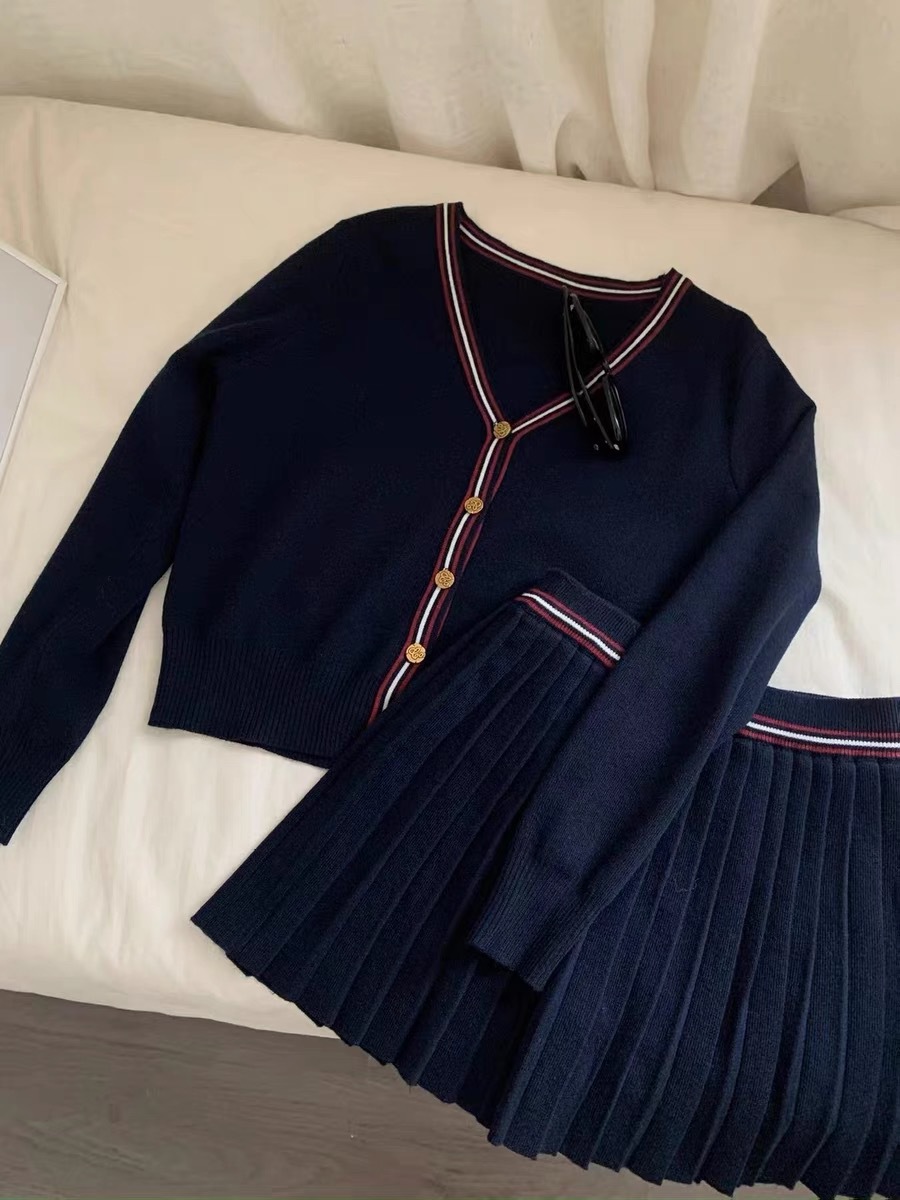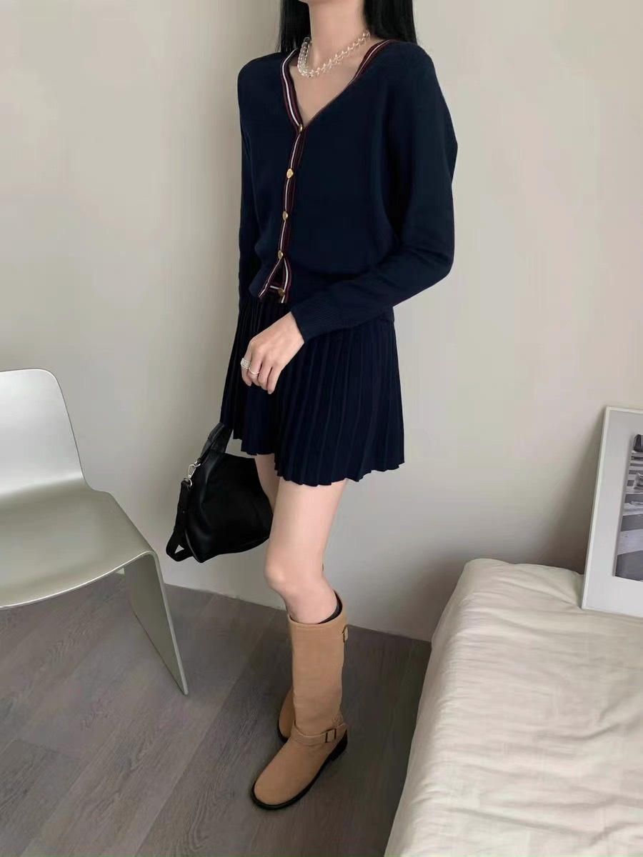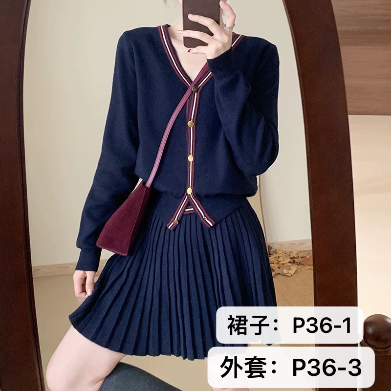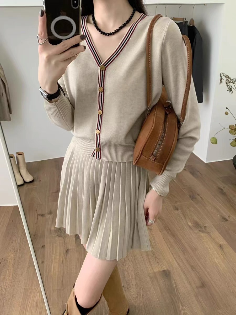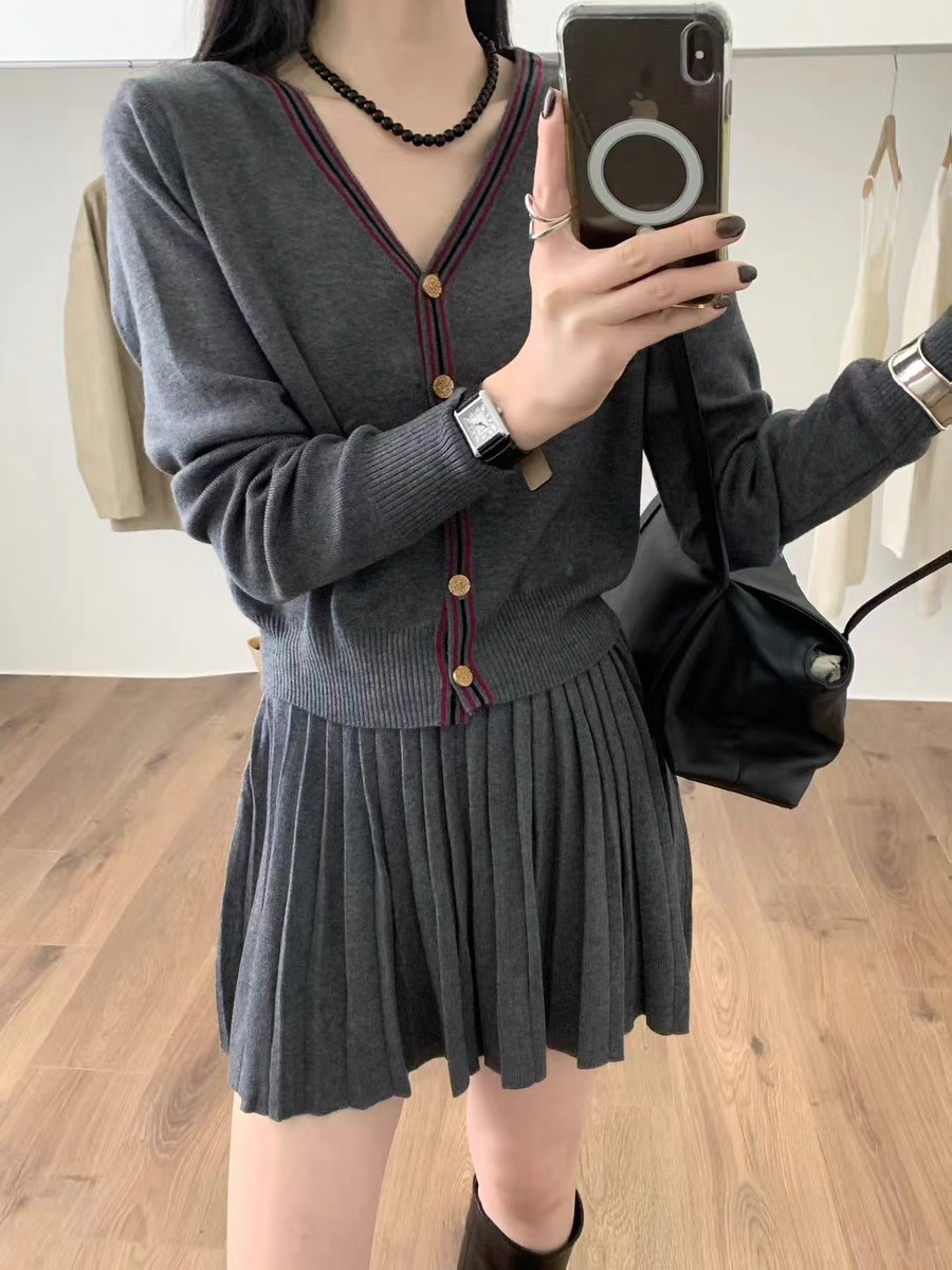가을 신상품 브이넥 배색 니트 가디건 재킷 + 니트 플리츠 스커트 투피스 세트 여성복