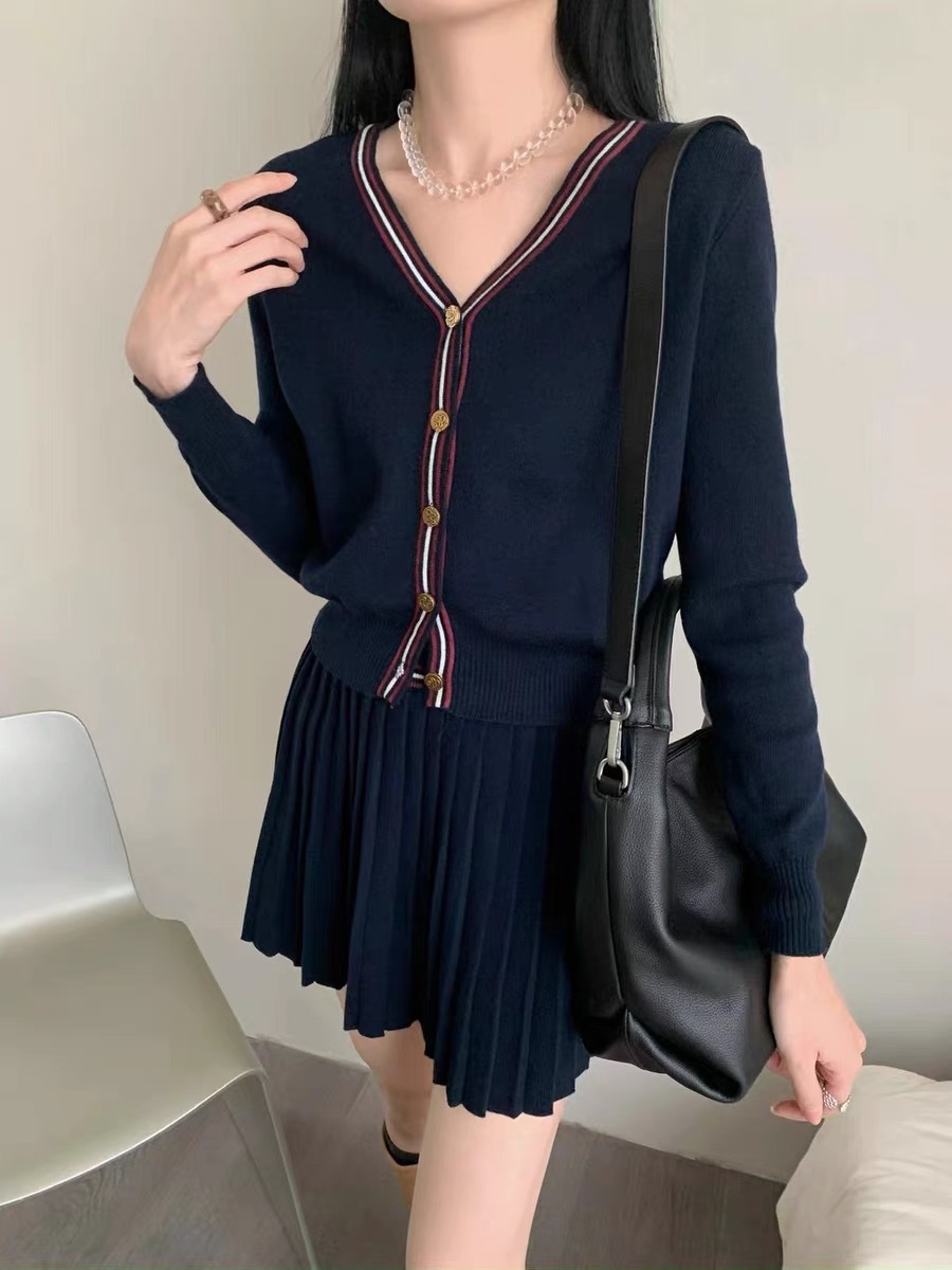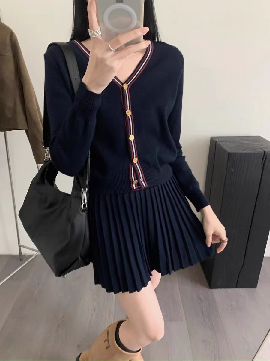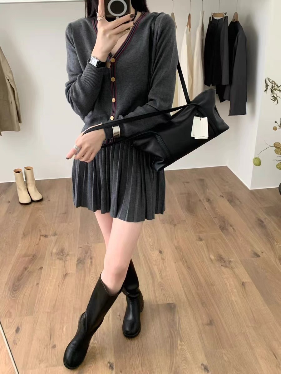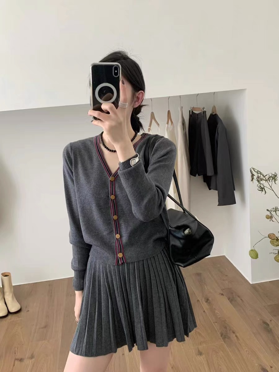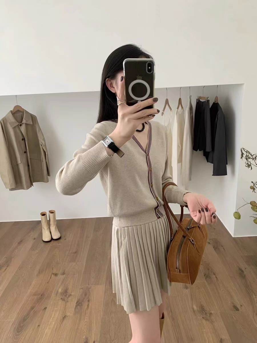 가을 신상품 브이넥 배색 니트 가디건 재킷 + 니트 플리츠 스커트 투피스 세트 여성복스토어 가기