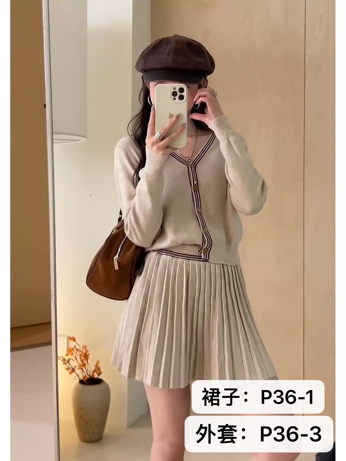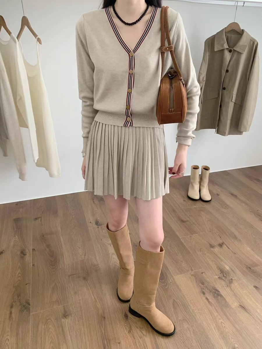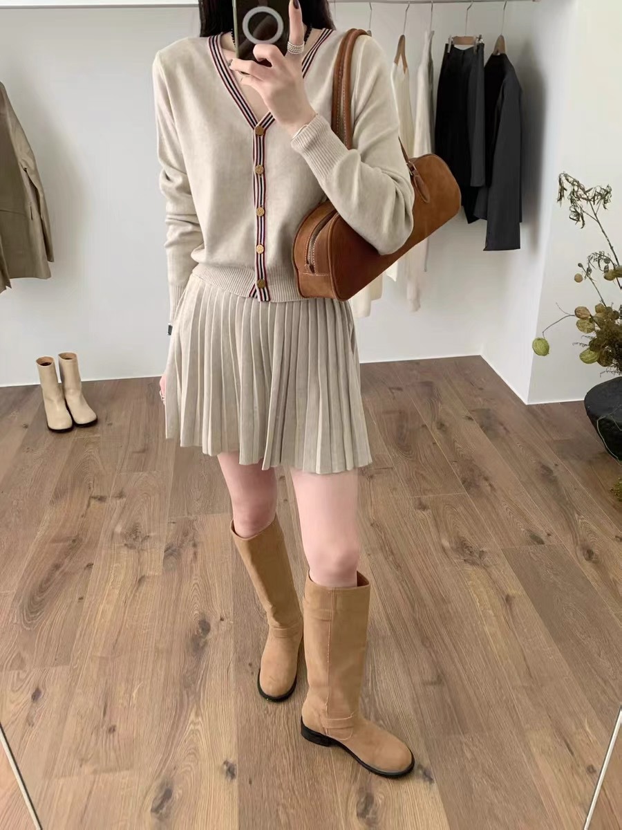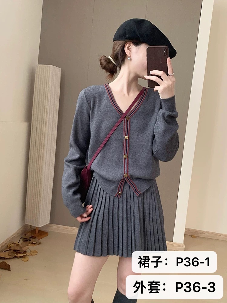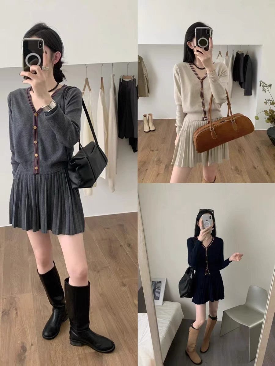 가을 신상품 브이넥 배색 니트 가디건 재킷 + 니트 플리츠 스커트 투피스 세트 여성복스토어 가기