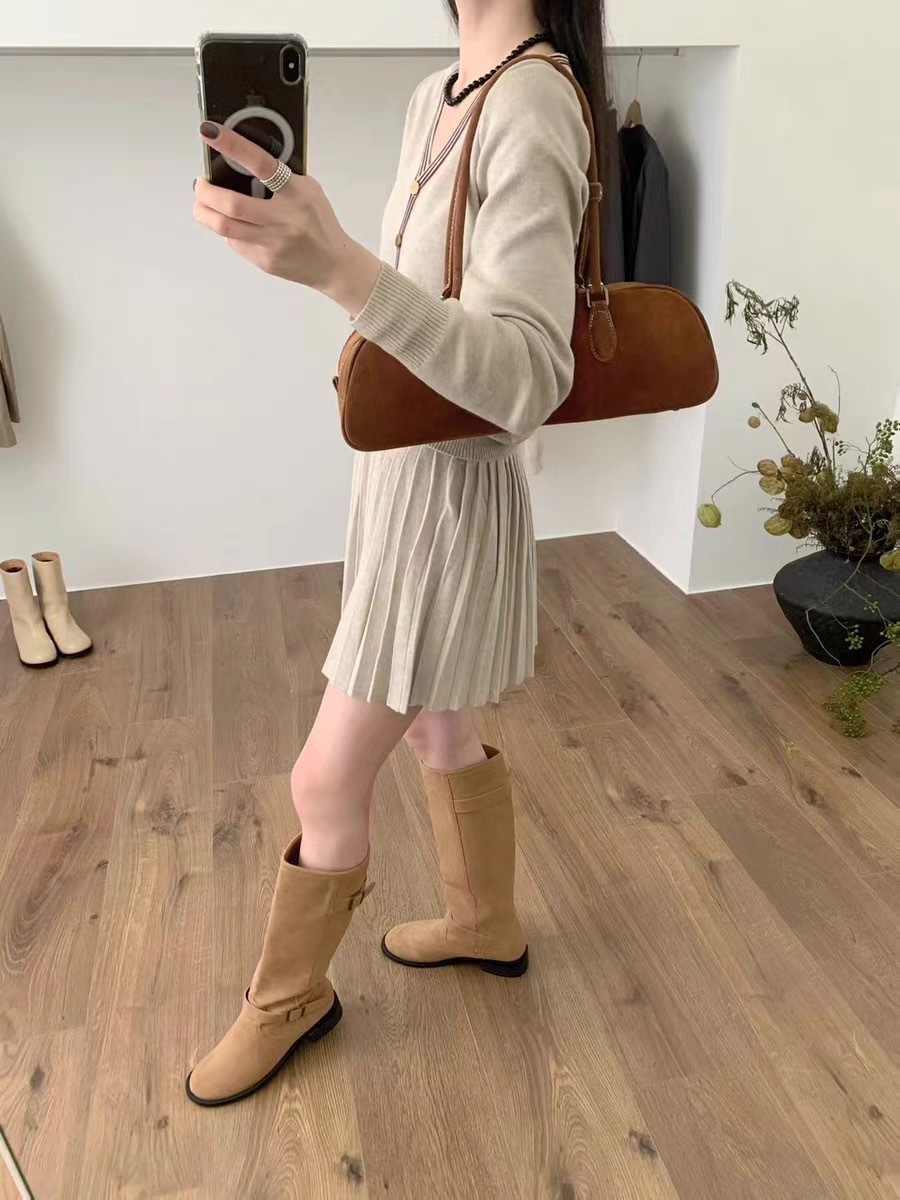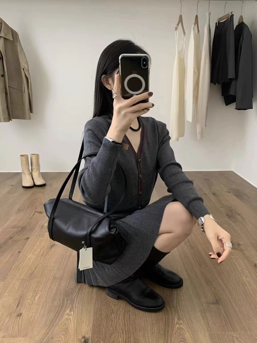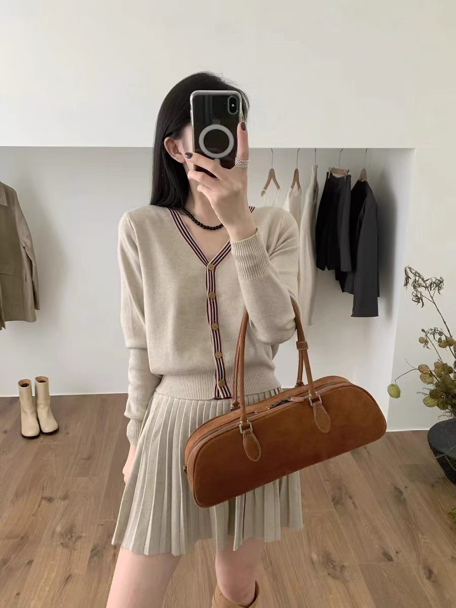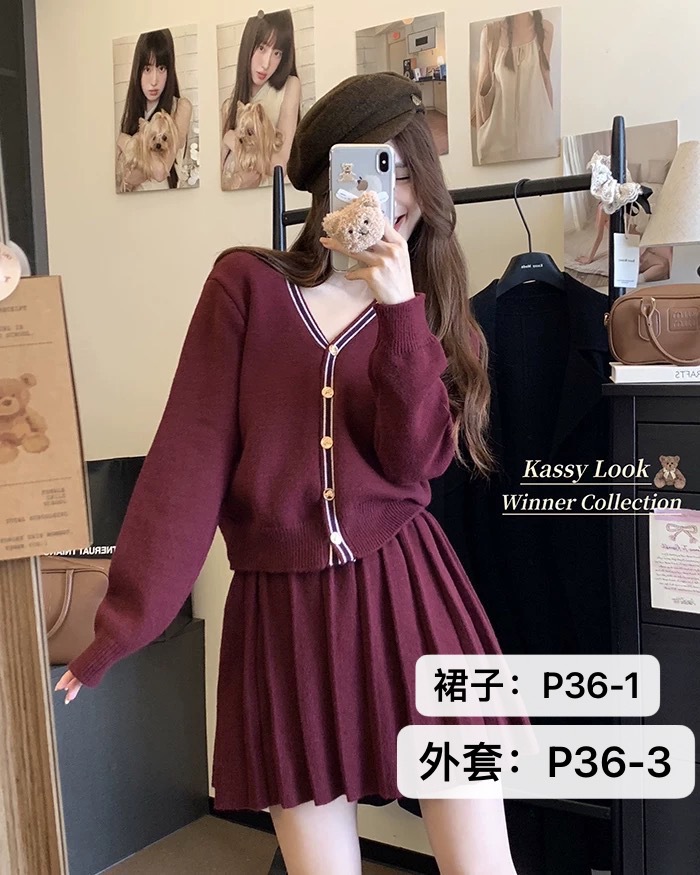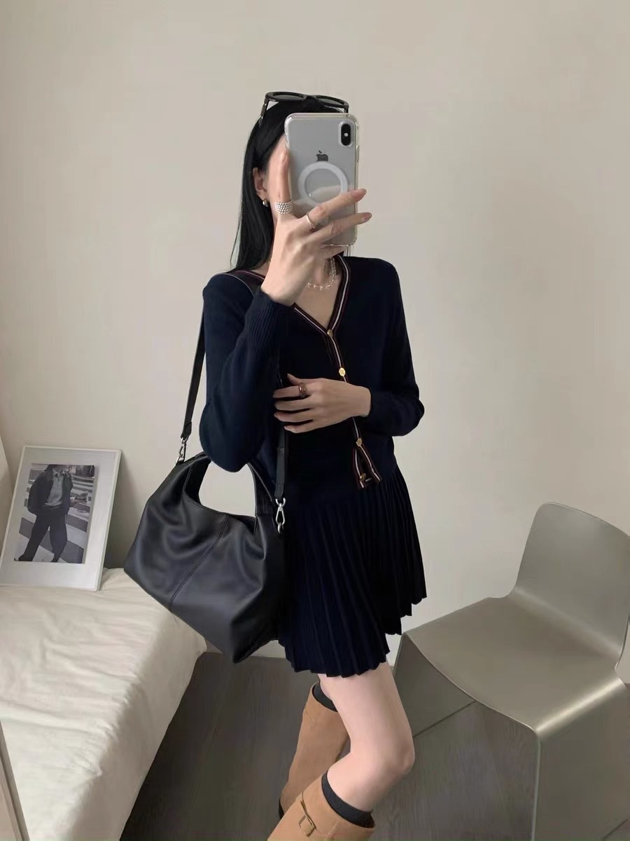 가을 신상품 브이넥 배색 니트 가디건 재킷 + 니트 플리츠 스커트 투피스 세트 여성복스토어 가기