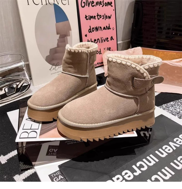 2024 겨울 새 서리 가죽 스티치 스노우 코튼 부츠 쁘띠 여성용 동북 코튼 슈즈를위한 두꺼운 바닥 스폰지