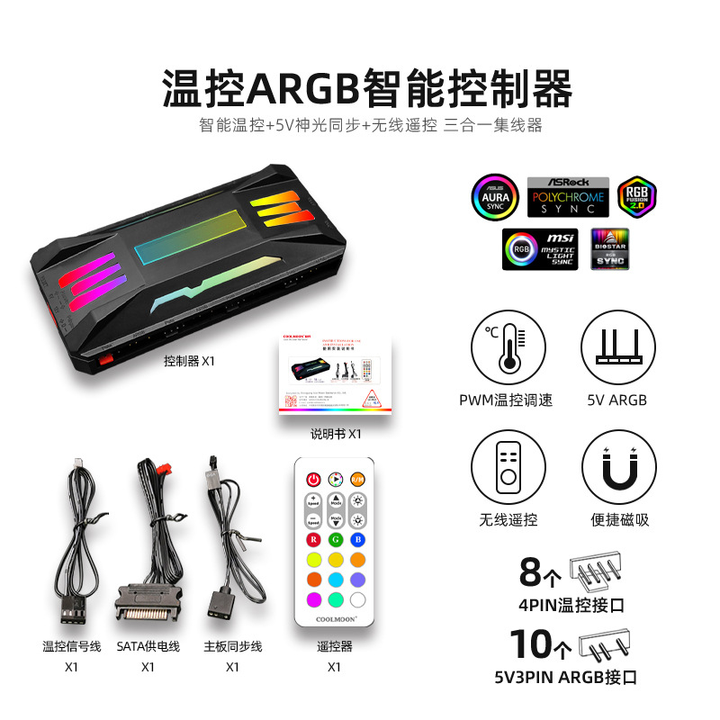 ARGB 팬 컨트롤러 SATA 5V3 핀 허브 PWM 온도 제어 데스크톱 컴퓨터 섀시 원격 제어 조명