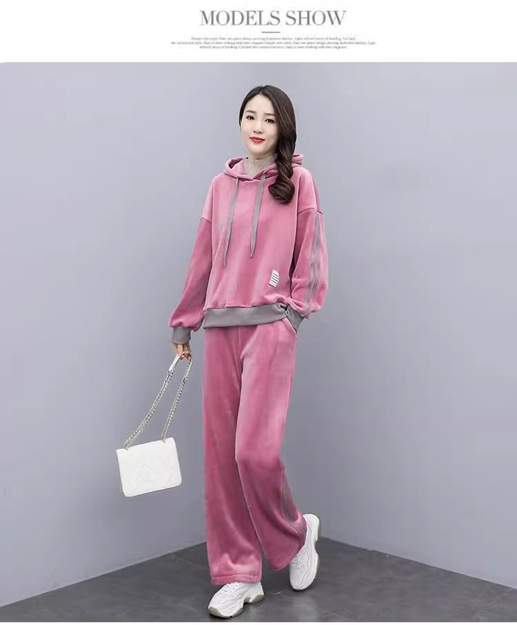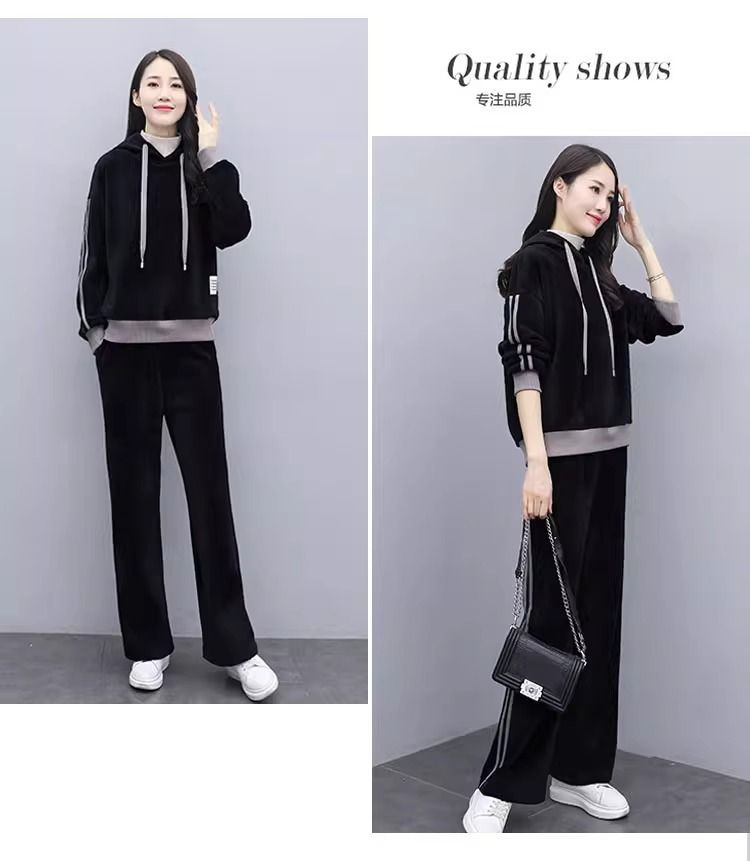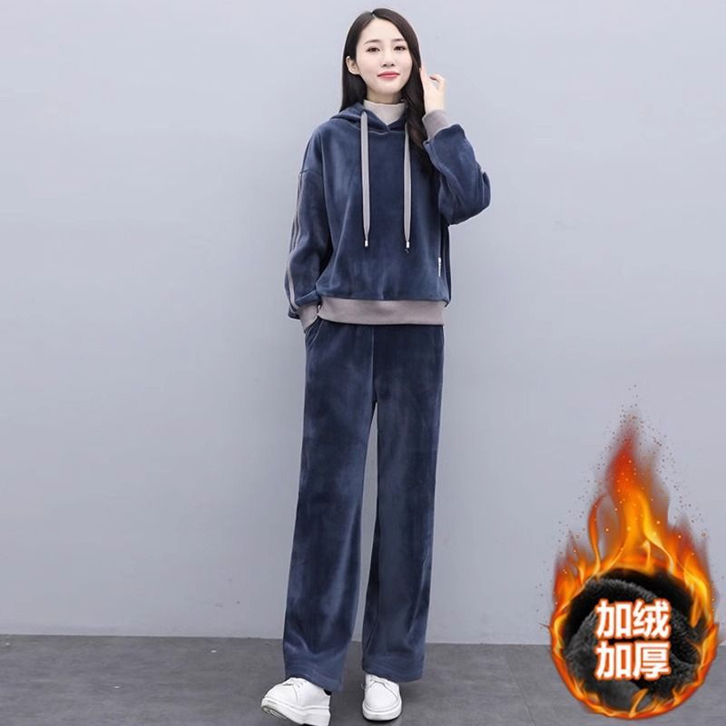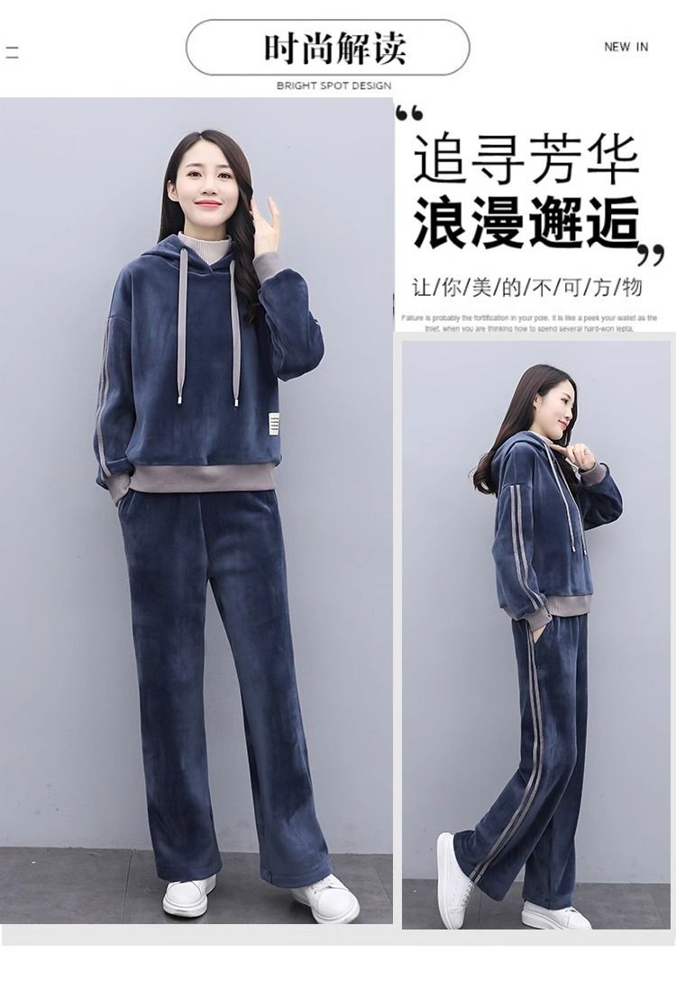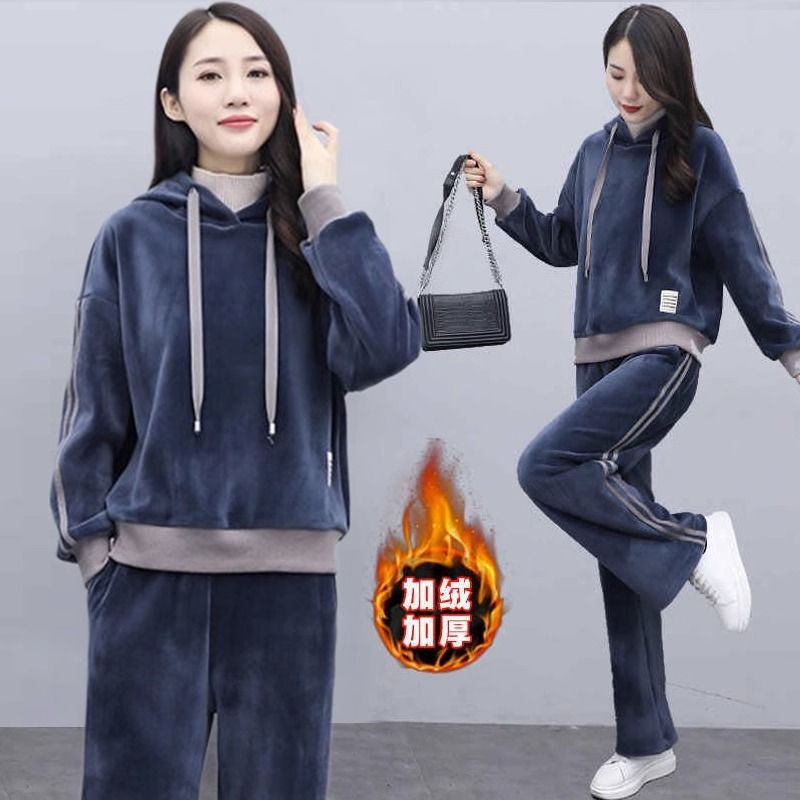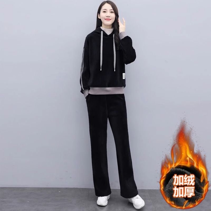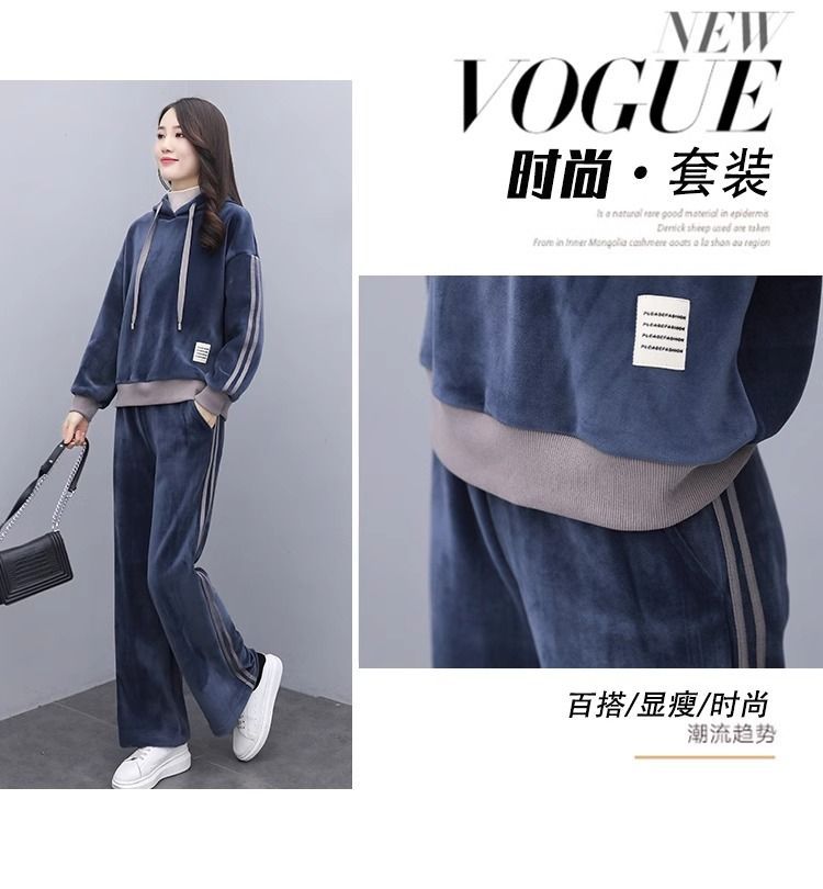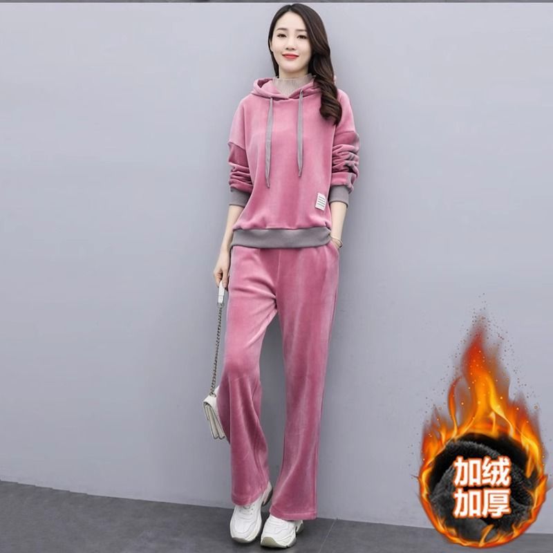 패션 골드 벨벳 세트 여성의 가을과 겨울 새로운 두꺼운 기모 한국 스타일 2024 느슨한 후드 스웨터 투피스 유행 세트스토어 가기
