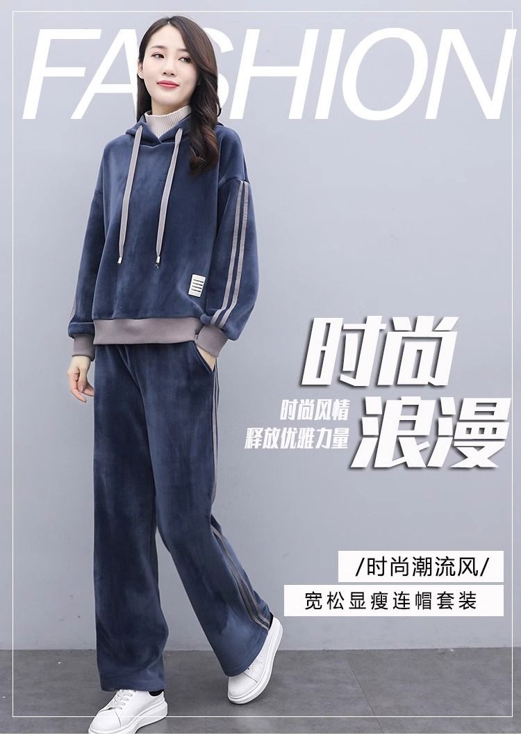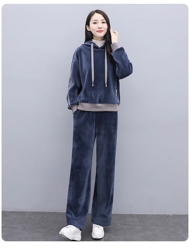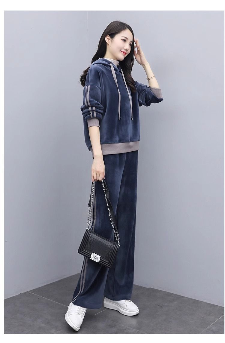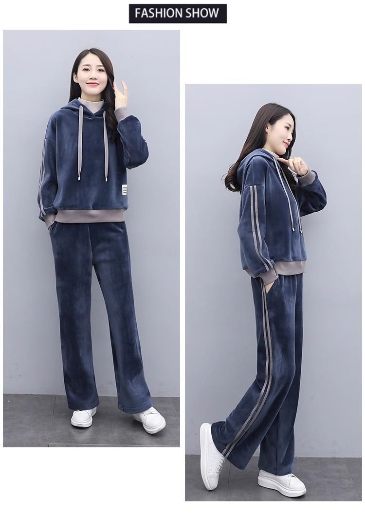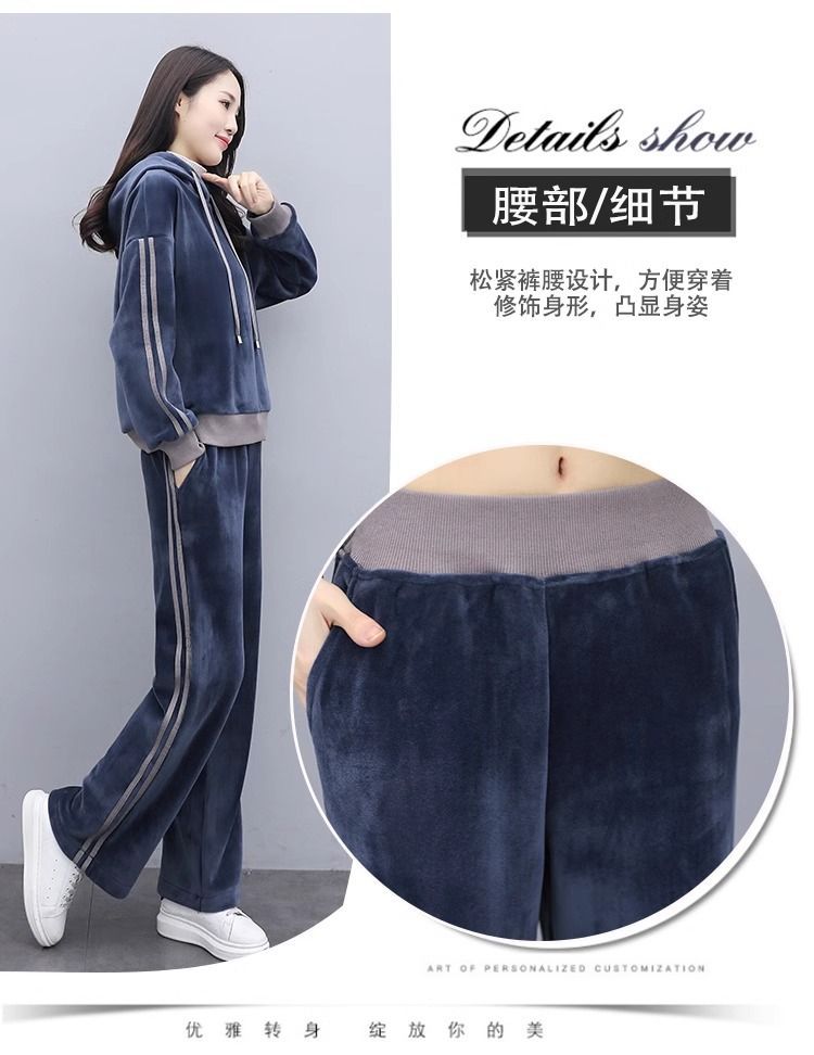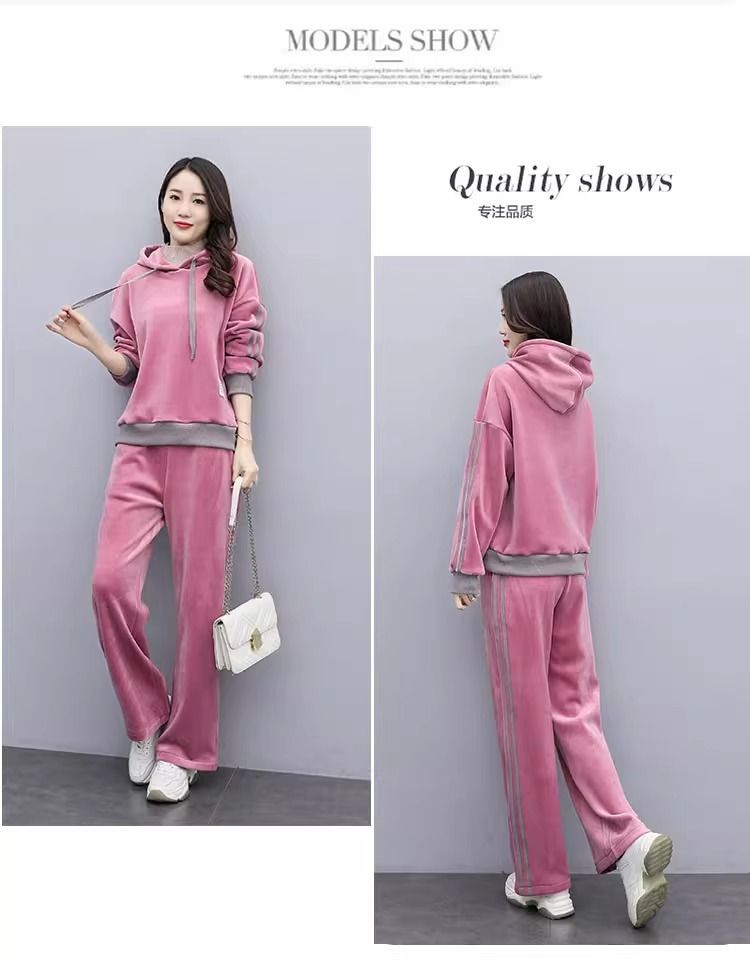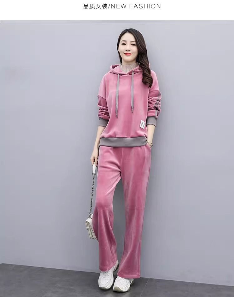 패션 골드 벨벳 세트 여성의 가을과 겨울 새로운 두꺼운 기모 한국 스타일 2024 느슨한 후드 스웨터 투피스 유행 세트스토어 가기