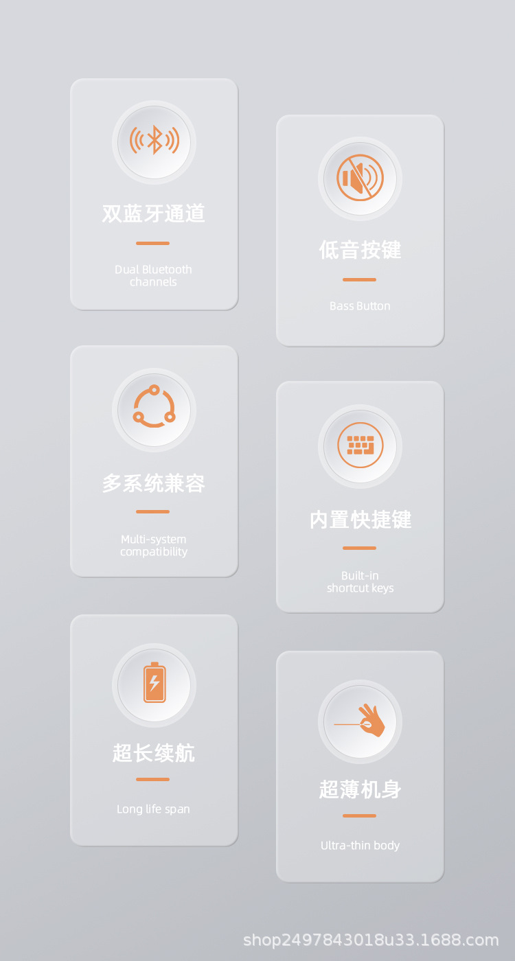 工厂直销品质有保障有黑白两款颜色键盘响应速度快,低噪音,低功耗,可链接三个设备、支持一件代发贴标签等服务, 兼容苹果系统 安卓系统 Windows,量大价优,感兴趣可以找客服聊一聊