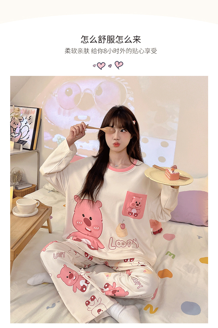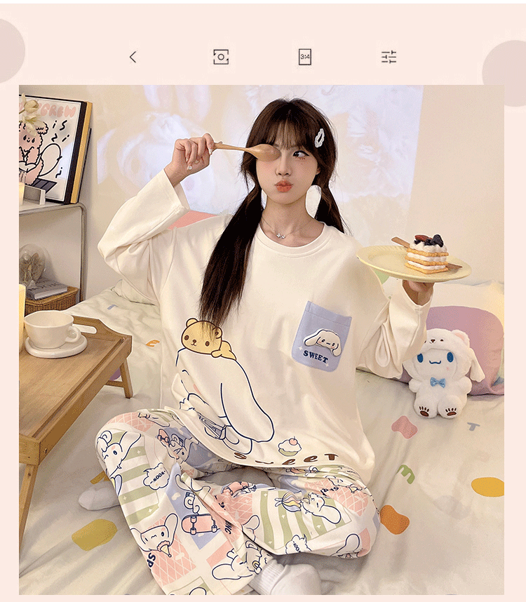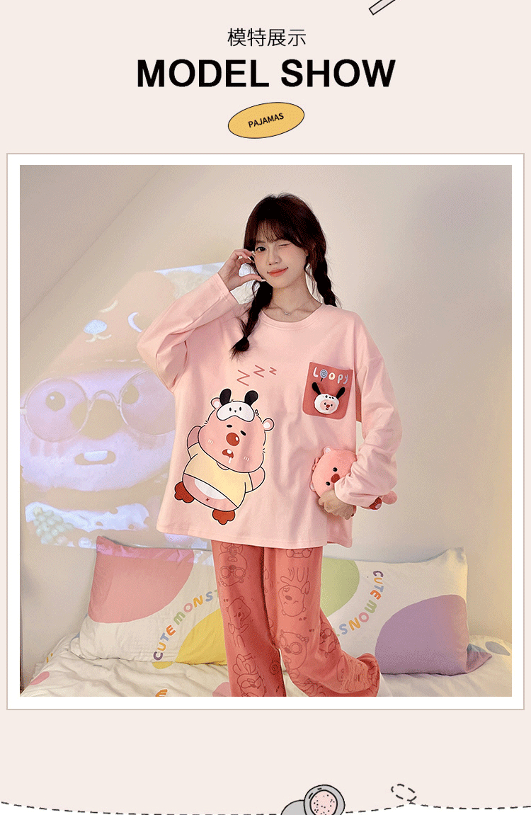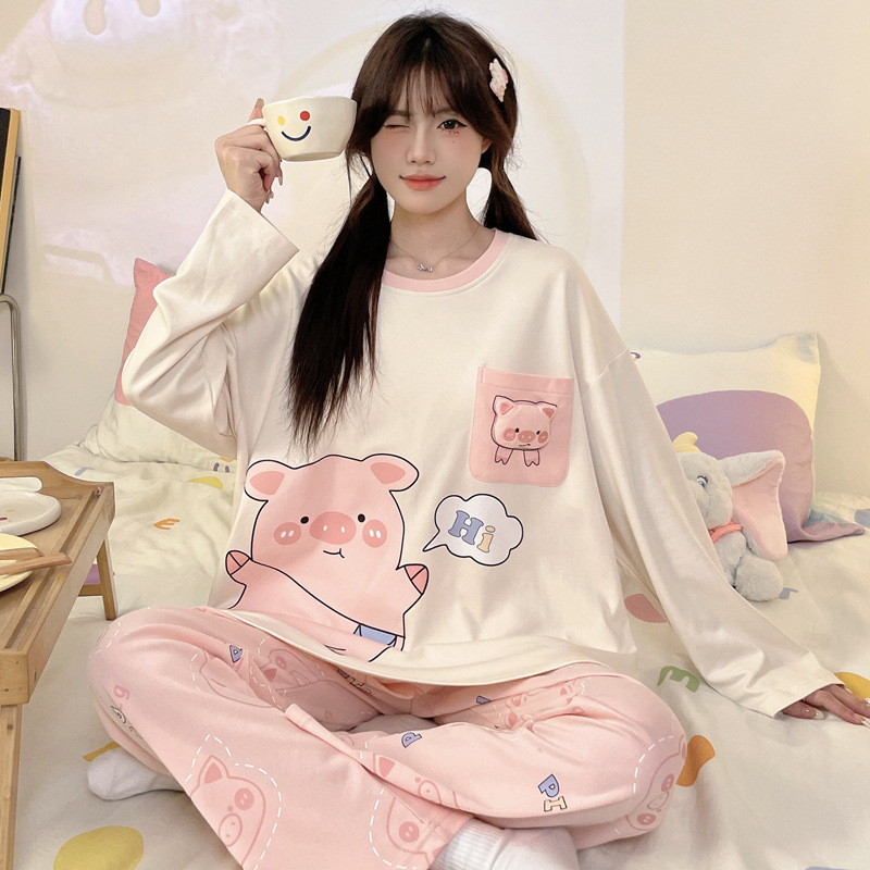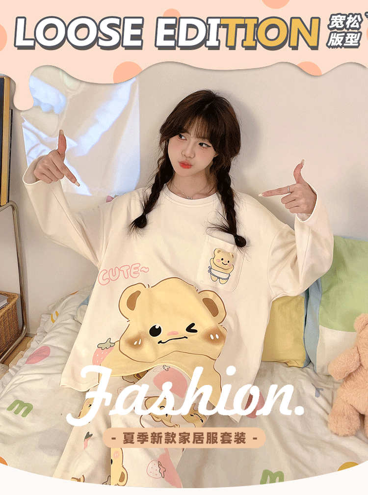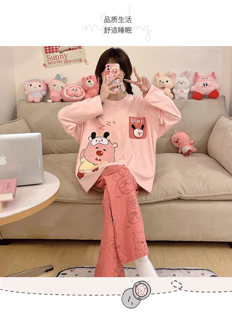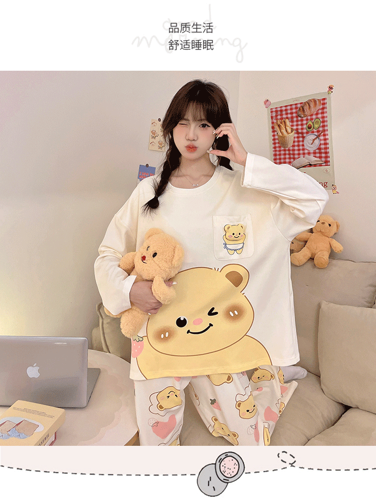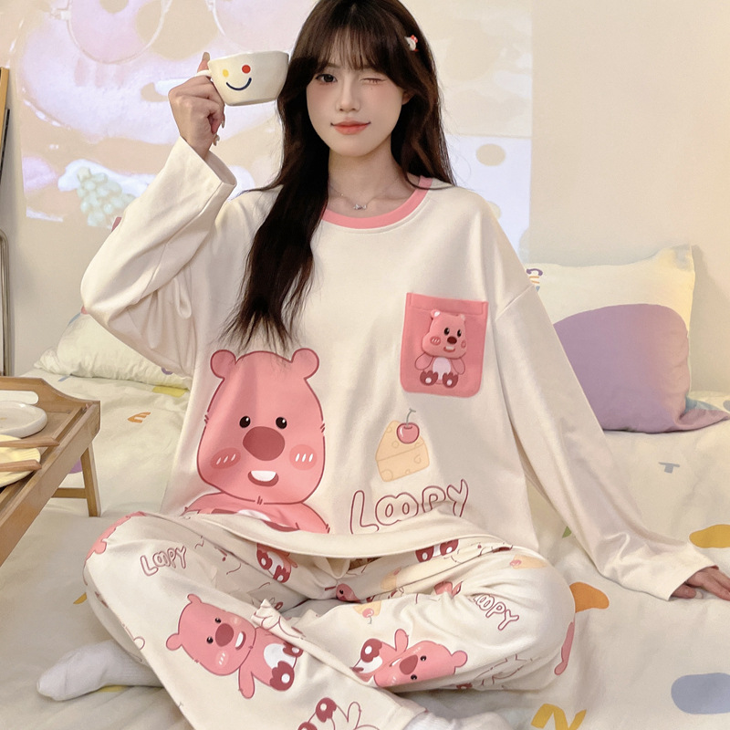 파자마 여성의 봄과 가을 2024 새로운 기숙사 세트 인형 만화 플러스 사이즈 가정 옷은 학생 밖에서 입을 수 있습니다.스토어 가기