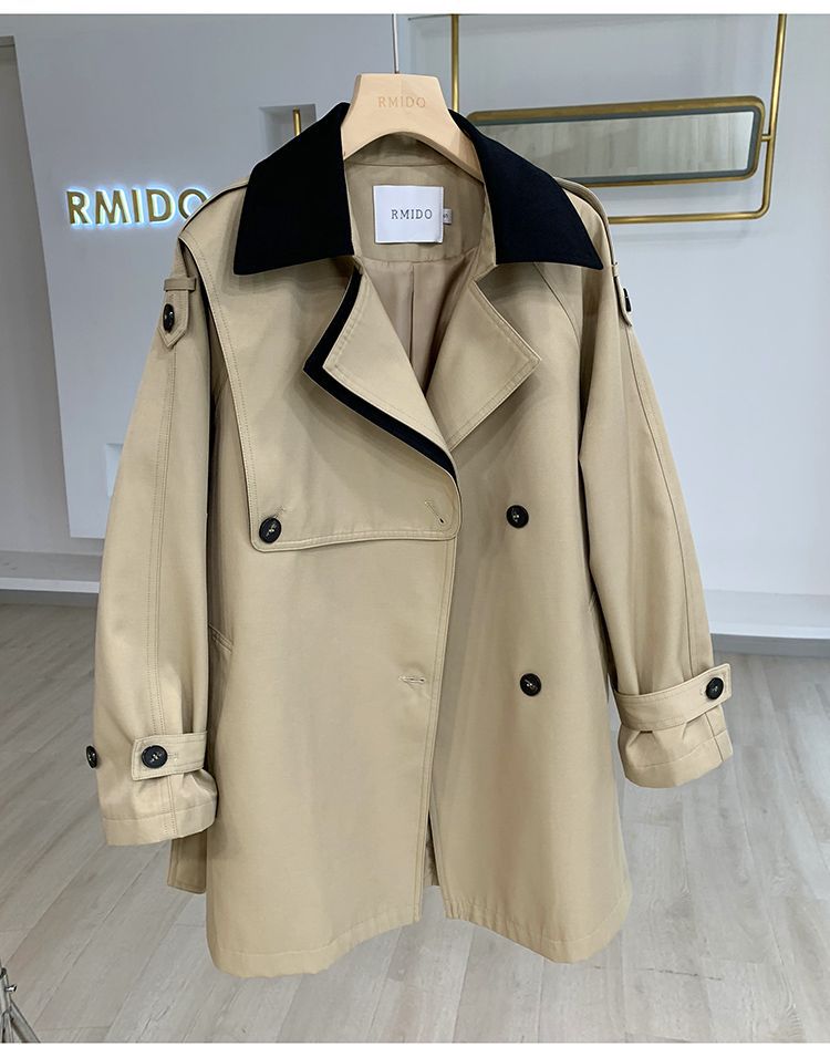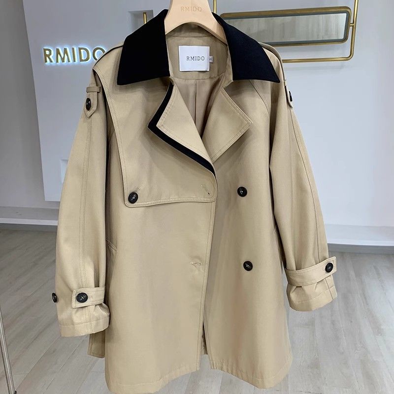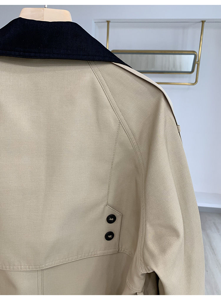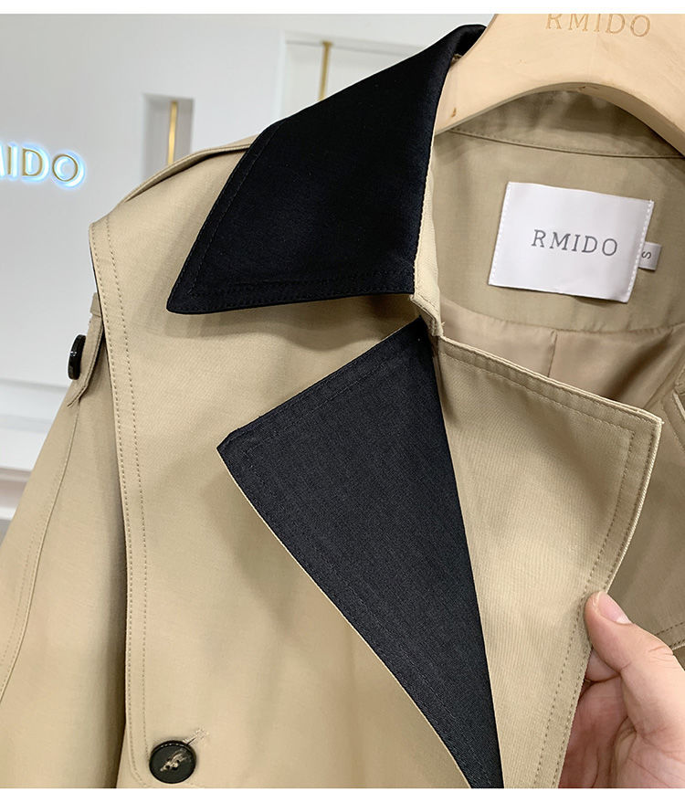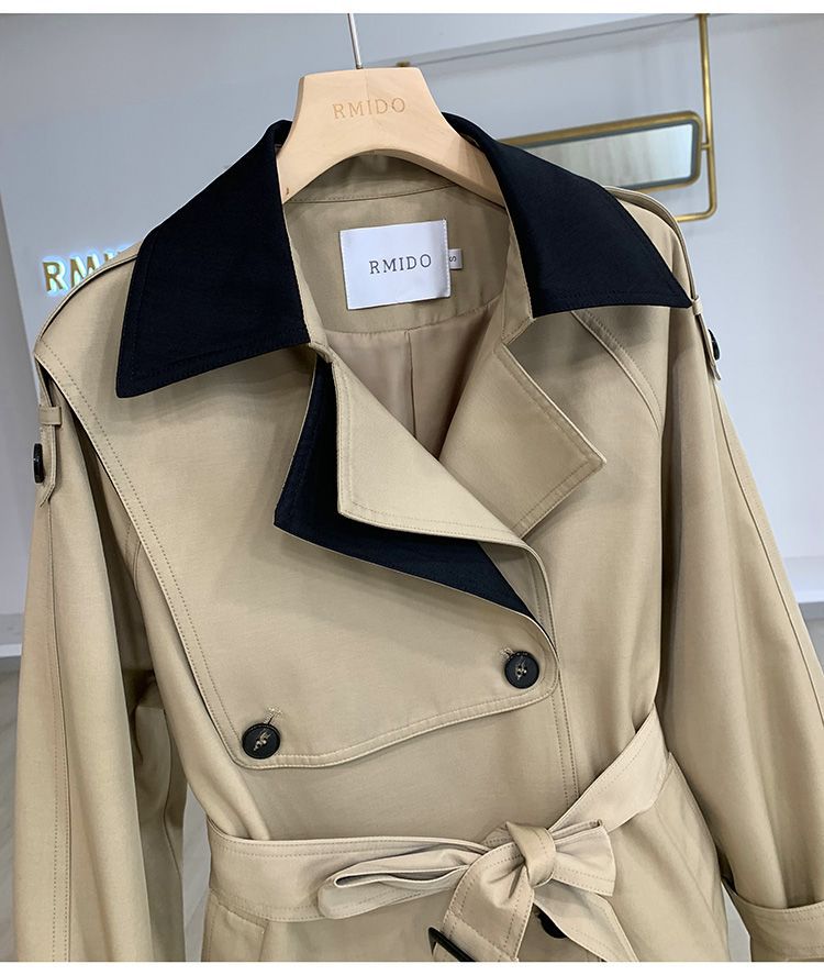 디자인 감각 스티칭 대비 색상 인기있는 긴 윈드 브레이커 여성의 허리 슬리밍 코트 봄 새로운 작은 2024스토어 가기