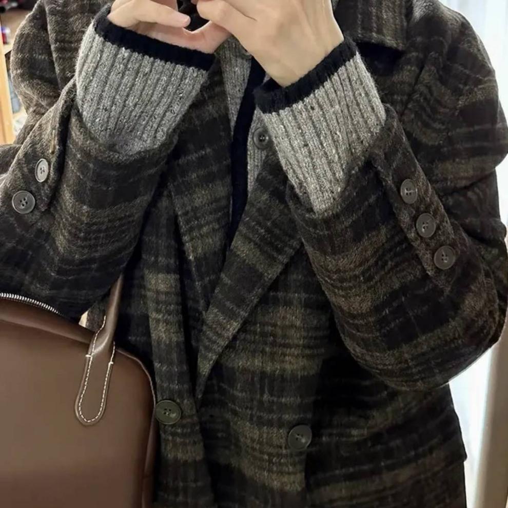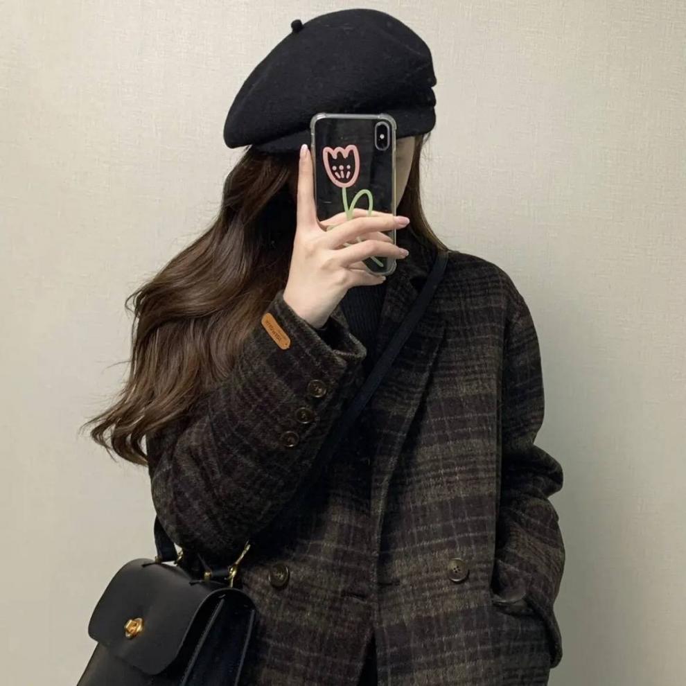 빈티지 샤넬 스타일 격자 무늬 모직 세트 코트 2024 가을과 겨울 새로운 한국 스타일 두꺼운 슬리밍 올 매치 모직