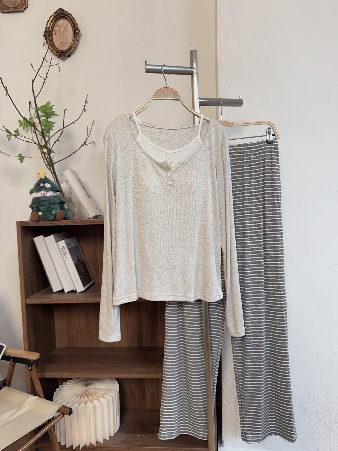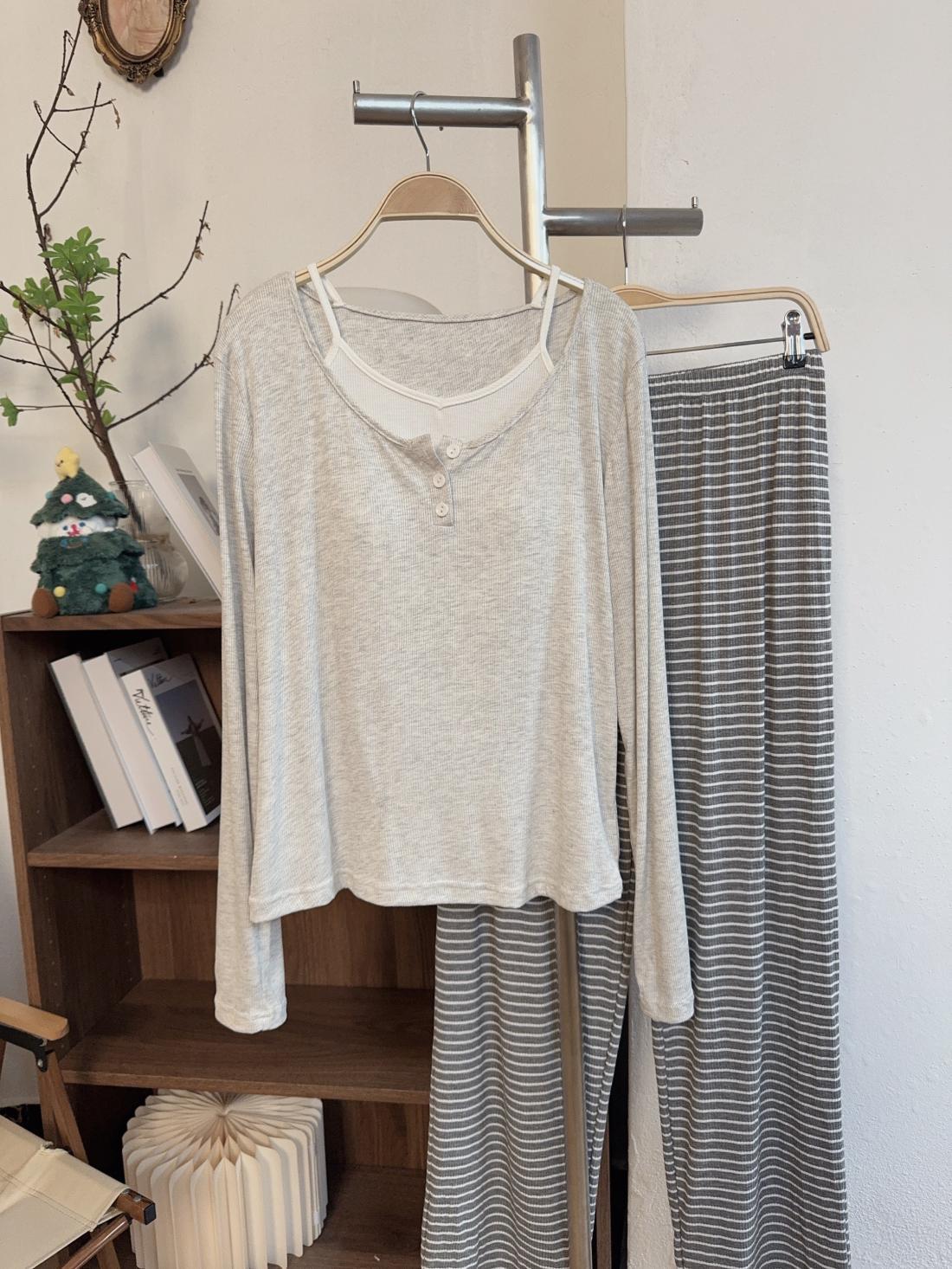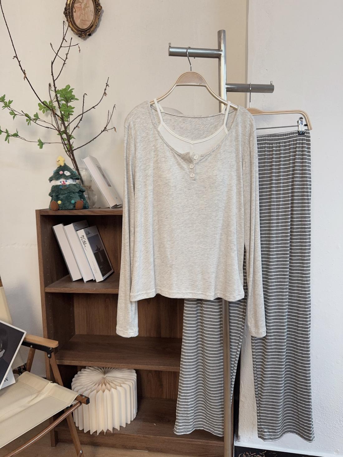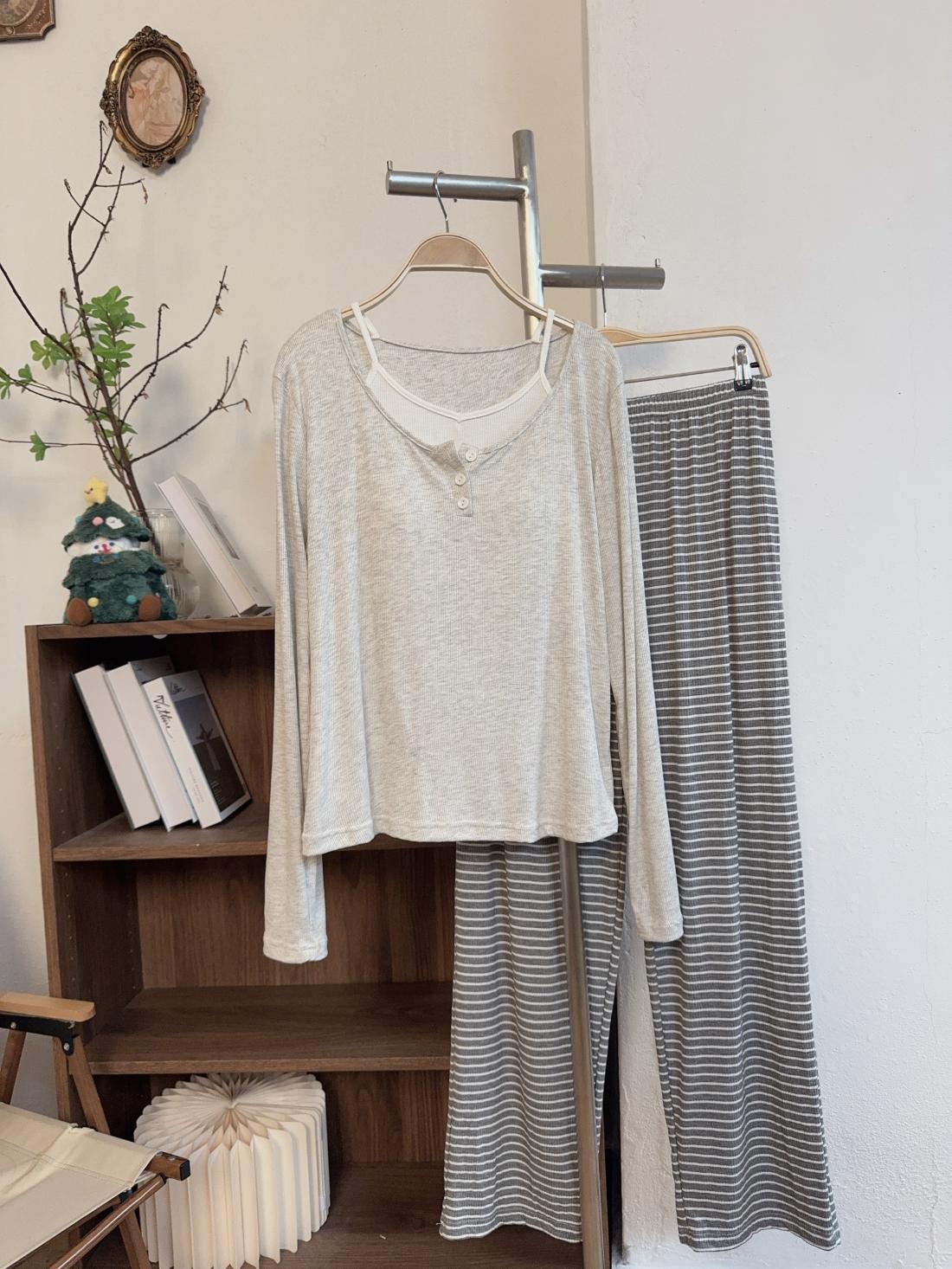 모달 파자마 여성의 봄 가을 겨울 가짜 두 조각 긴 소매 가슴 패드 의상 캐주얼 홈 의류 투피스 세트스토어 가기