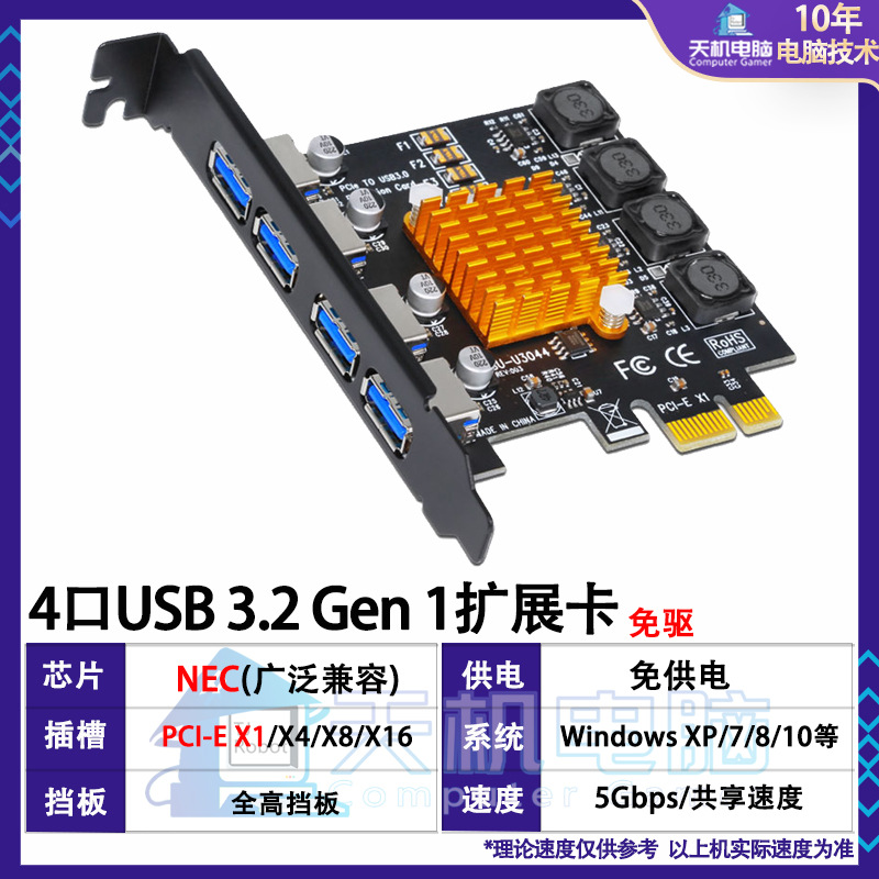 USB 확장 카드 4 포트 후방 PCI-E-usb3.0/3.1/3.2 어댑터 NEC 전면 4 포트 확장 카드