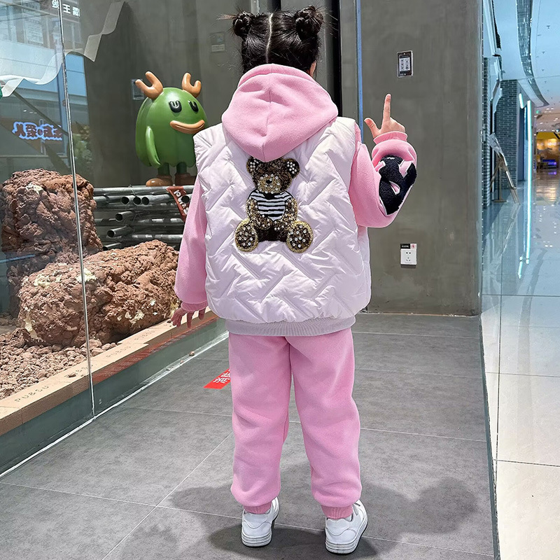 소녀 곰 조끼 3 조각 세트 기모 세트 2024 가을 겨울 새로운 어린이 귀여운 땀 세트