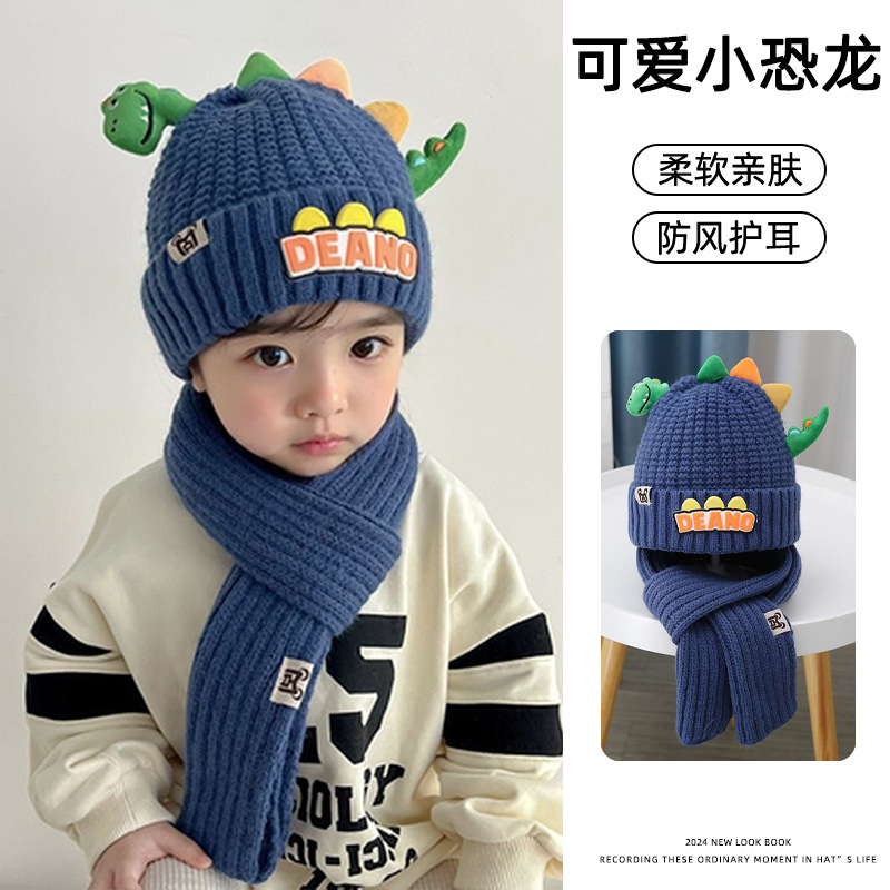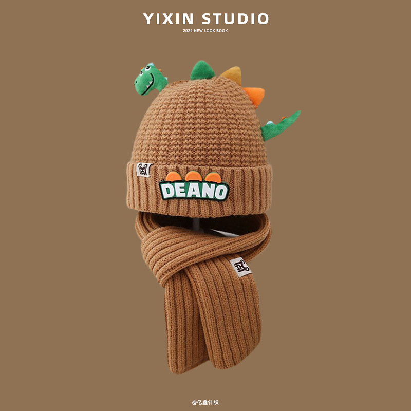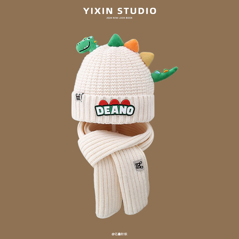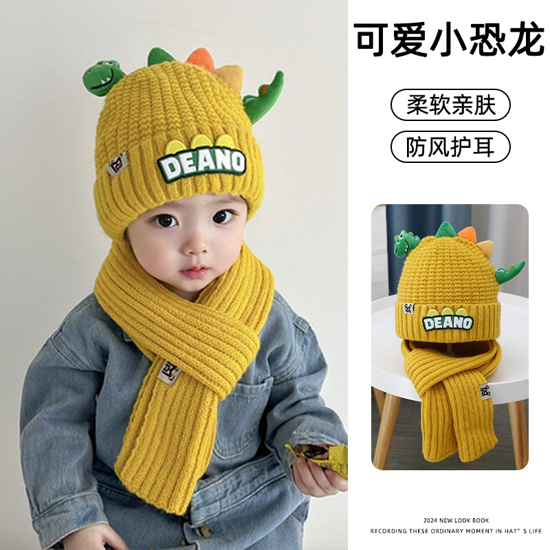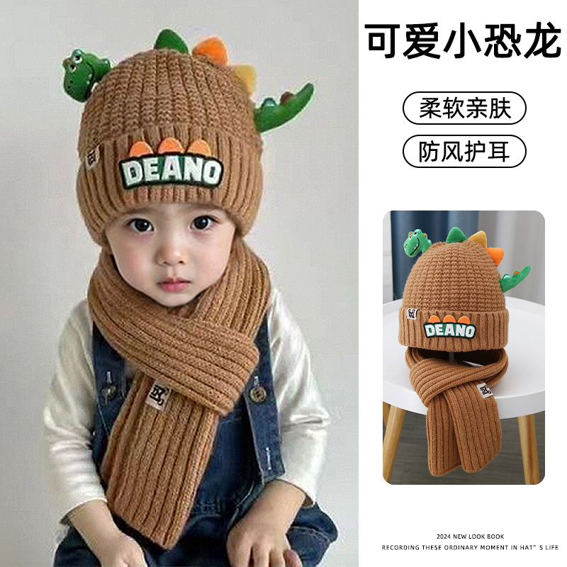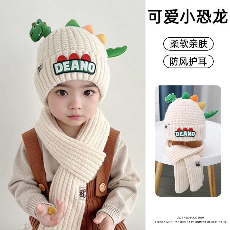 새로운 어린이 모자 스카프 투피스 세트 귀여운 작은 공룡 따뜻한 니트 울 캡 야외 어린이 풀오버 캡스토어 가기