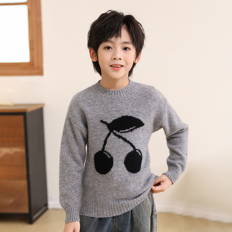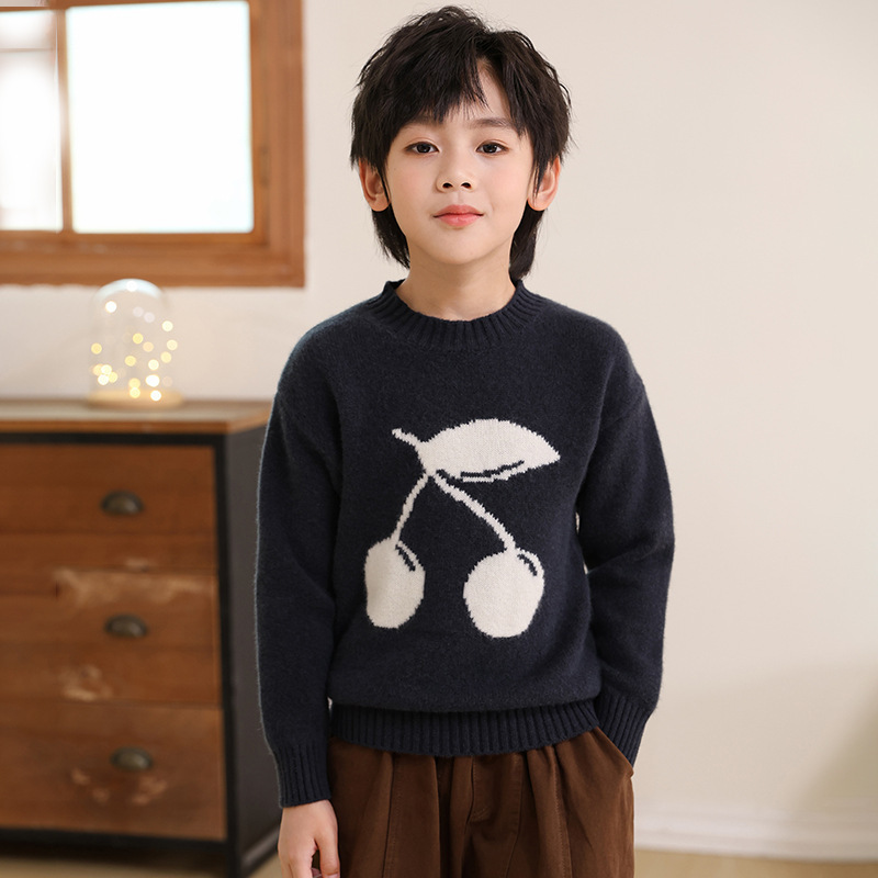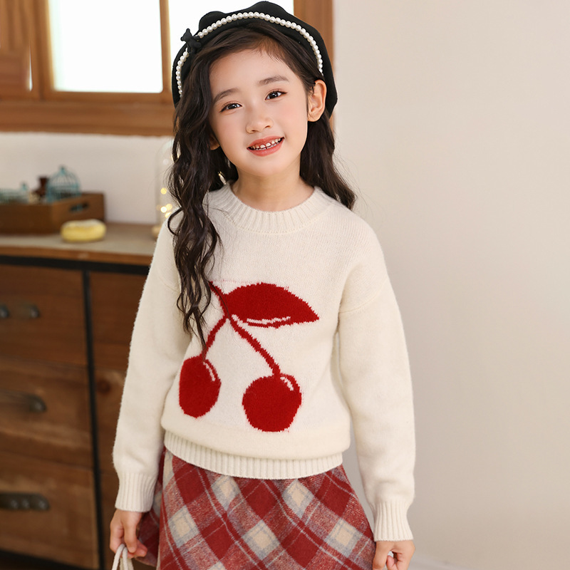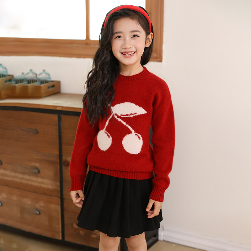 秋冬新款童装提花樱桃羊毛针织衫时尚可爱男女童加厚宽松内搭毛衣