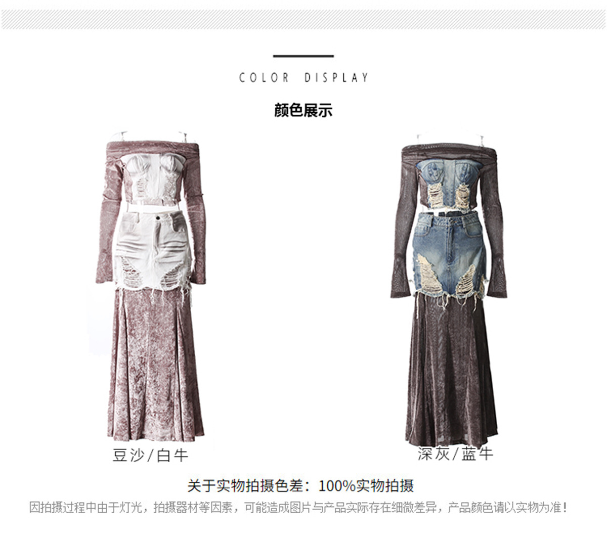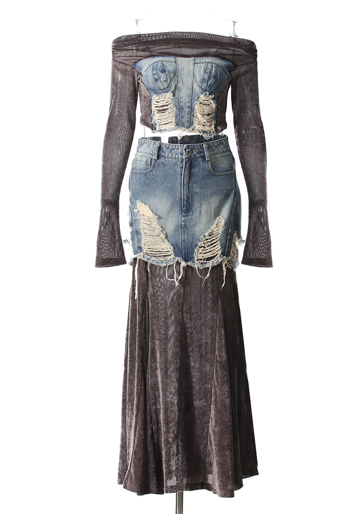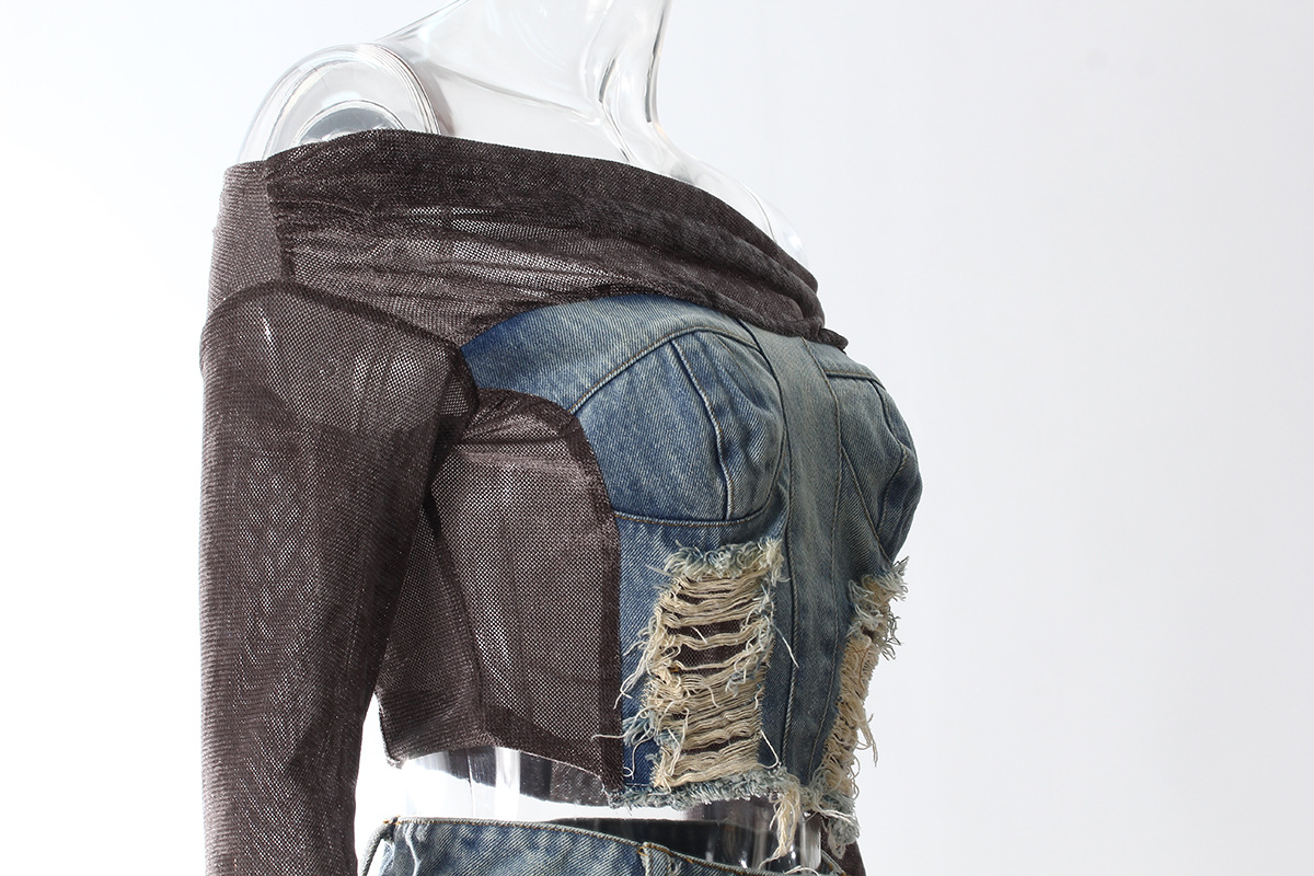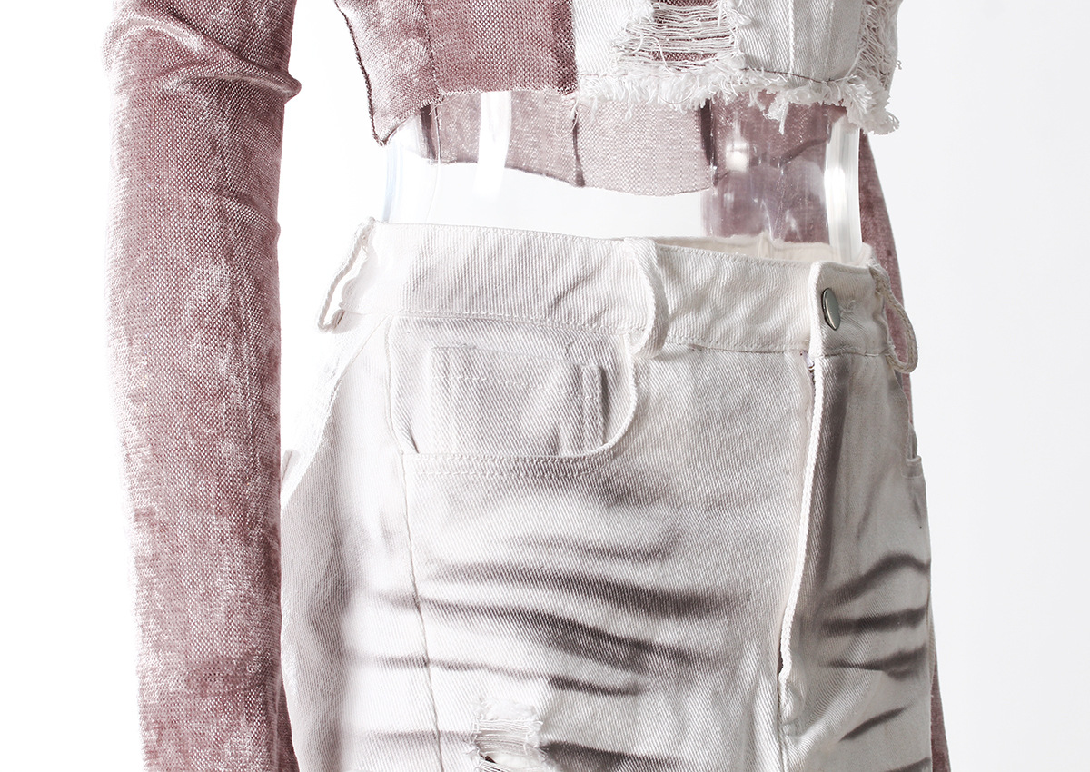 빈티지 데님 스티칭 폐허가 된 오프 숄더 골든 벨벳 긴팔 여성 핫 걸스 Navel Bottoming 탑 스커트 세트스토어 가기