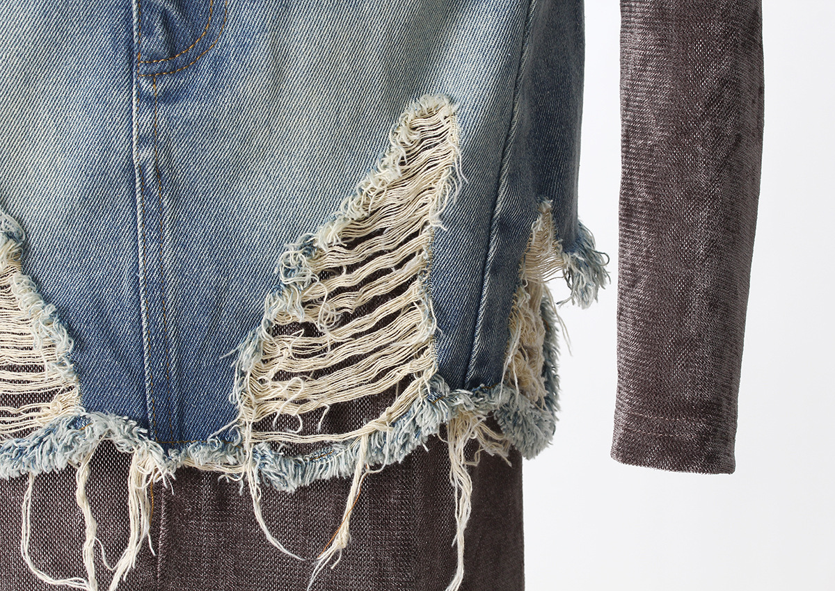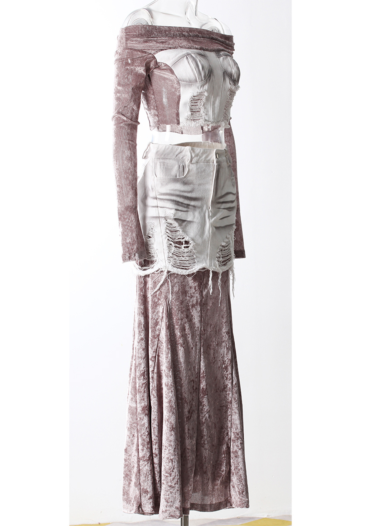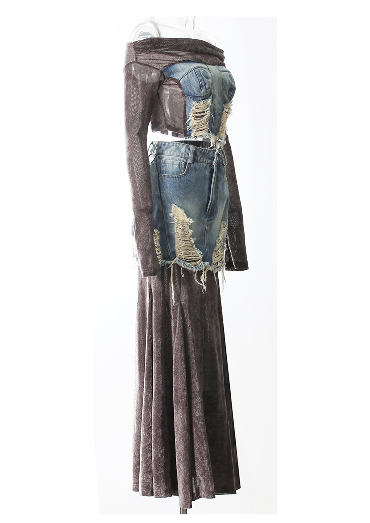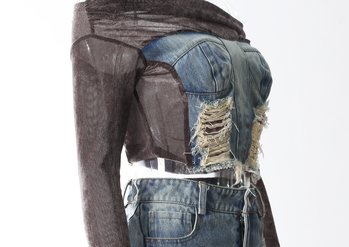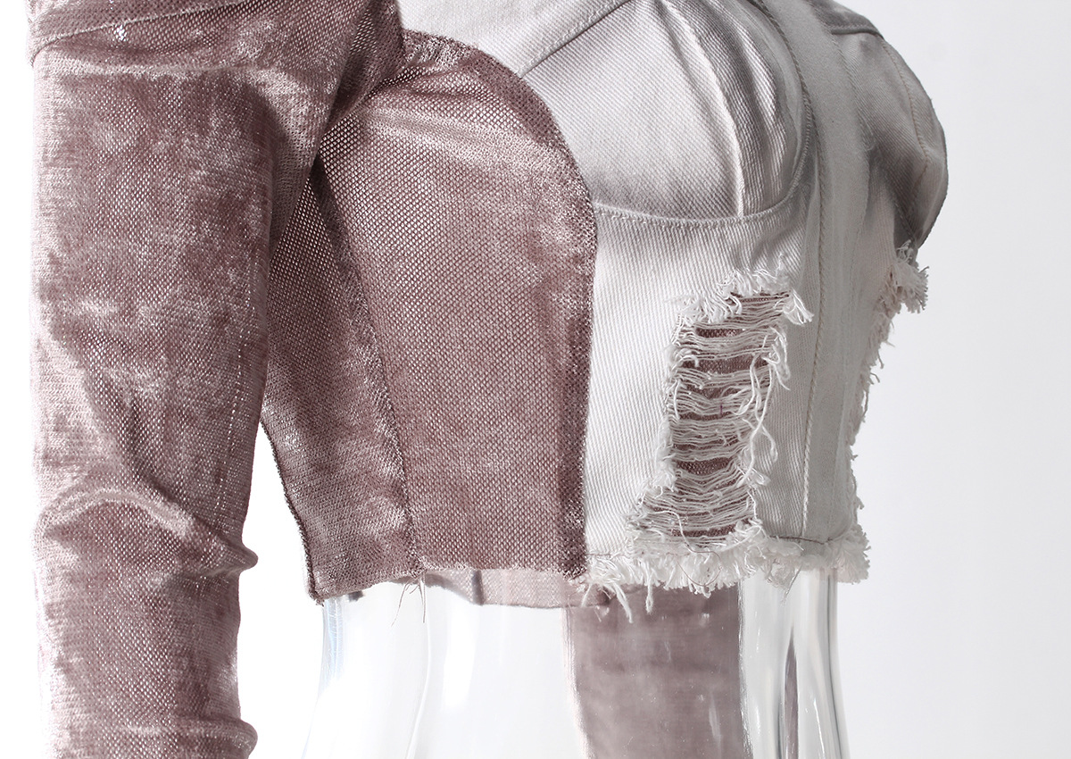 빈티지 데님 스티칭 폐허가 된 오프 숄더 골든 벨벳 긴팔 여성 핫 걸스 Navel Bottoming 탑 스커트 세트스토어 가기