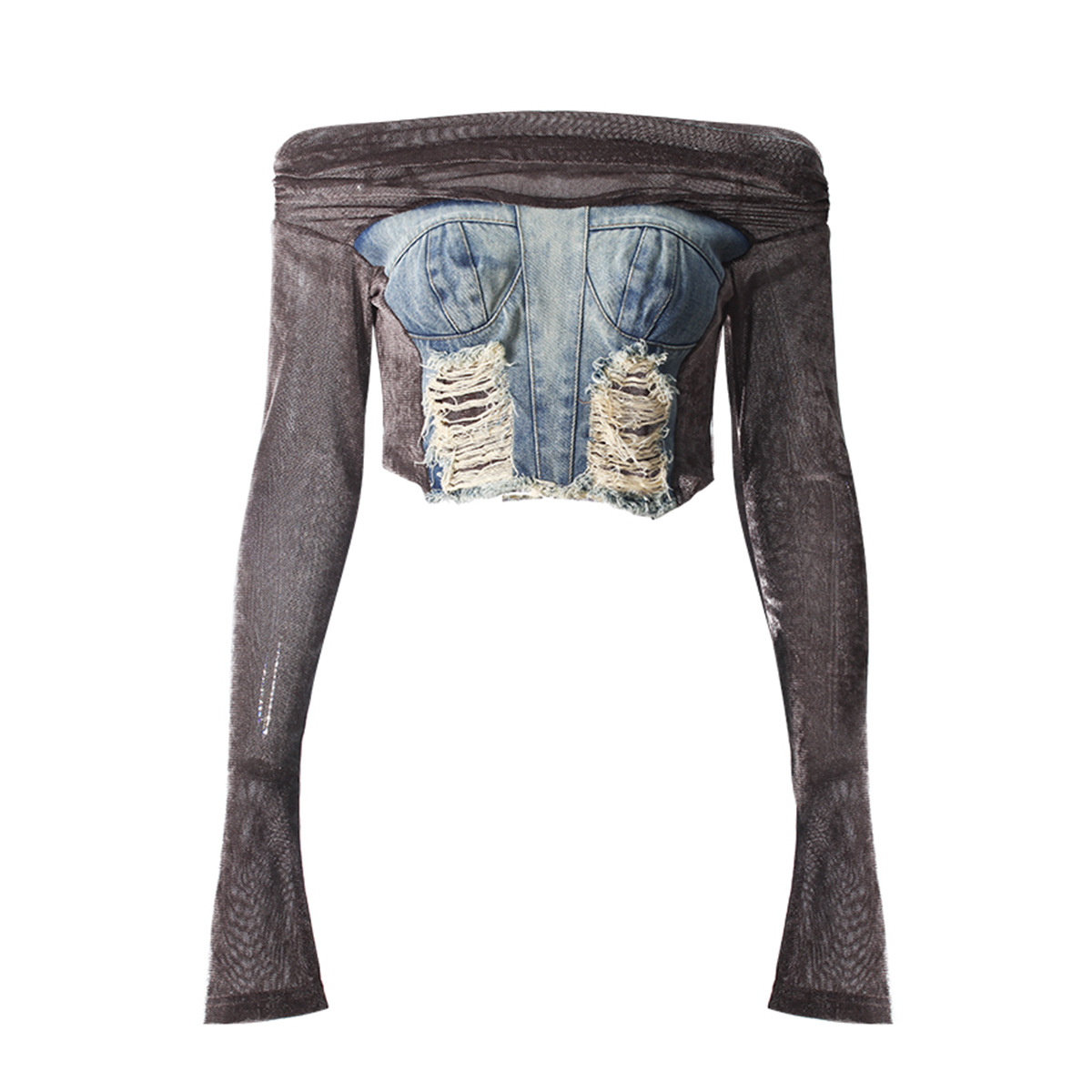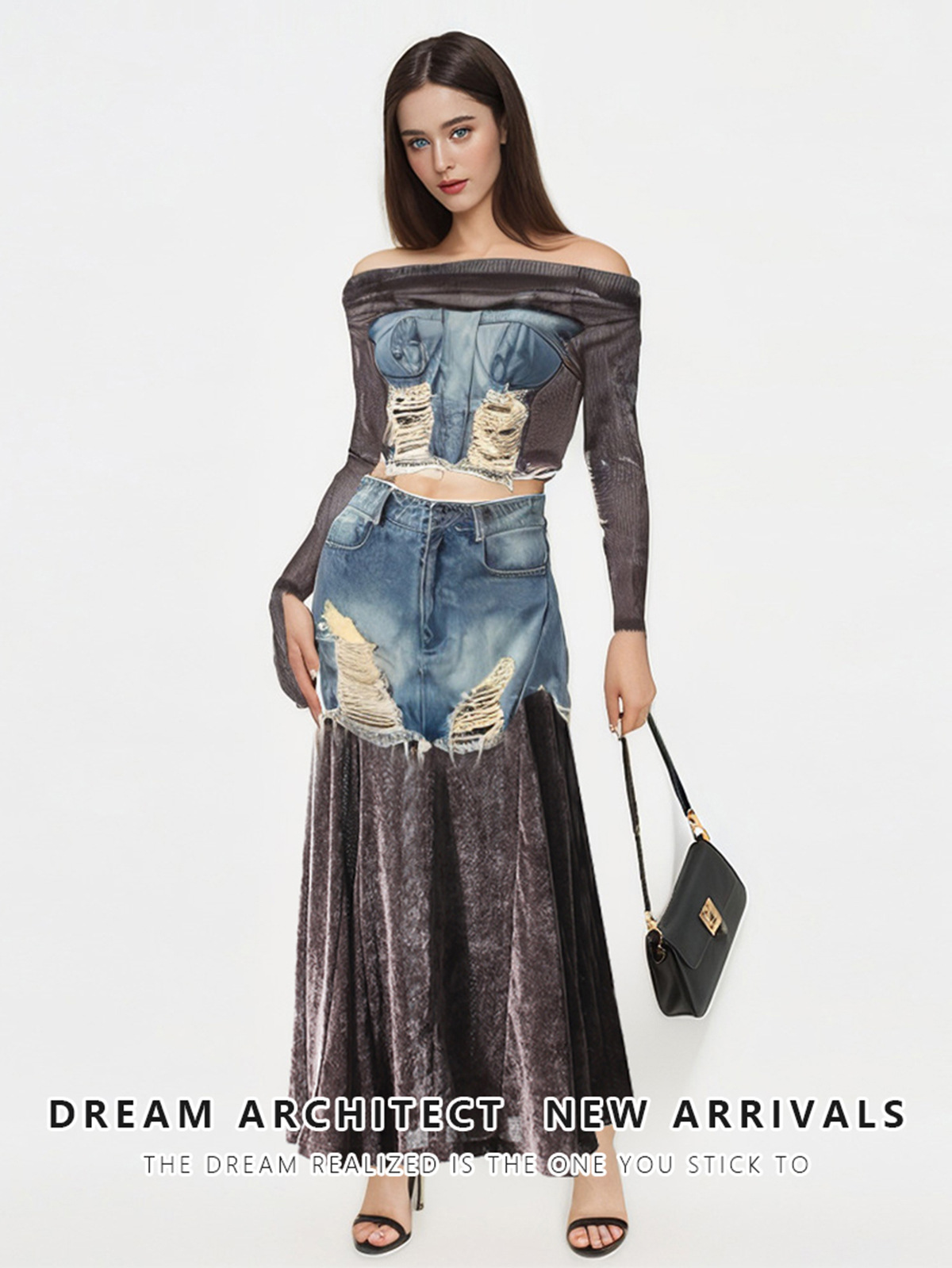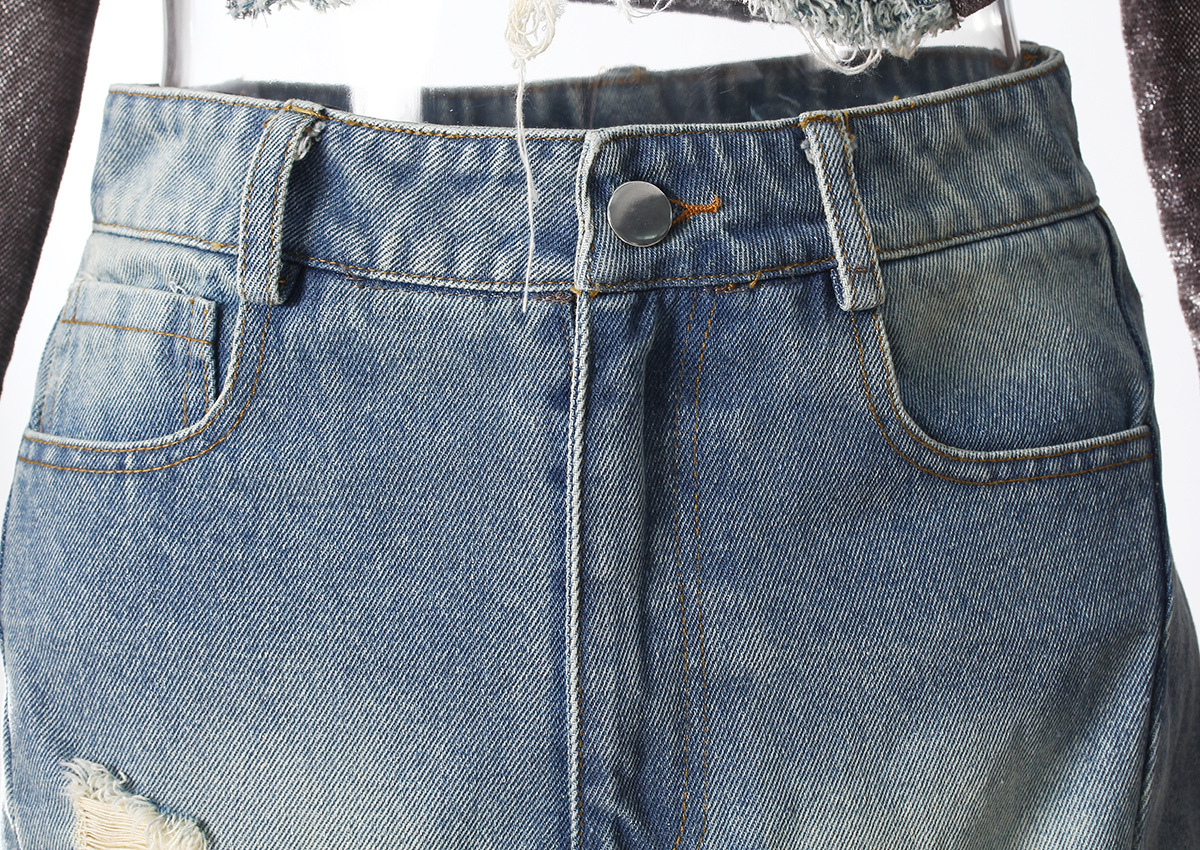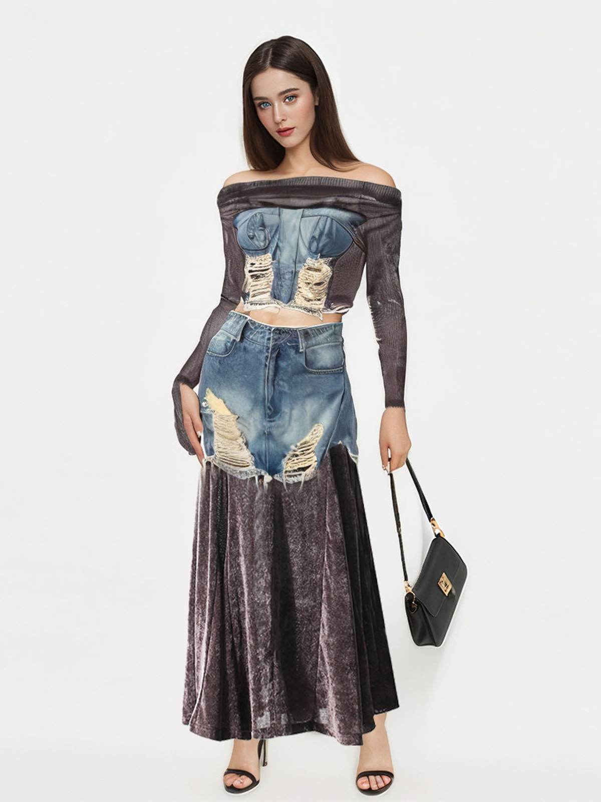 빈티지 데님 스티칭 폐허가 된 오프 숄더 골든 벨벳 긴팔 여성 핫 걸스 Navel Bottoming 탑 스커트 세트스토어 가기