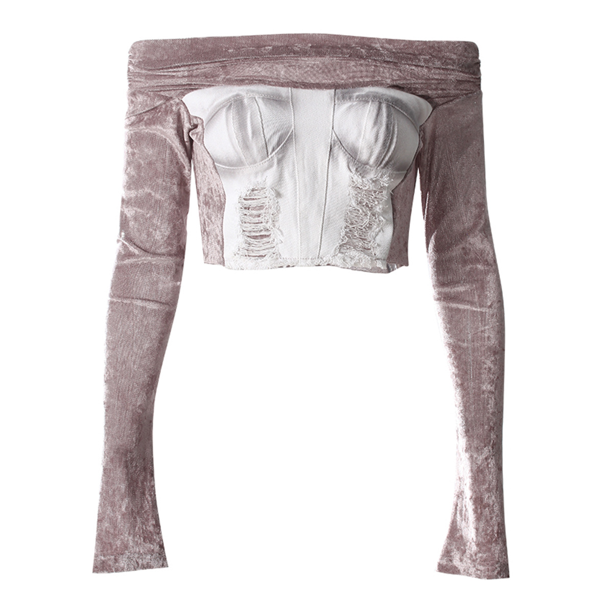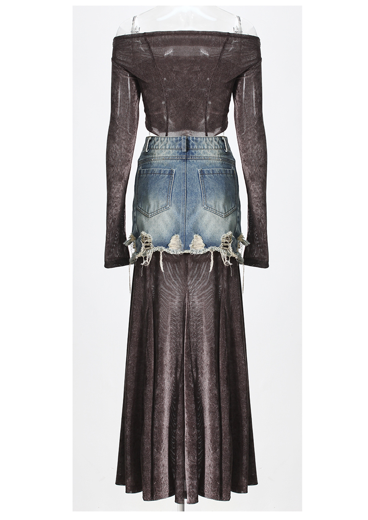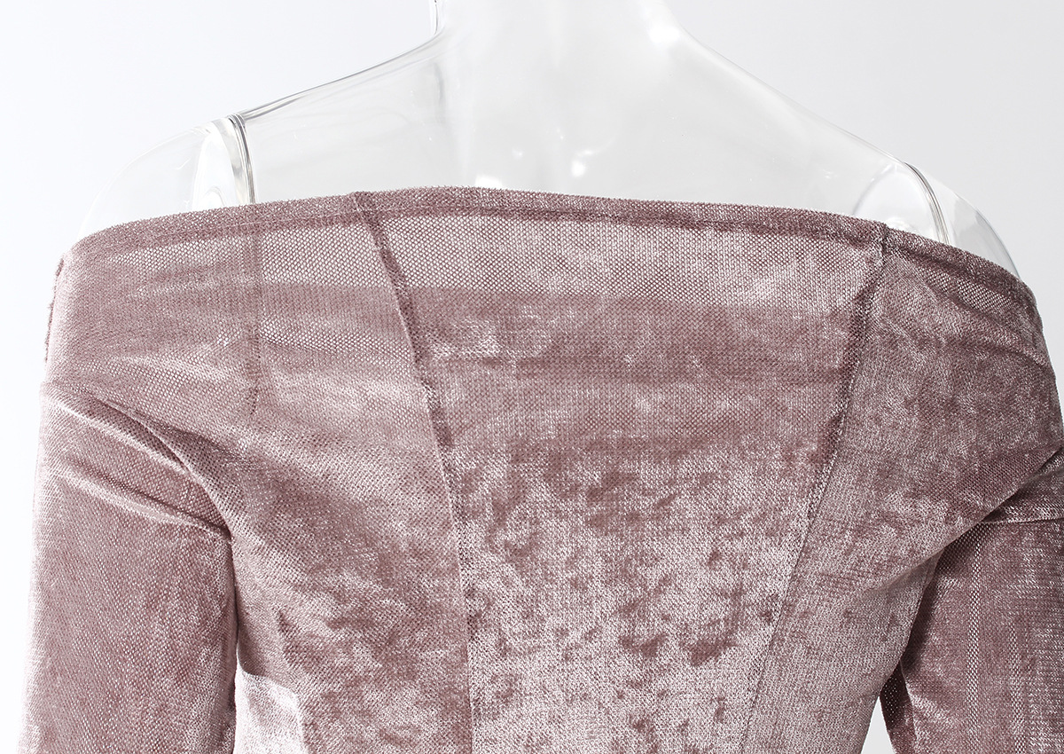 빈티지 데님 스티칭 폐허가 된 오프 숄더 골든 벨벳 긴팔 여성 핫 걸스 Navel Bottoming 탑 스커트 세트