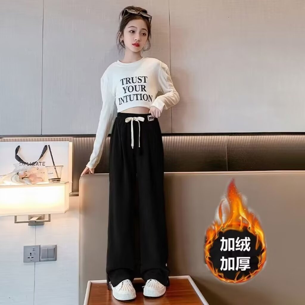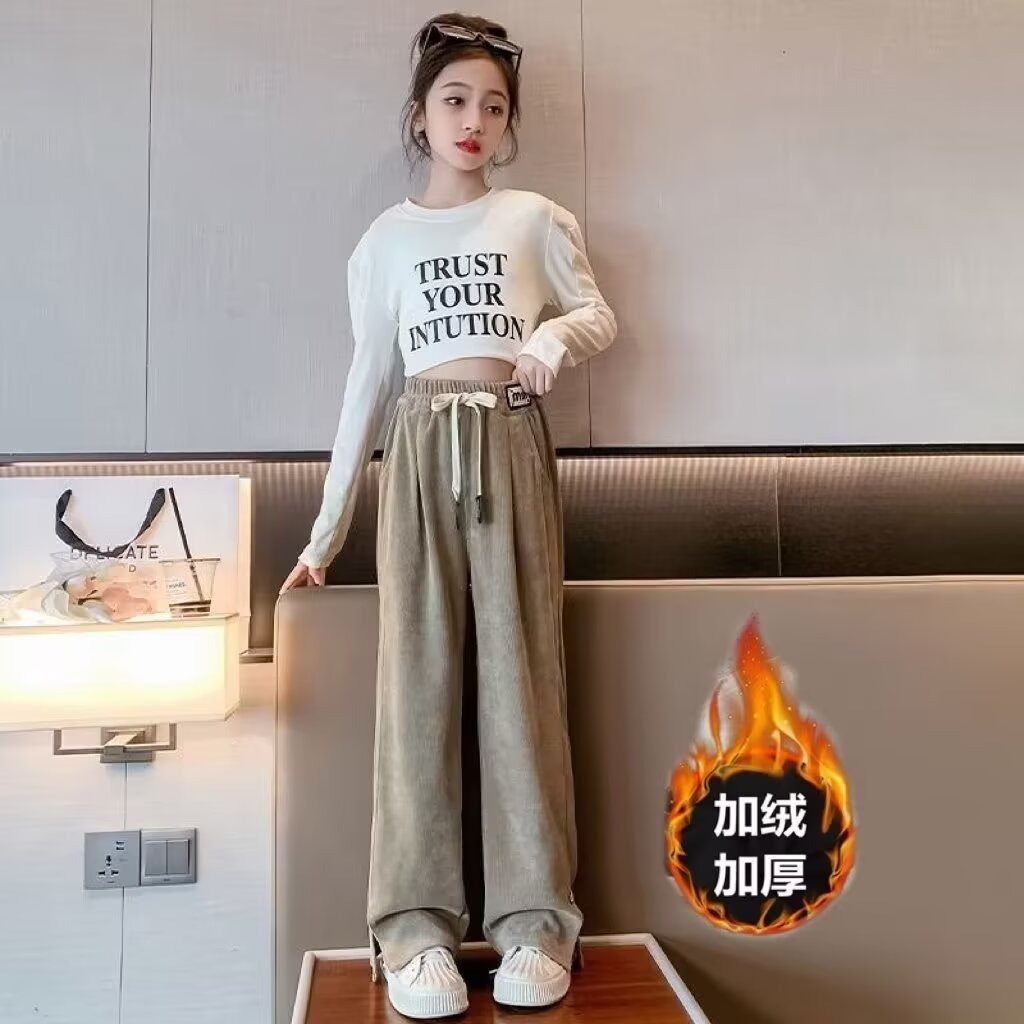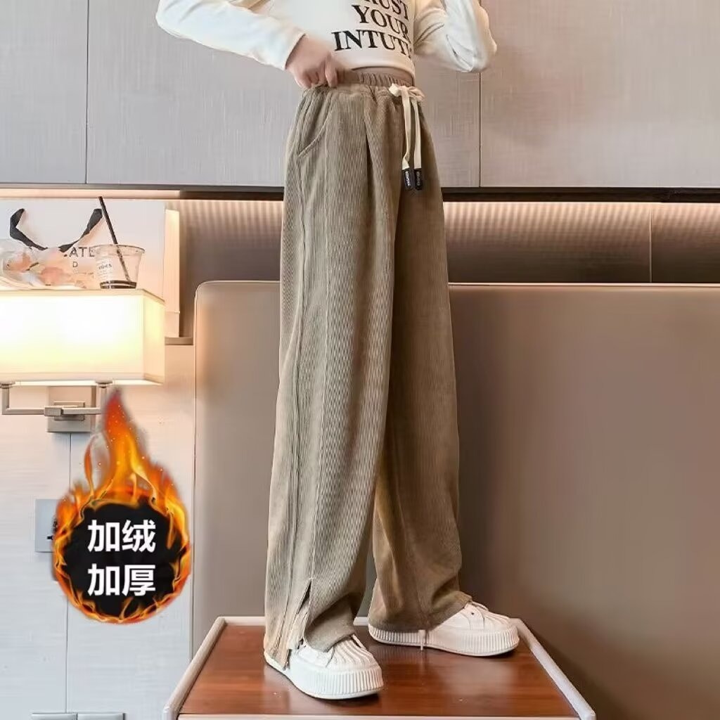 소녀 기모 바지 가을 겨울 2024 새로운 대형 어린이 통합 양털 와이드 다리 바지 어린이 겨울 분할 스트레이트 바지스토어 가기